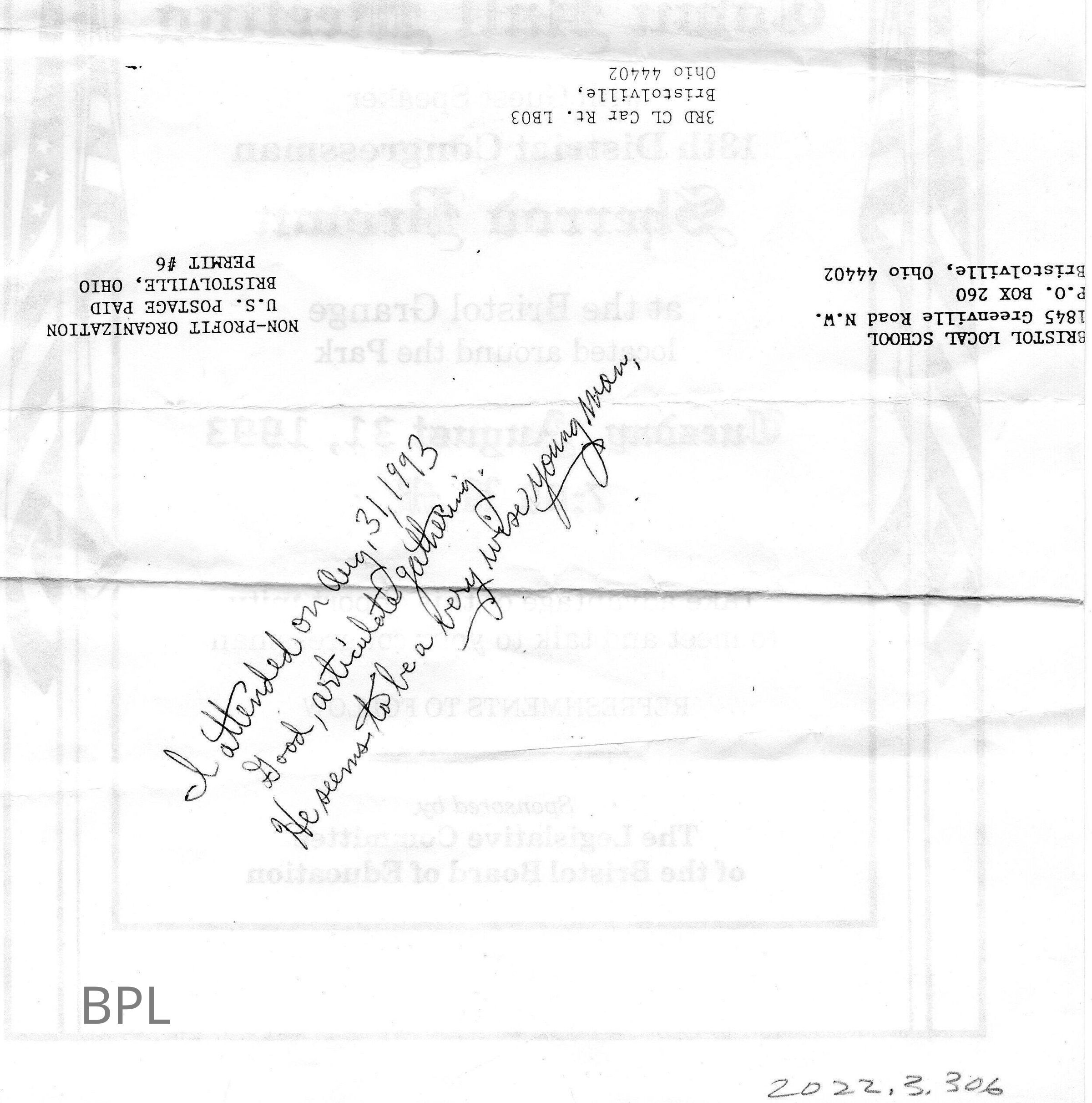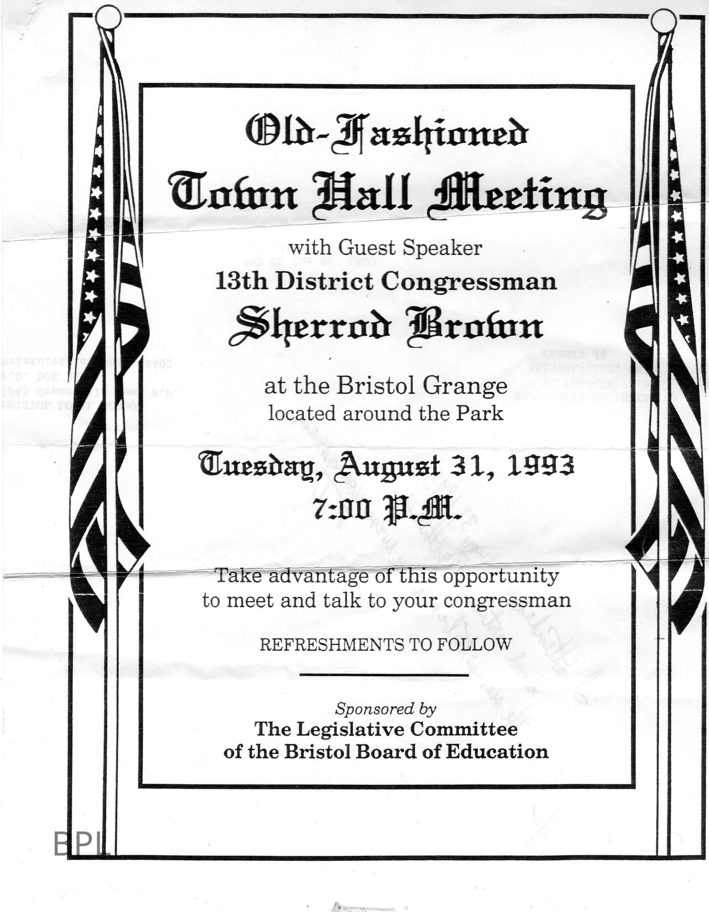 Notice of Bristol Town Hall meeting with Sherrod Brown, 13th District Congressman, August 31, 1993Cataloged By