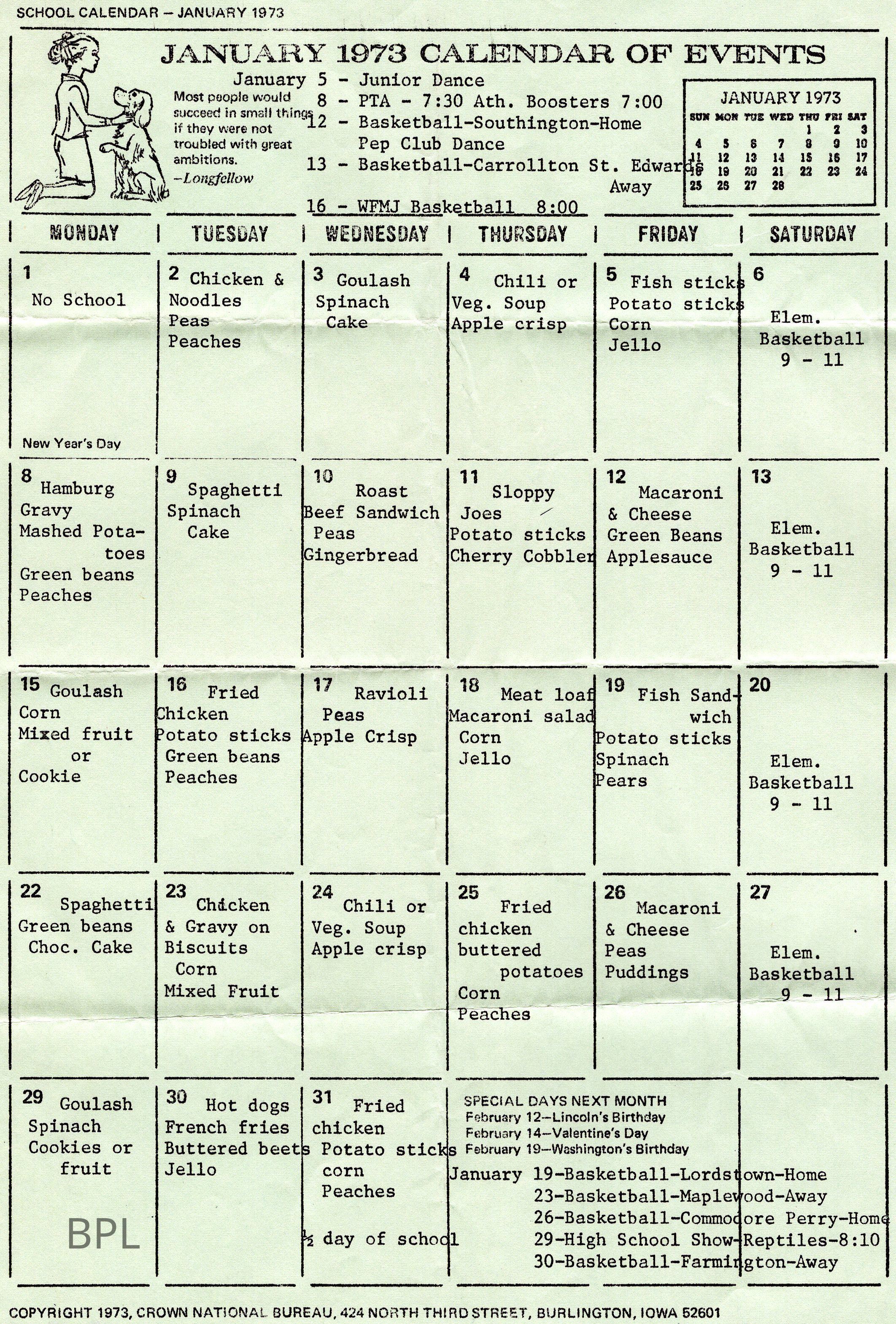 Bristol School Calendar of Events and Lunches for January 1973Cataloged By