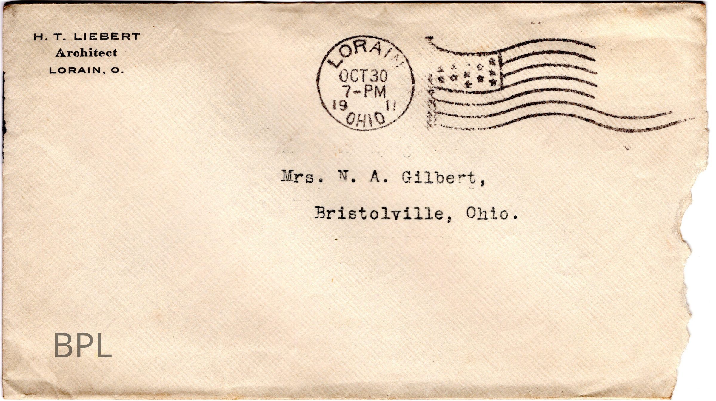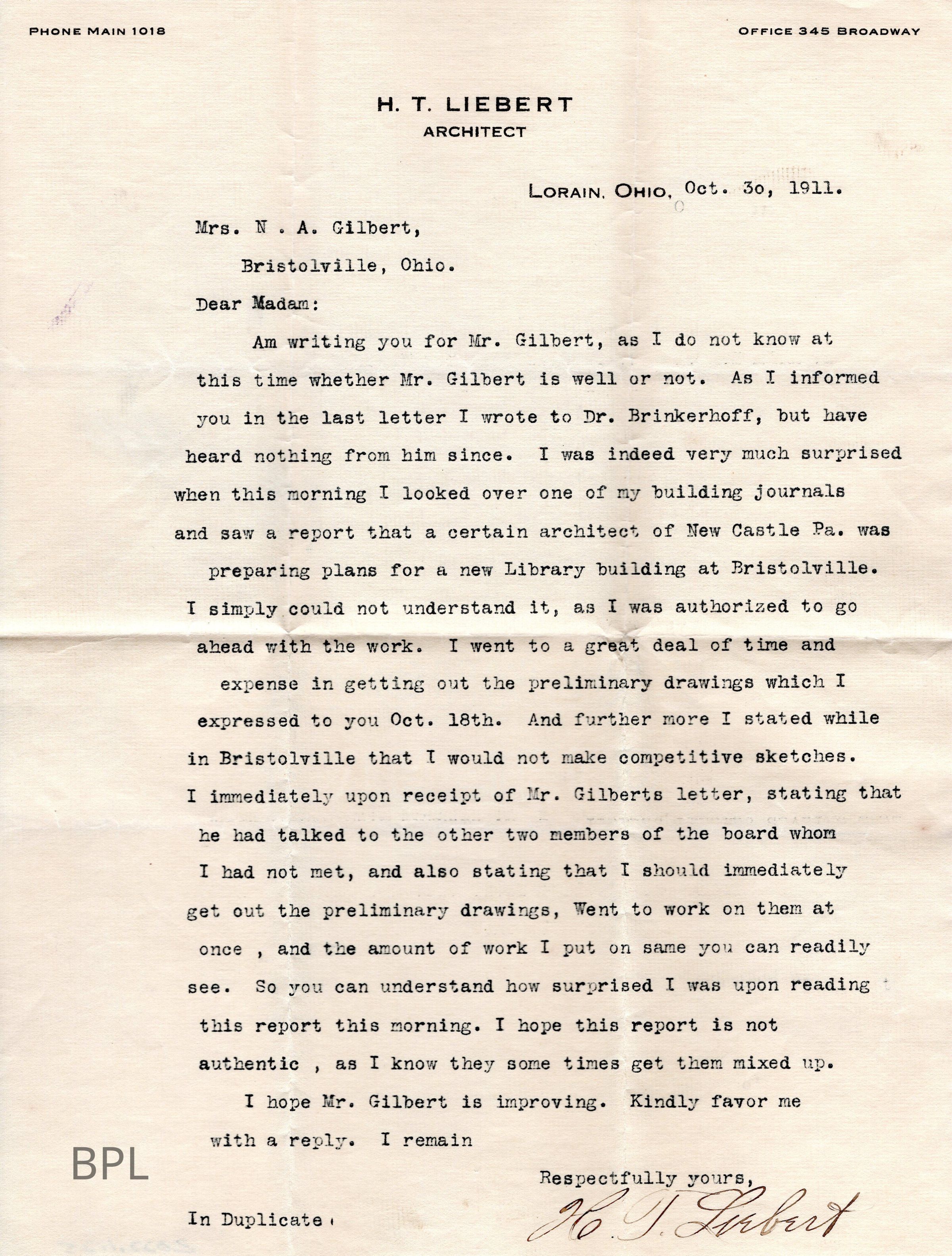 Letter to Mrs. N. A. Gilbert from H. T. Liebert, an architect from Lorain OH, regarding the selection of another architect from New Castle PA instead of himself; addressed to Mrs. N. A. Gilbert due to Mr. Gilbert illness. October 30, 1911Cataloged By