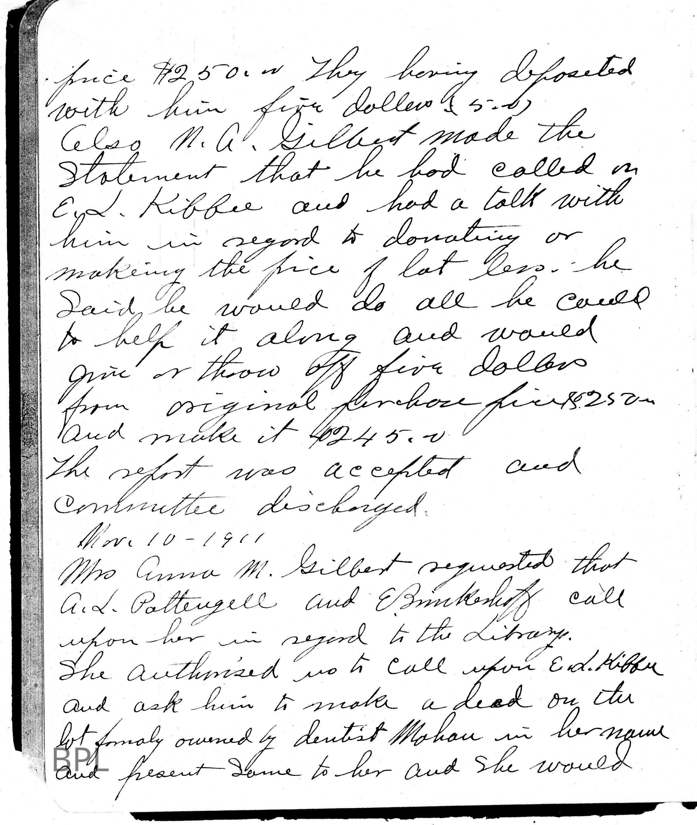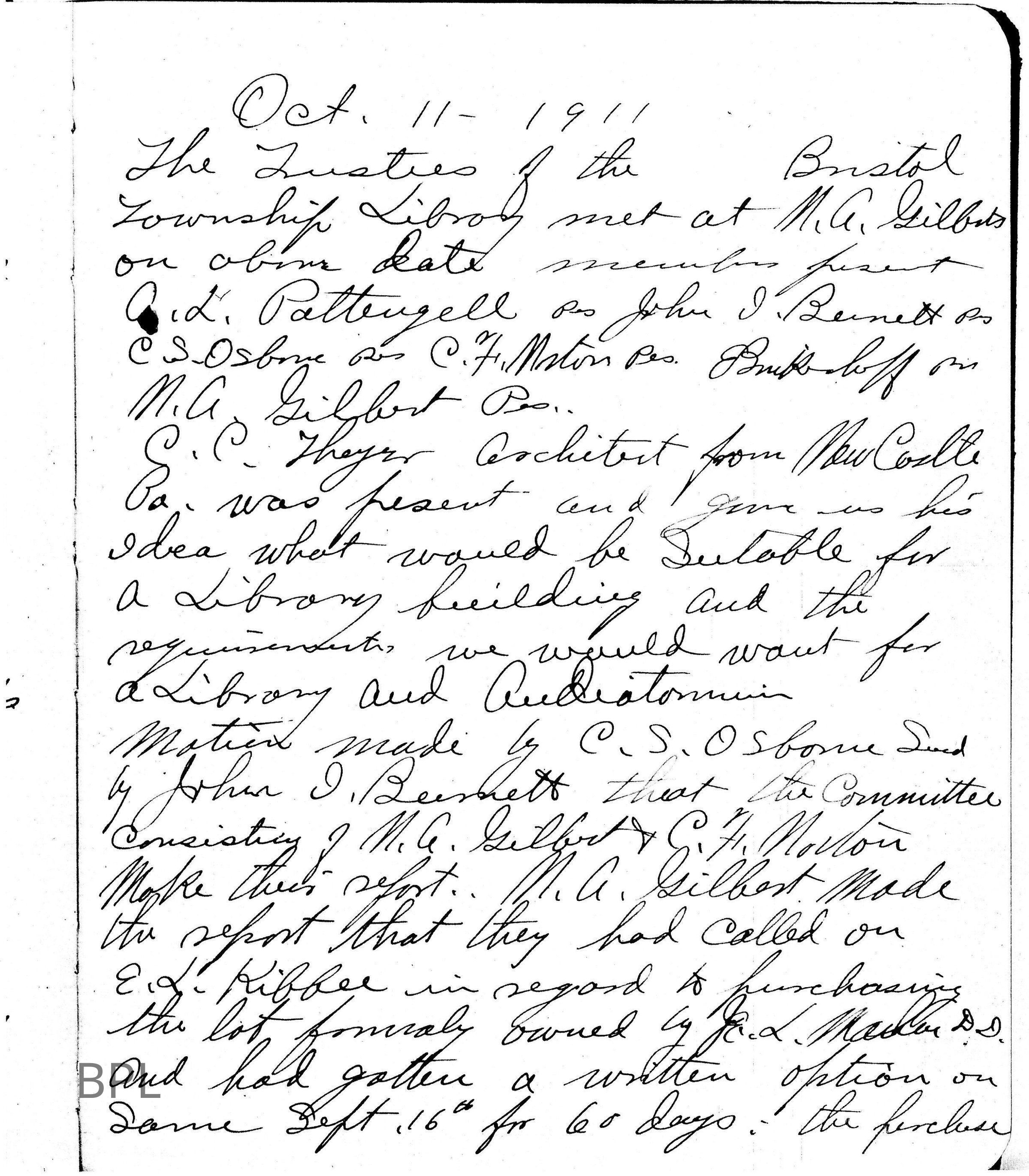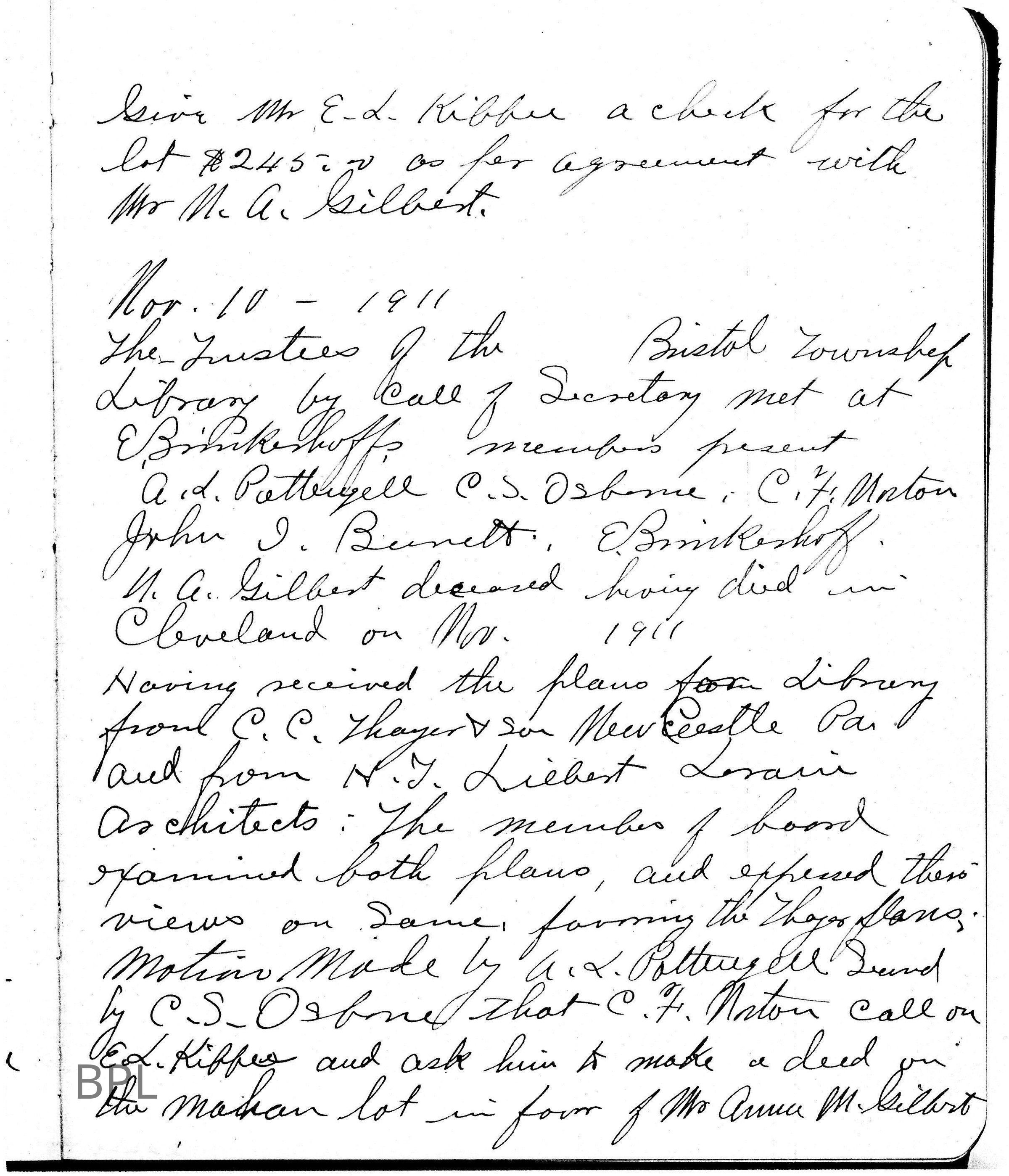 Library Board met with Thayer and Son architect of New Castle, Pennsylvania. The price of the land for library has been decreased to $245.00 by the owner, the offer was accepted. The death of Judge N. A. Gilbert is noted and grieved. October 11m 1911.Cataloged By