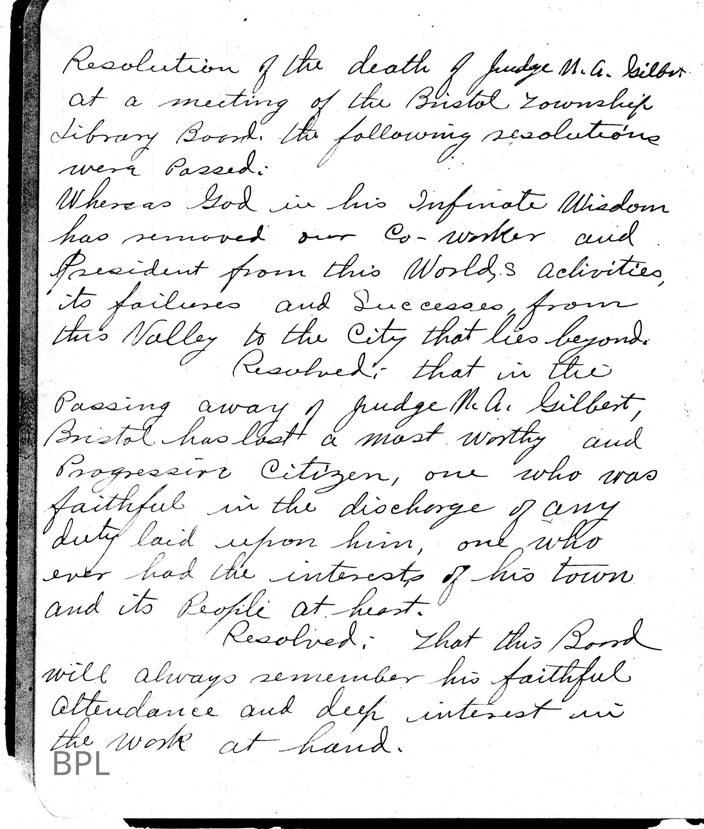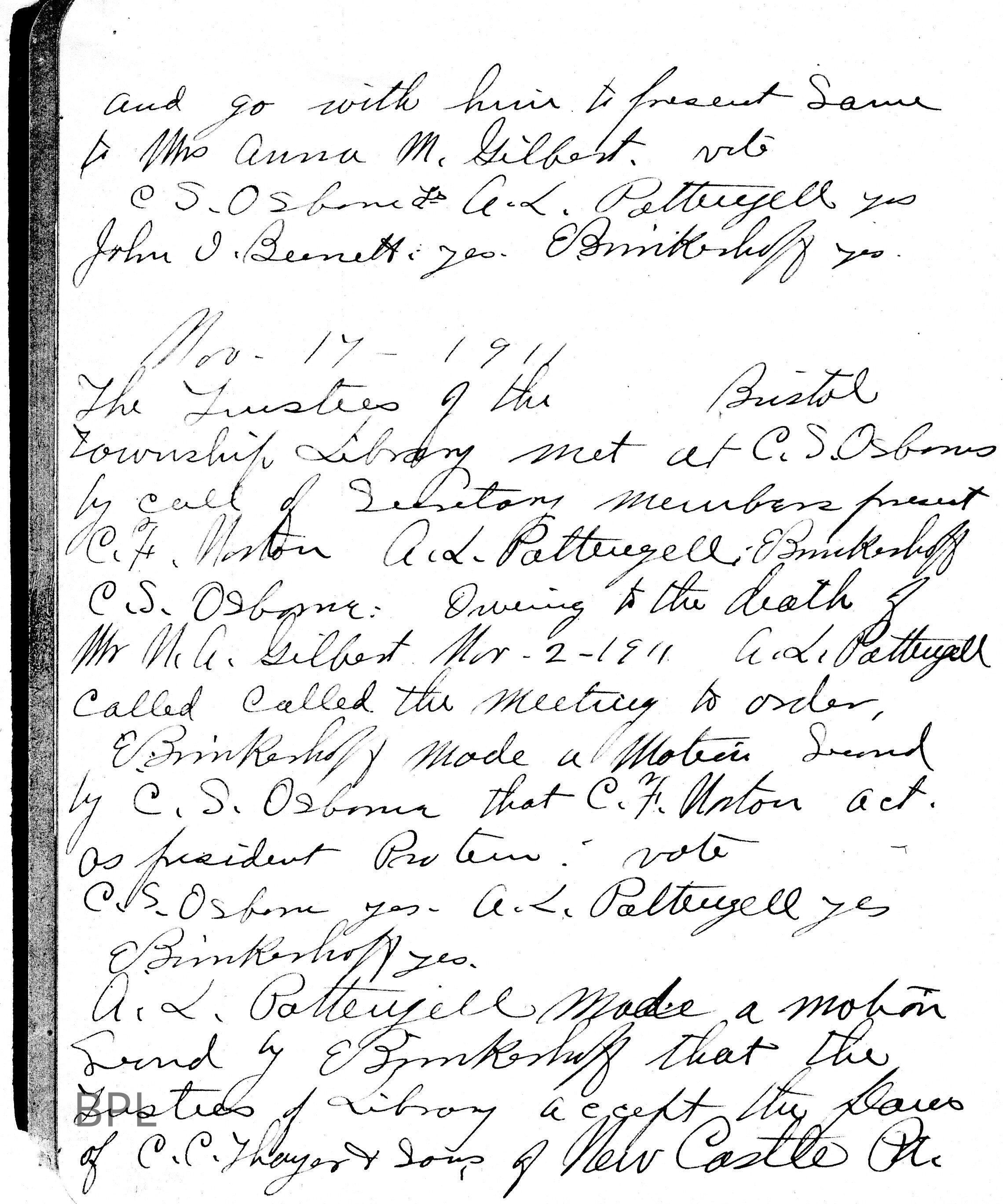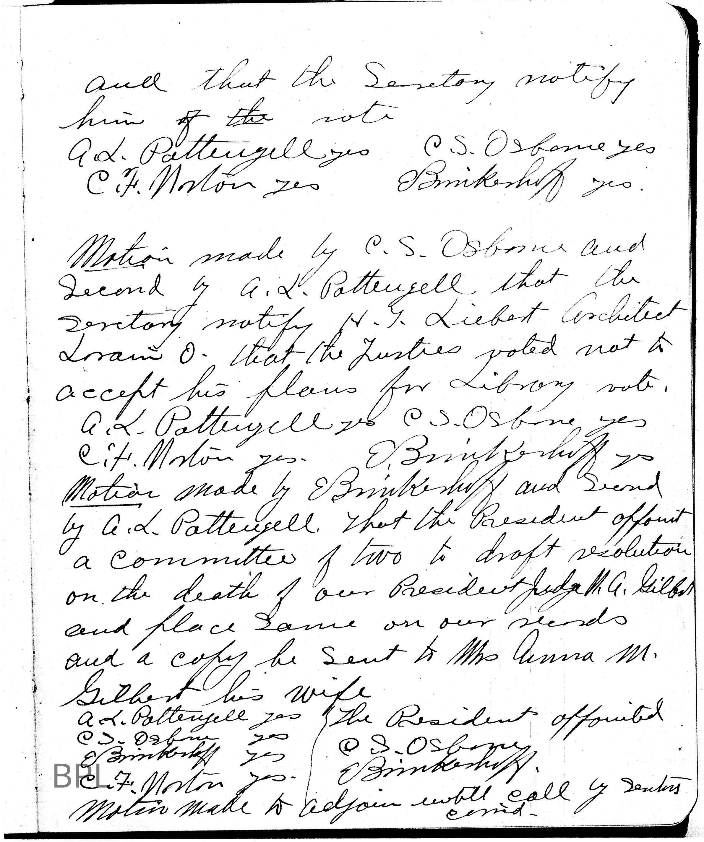 Library Board met with Thayer and Son architect of New Castle, Pennsylvania. The price of the land for library has been decreased to $245.00 by the owner, the offer was accepted. The death of Judge N. A. Gilbert is noted and grieved. October 11m 1911.Cataloged By