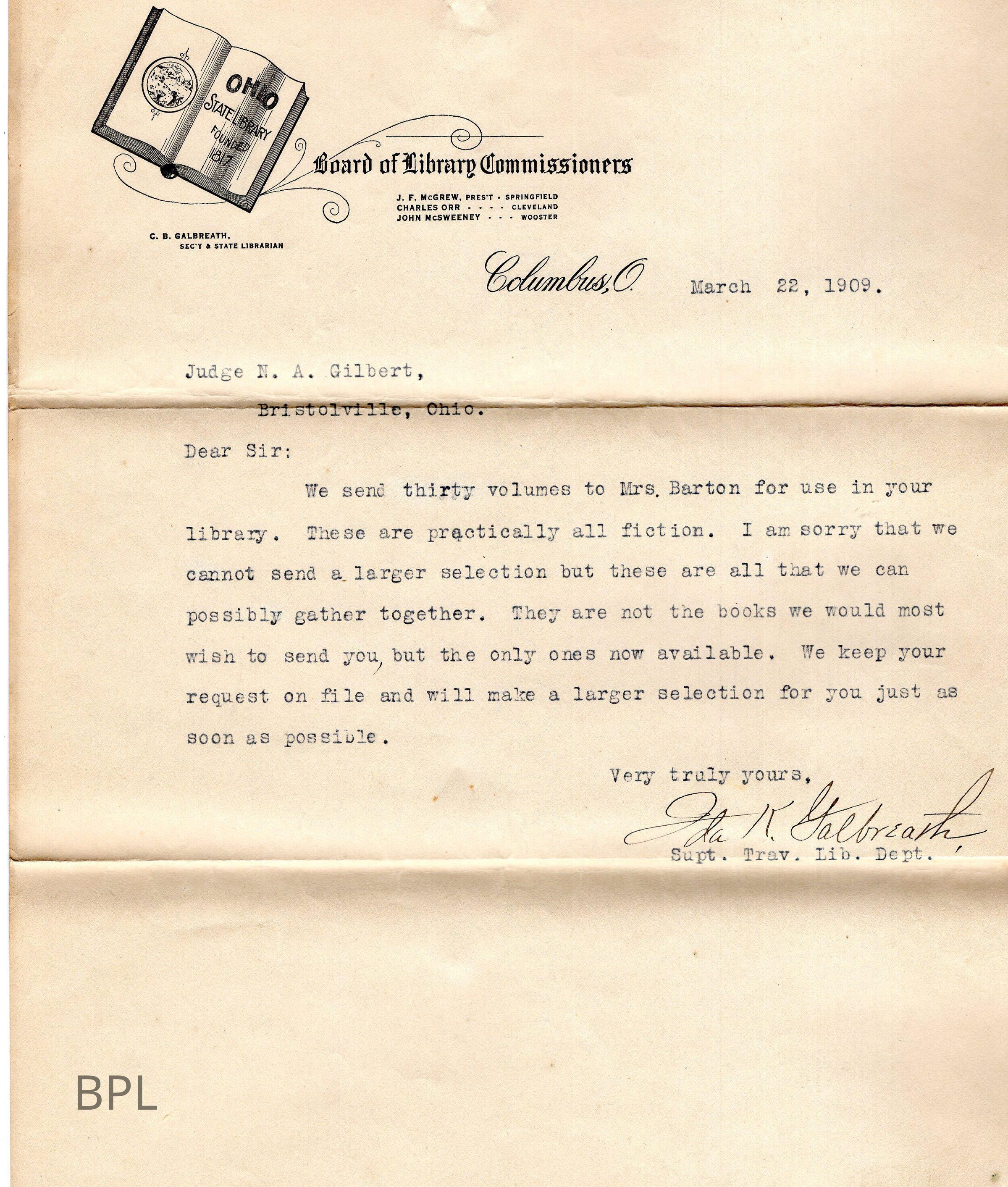Letter from Ida K Galbreath of Board of Library Commissioners to Judge N. A. Gilbert about sending 30 books, dated March 22, 1909.Cataloged By