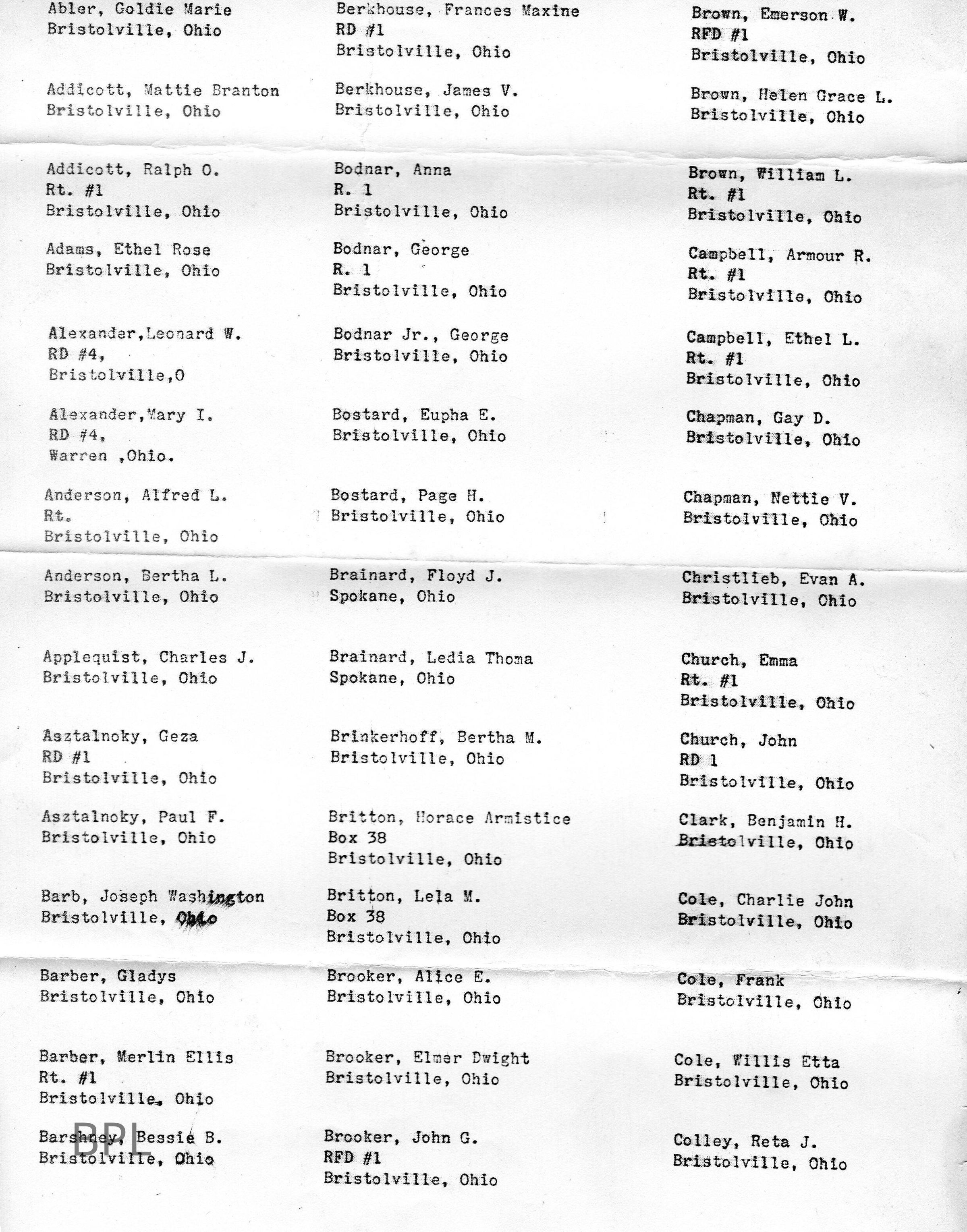 Voting List for Bristolville, Ohio, October 1951Cataloged By