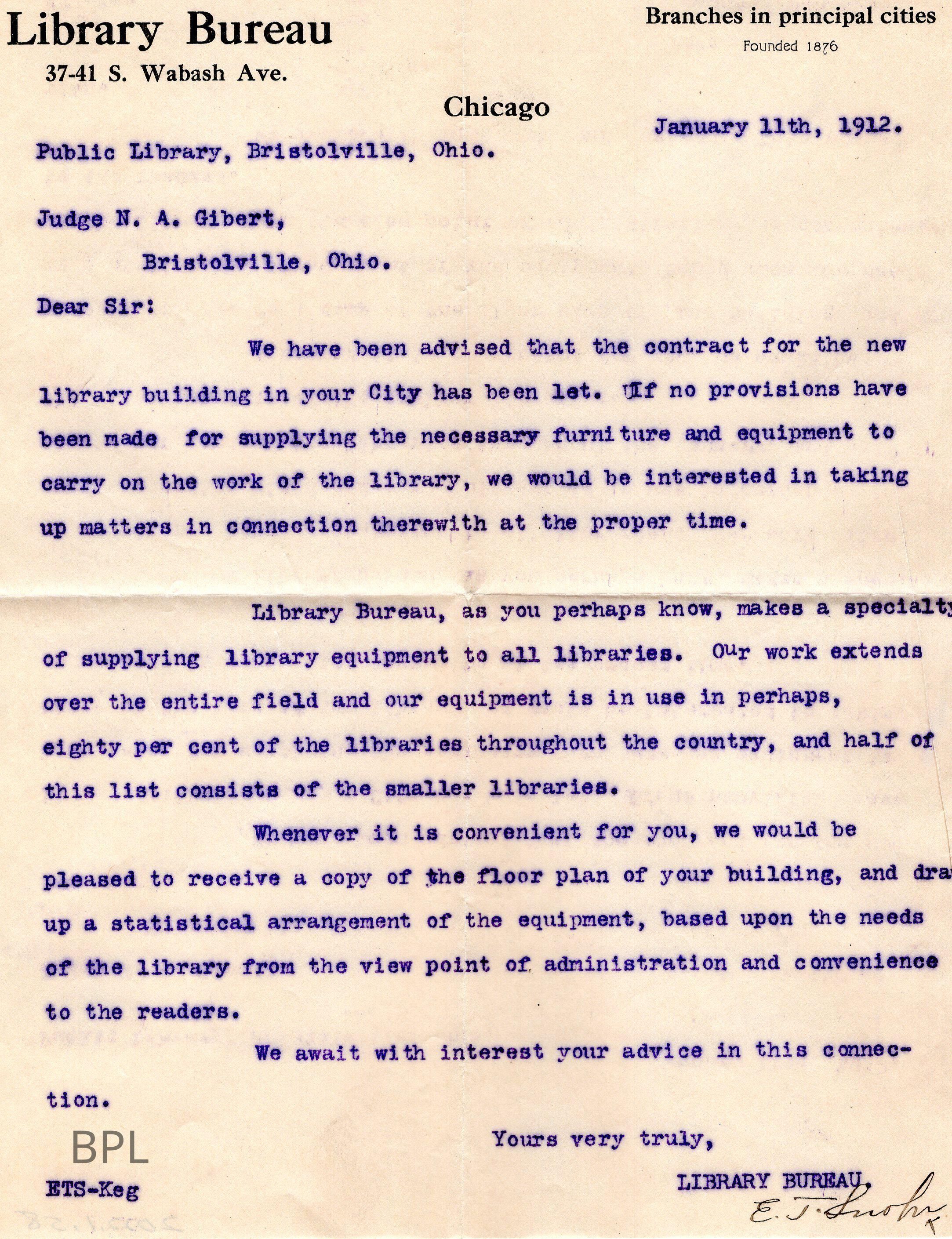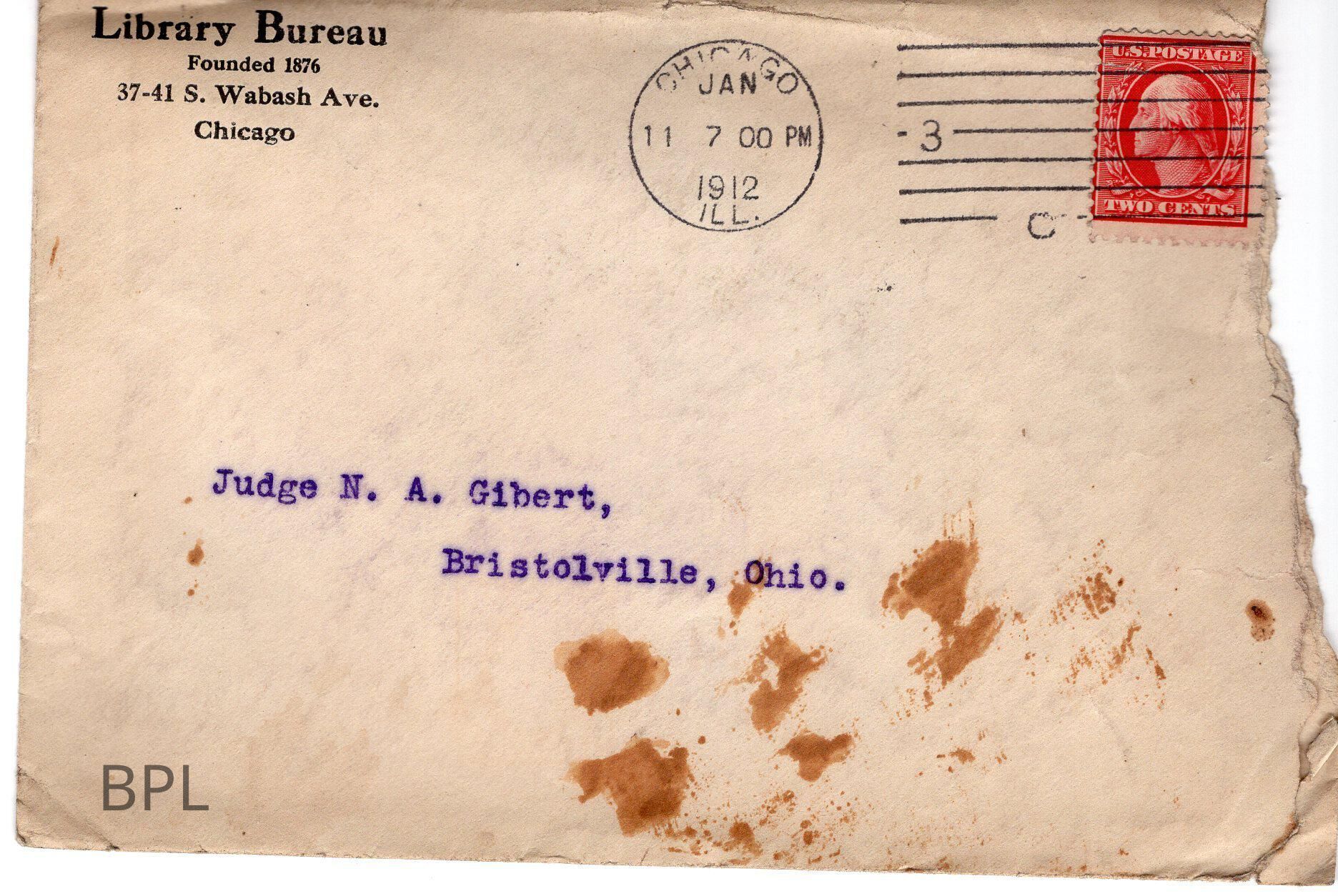 Envelope and letter to Judge N. A. Gilbert from Library Bureau of Chicago for supplying library furniture and equipmentCataloged By