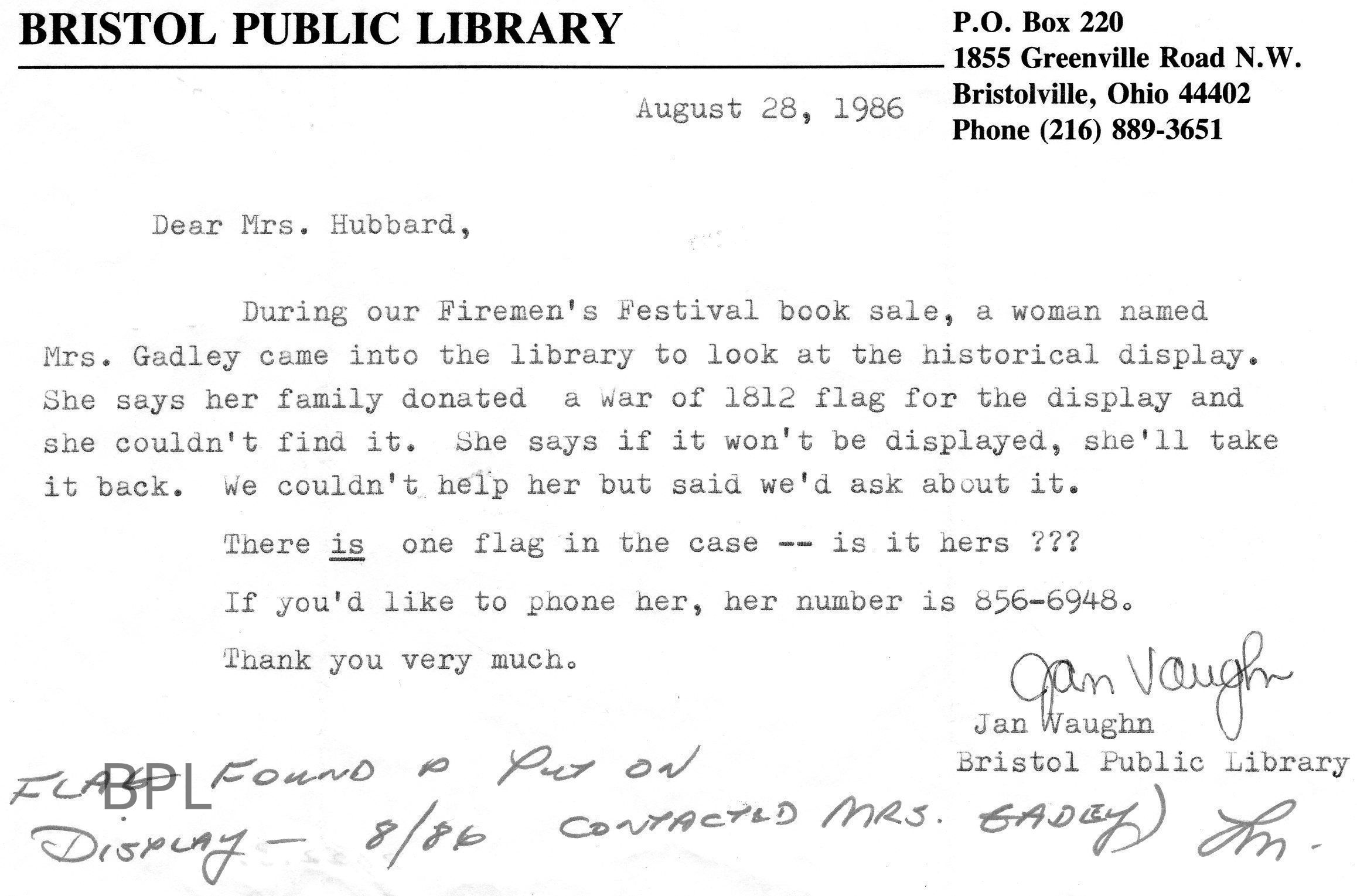 Note to Mrs. Hubbard from Jan Vaughn, Director of Bristol Public Library August 28, 1986, regarding 1812 American Flag Donation. Flag in Display CaseCataloged By