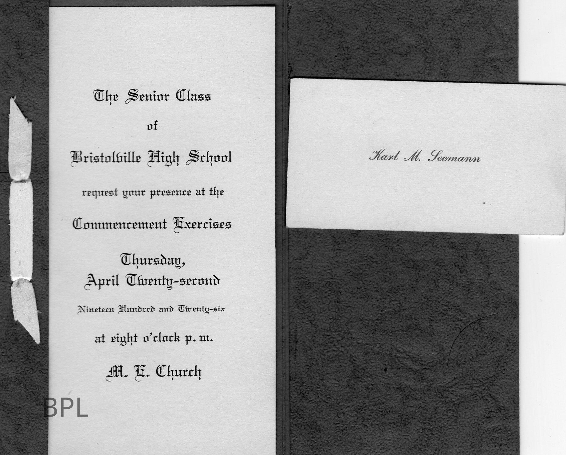 Graduation invitation of class of 1926 Bristol High School, Bristolville, Ohio of Karl M SeemannCataloged By