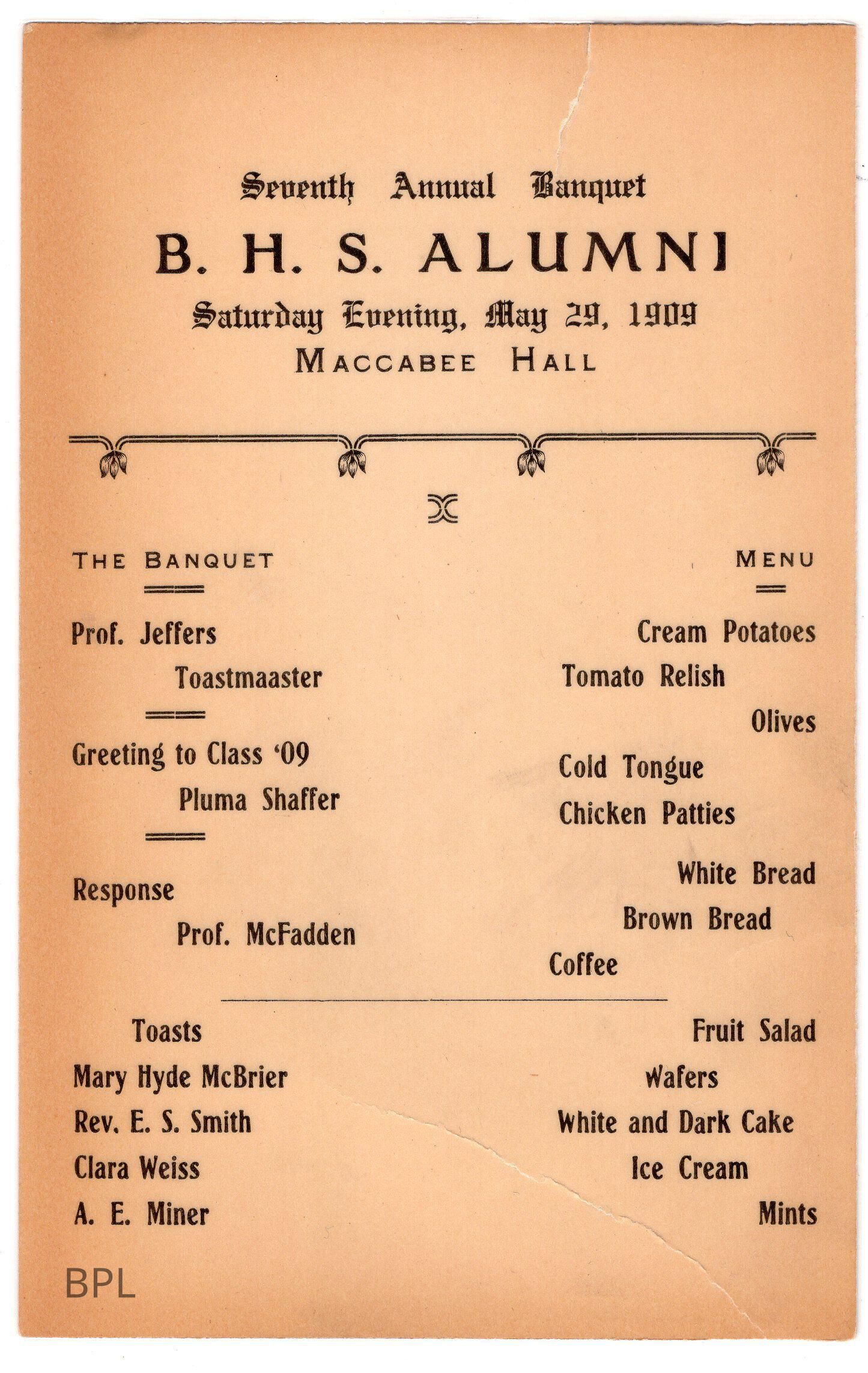 7th annual Bristol High School Alumni Banquet Program, May 29, 1909