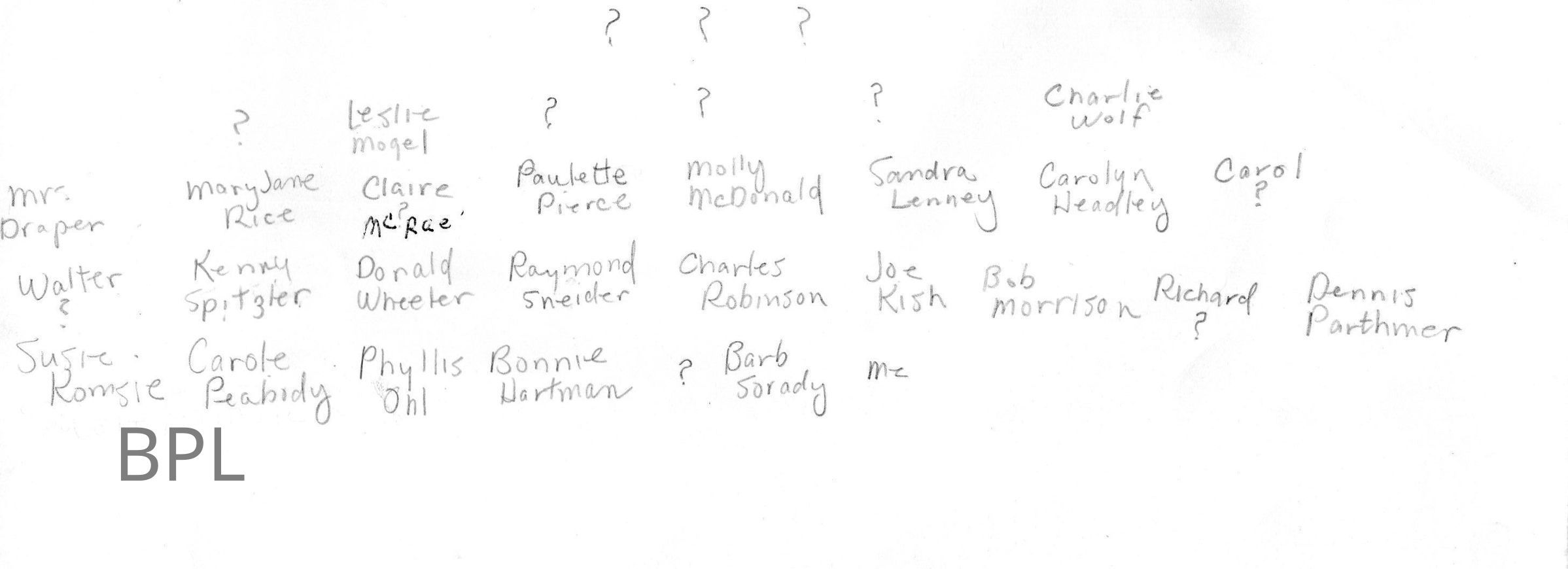 Oram, Joyce Seemann, Sorady, Barbara Eleanor, Hartman, Bonnie, Peabody, Carol, Komsie, Suzanne, Parthemer, Dennis, Morrison, Robert, Kish, Joe, Sneider, Raymond, Wheeler, Donald, Spitzler, Kenny, Headley, Carolyn Sue, Lenney, Sandra, McDonald, Mary Louise, Pierce, Paulette Sue, McRae, Claire, Rice, Mary Jane, Wolfe, Charlie, Mogel, Leslie, Mrs Draper