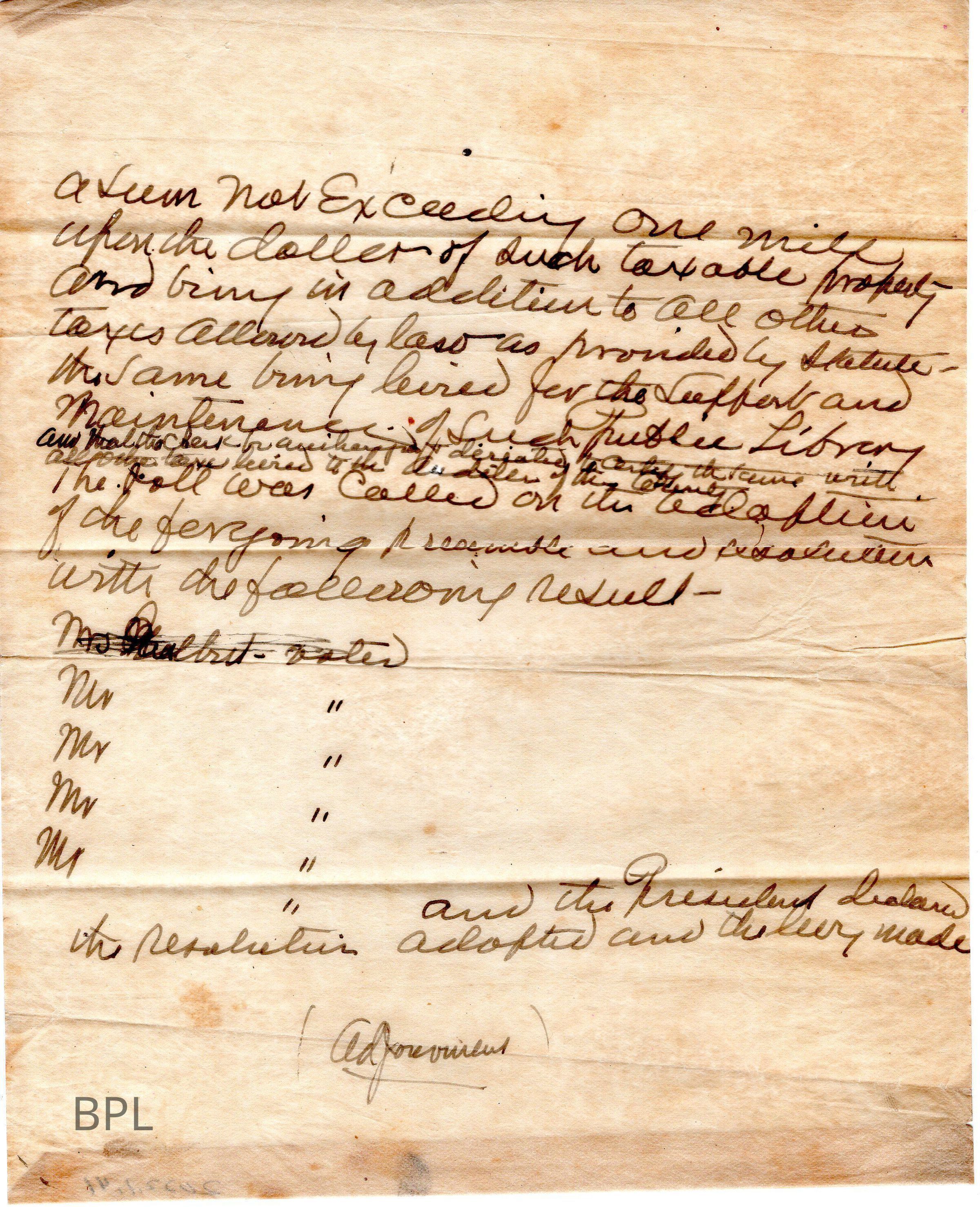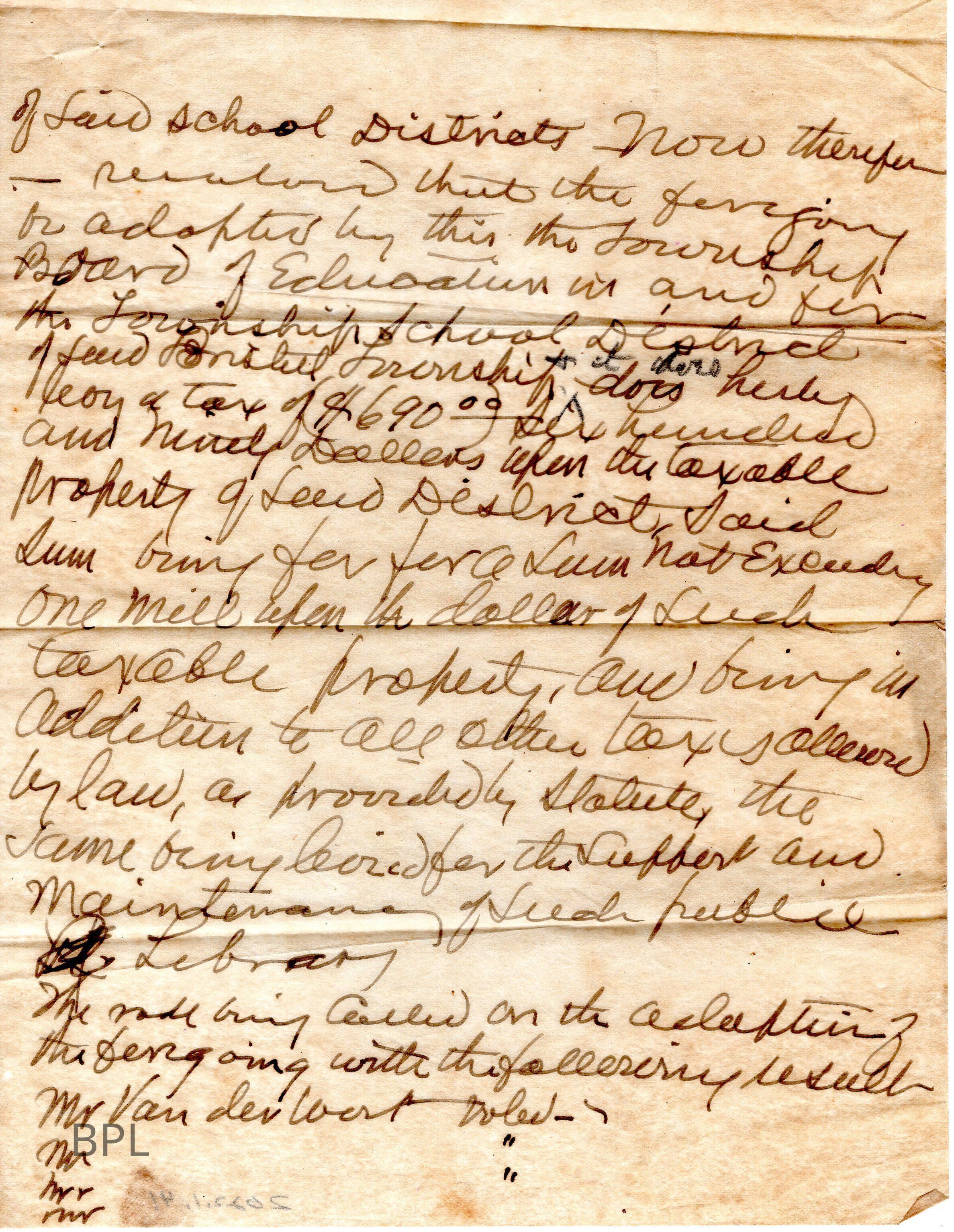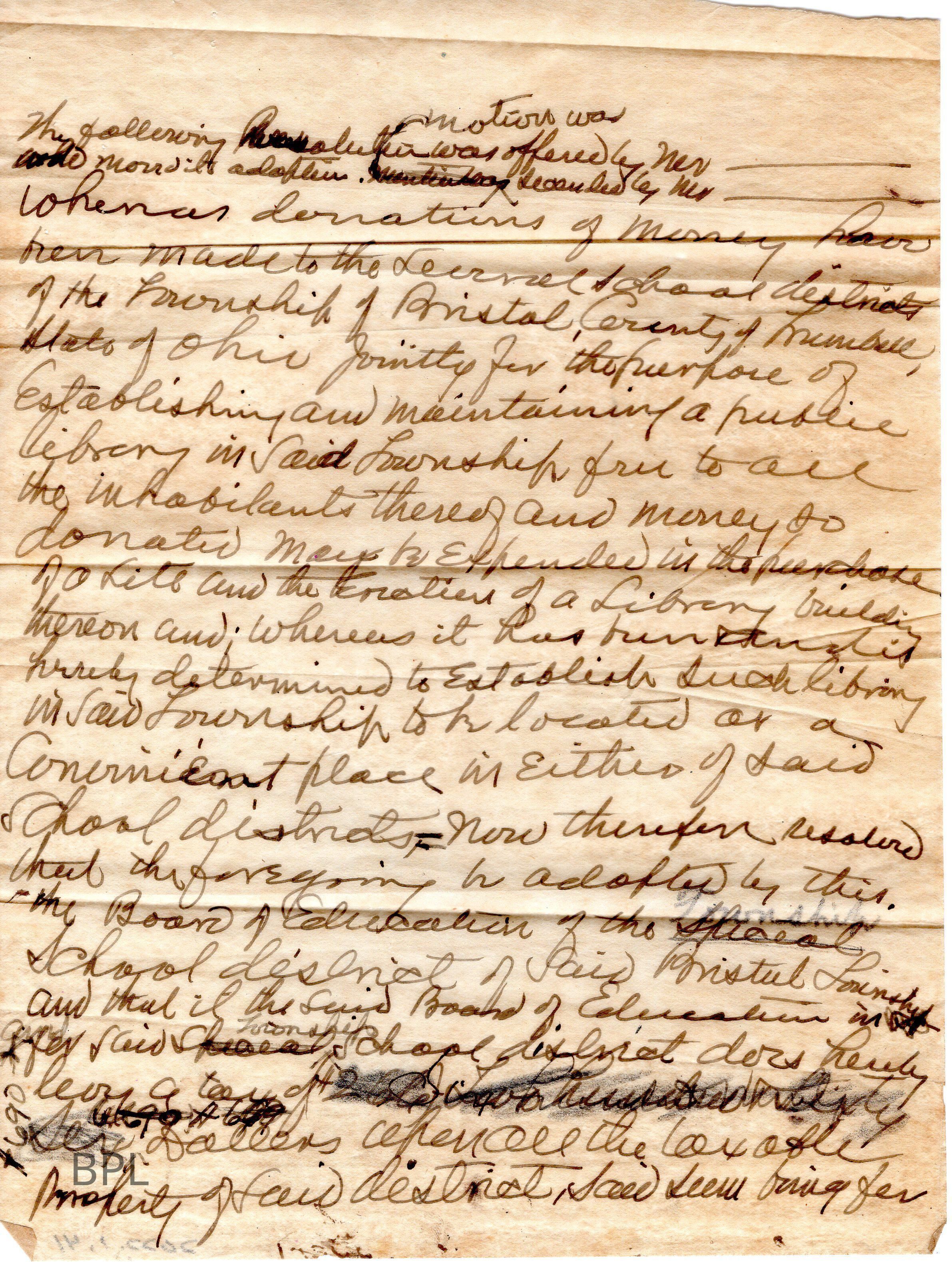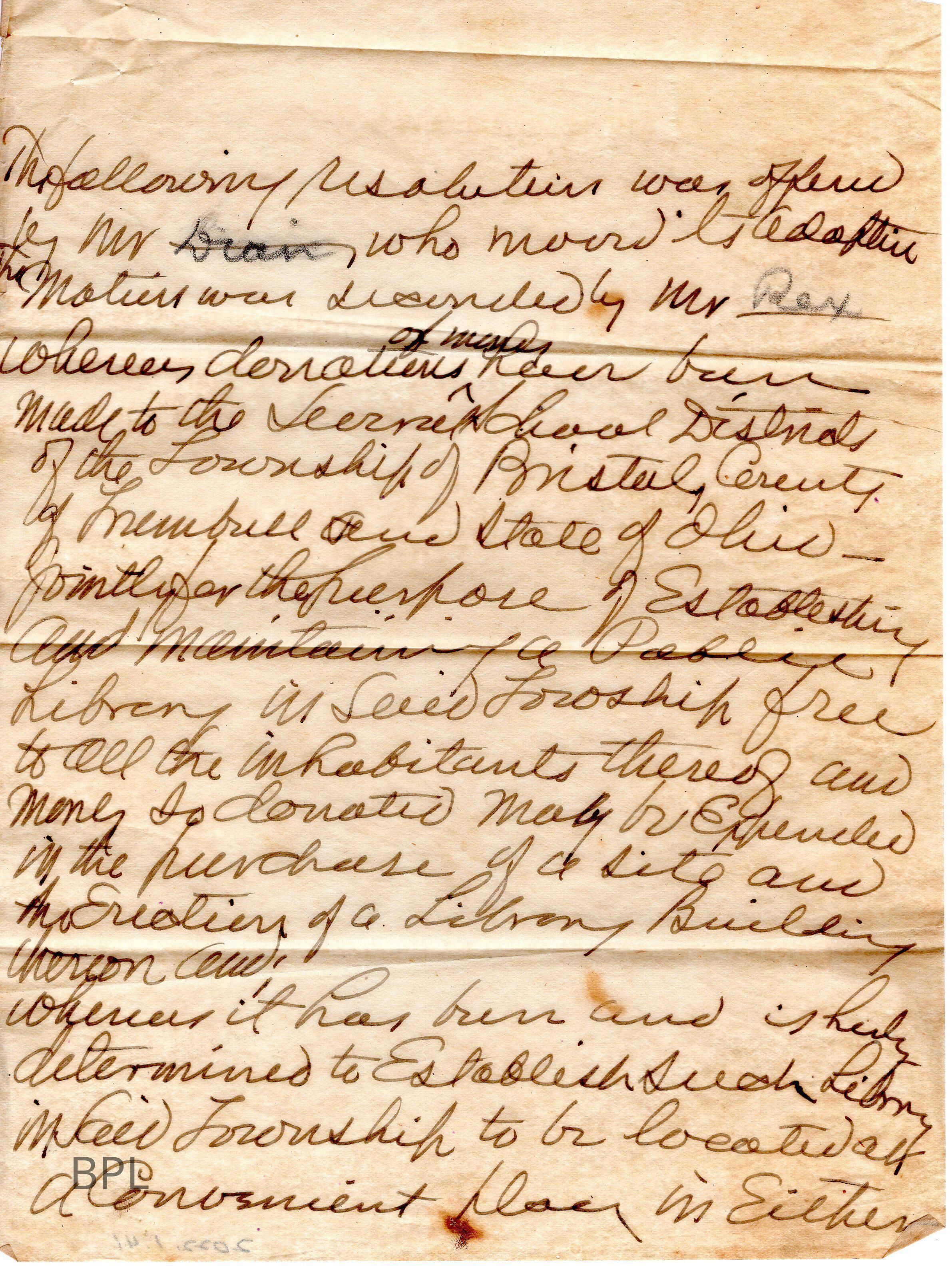 Resolution for donations of monies for establishing and maintaining library in Bristol TownshipCataloged By