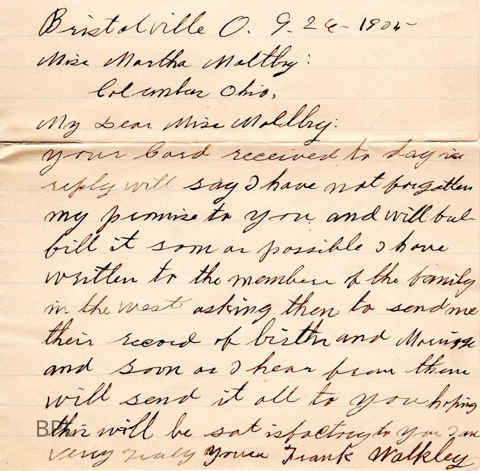 Letter, September 26, 1905, to Martha Maltby from Frank WalkleyCataloged By