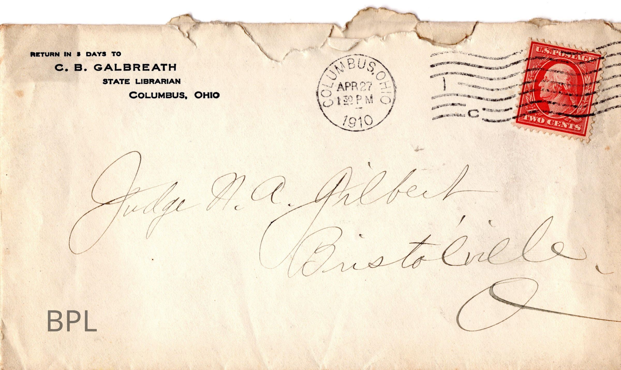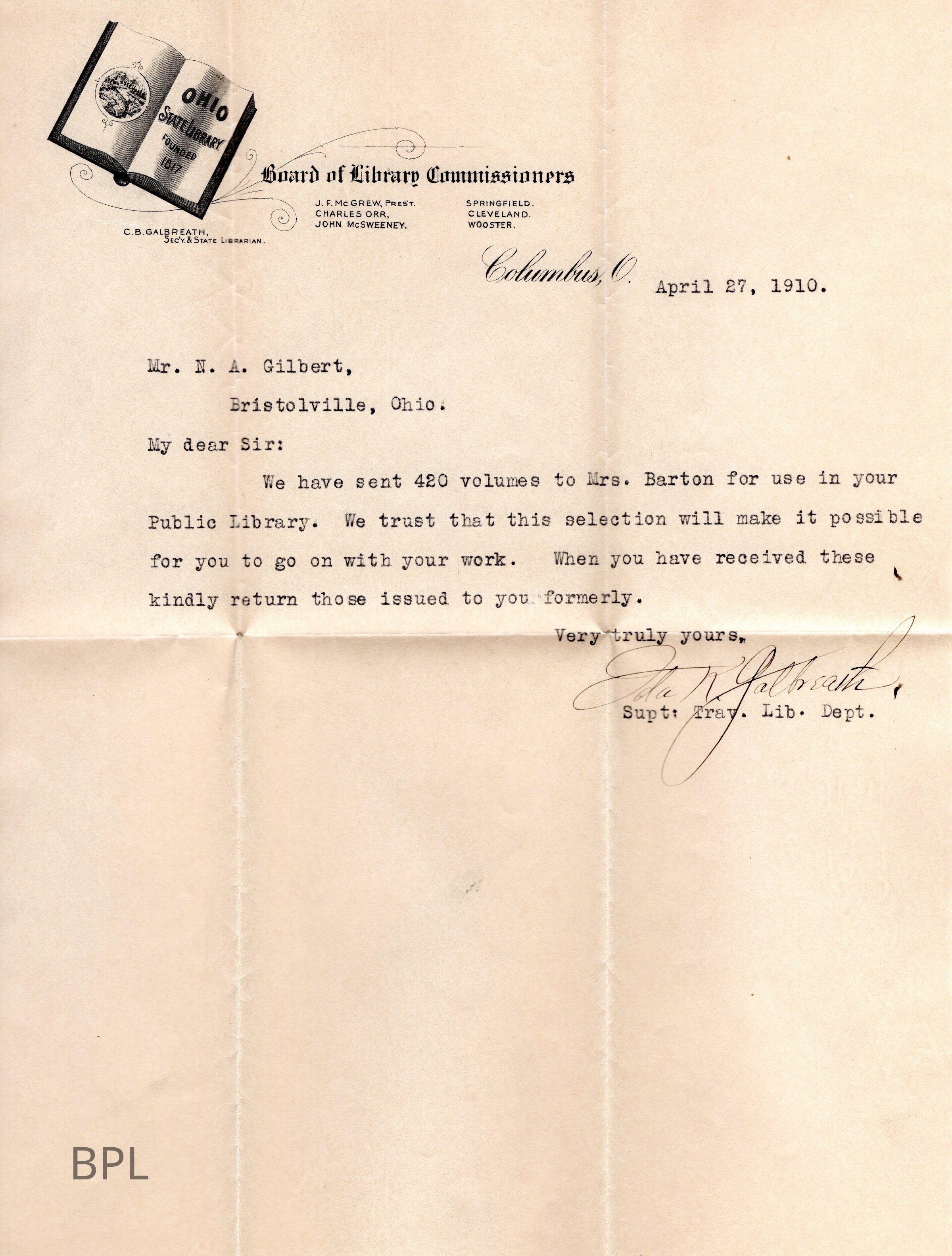 Letter to N.A. Gilbert from Ida K Galbreath of Board of Library Commissioners regarding 420 volumes of books April 27, 1910.Cataloged By