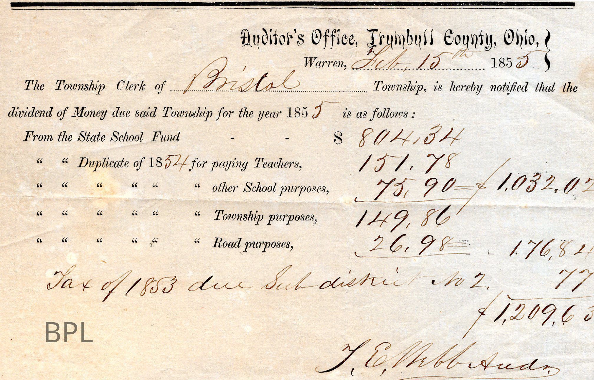 Statement from Trumbull County, Ohio Auditor's Office for Bristol Township, and Bristol School, February, 15 , 1855Cataloged By