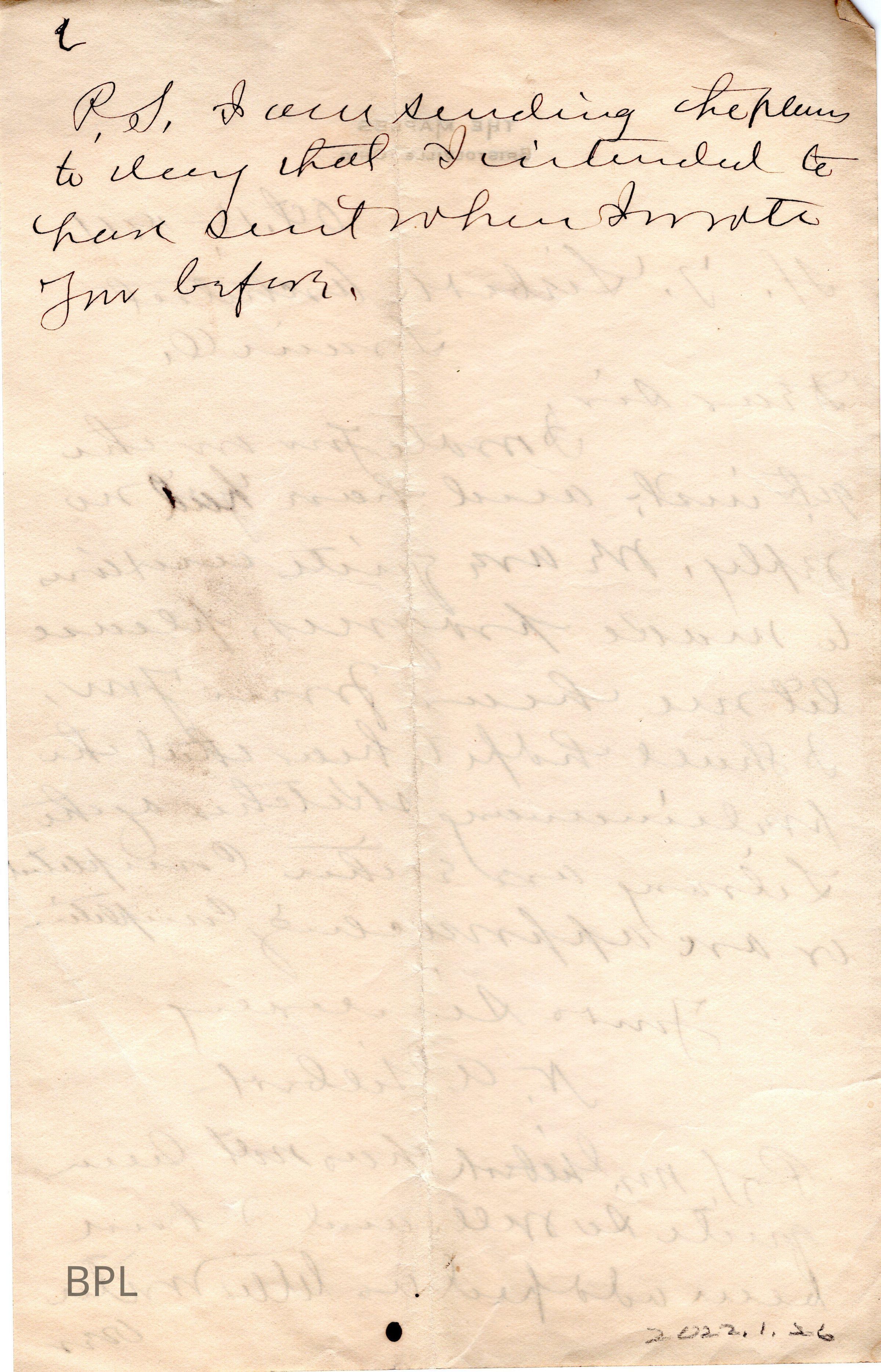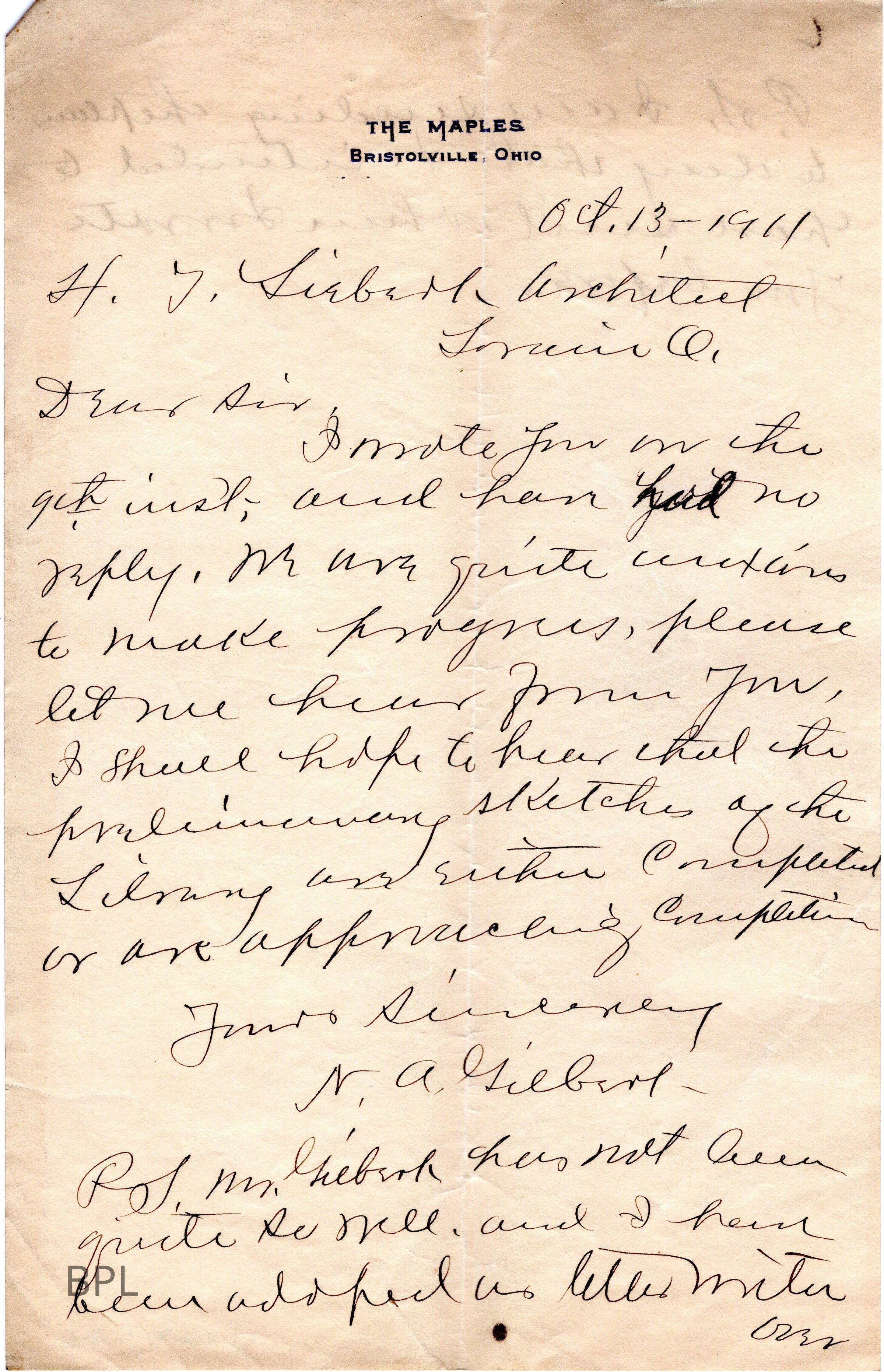 Handwritten letter from N. A. Gilbert to H. T. Liebert, an architect from Lorain Oh, asking for preliminary drawings for the Bristol Library October 13, 1911Cataloged By