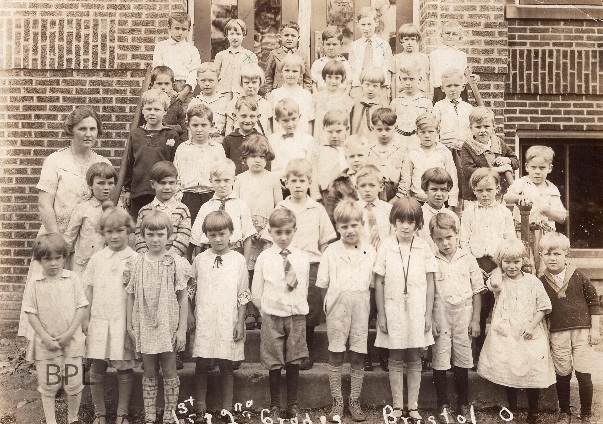 1st and 2ed grade class of Bristol School, Bristolville, Ohio. Note 2 Xs in back row marking Erma and Robert Matteson.Cataloged By