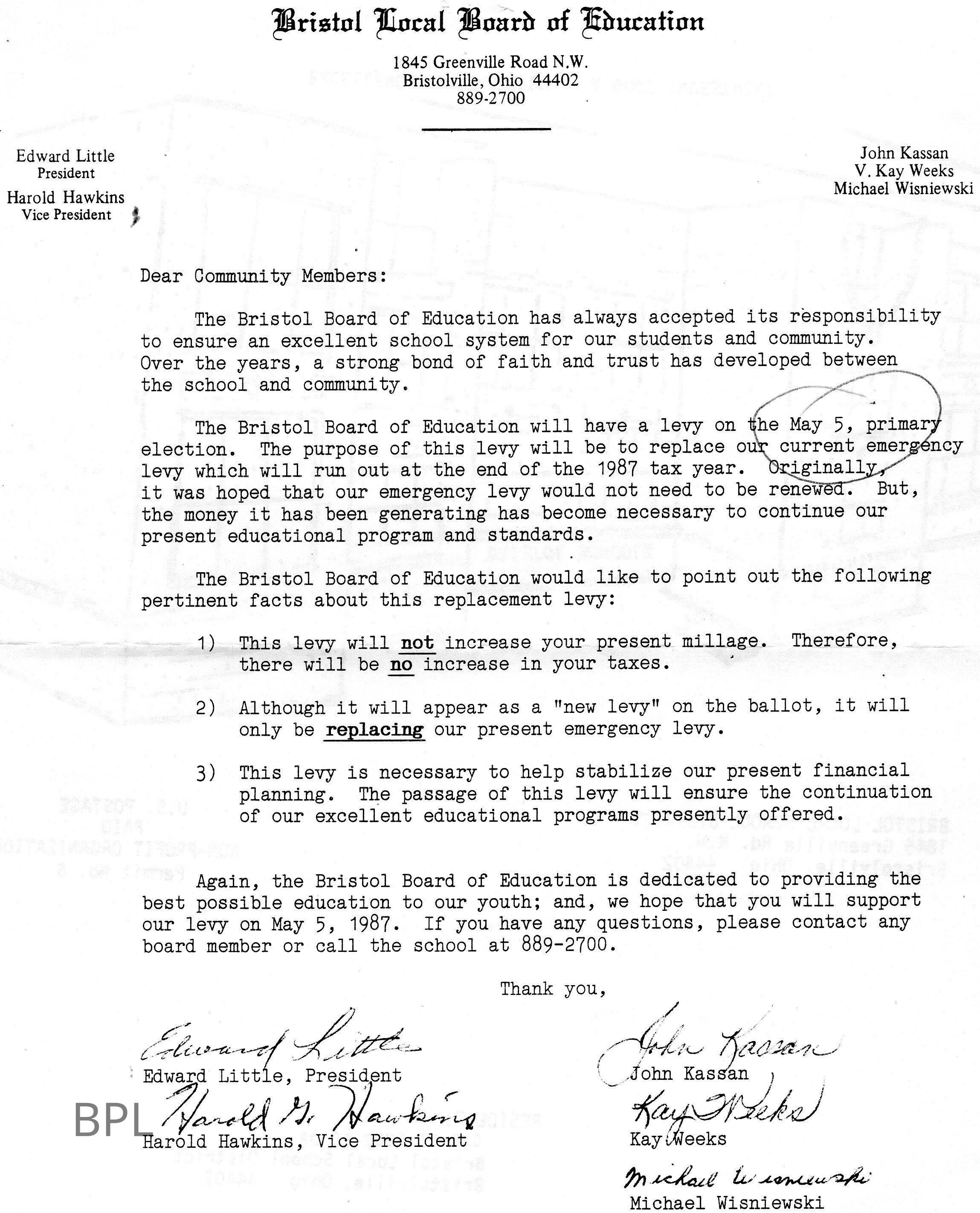 Bristol School Report with Board of Education letter to community regarding upcoming levy in May primary.