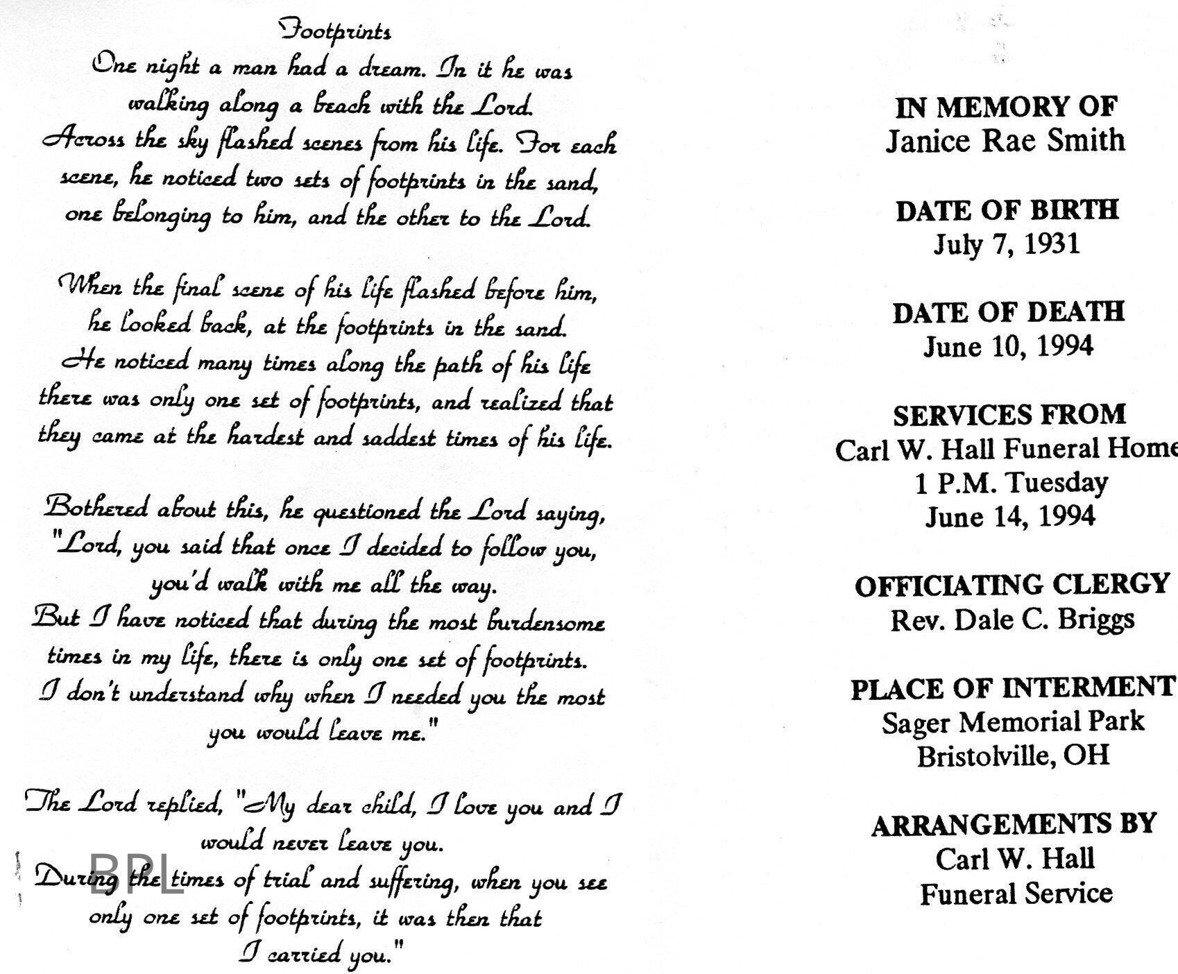 Memorial program for Janice Rae Smith, June 14, 1994Cataloged By