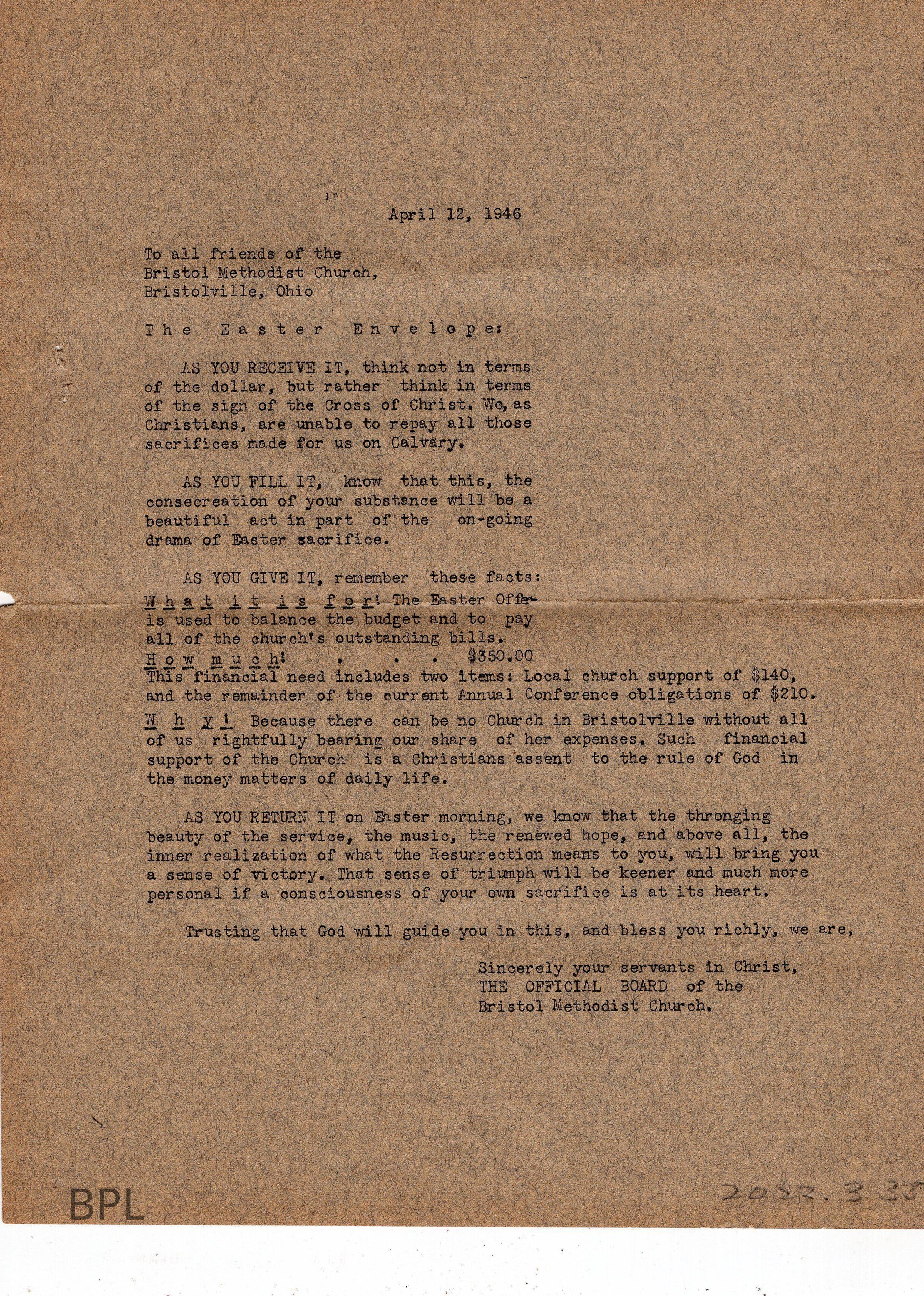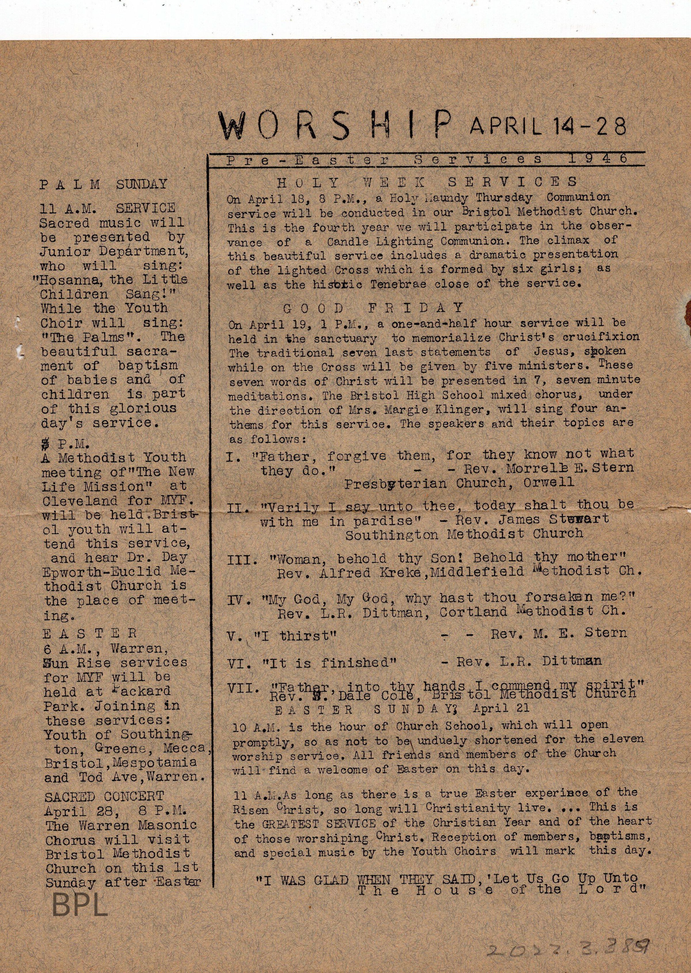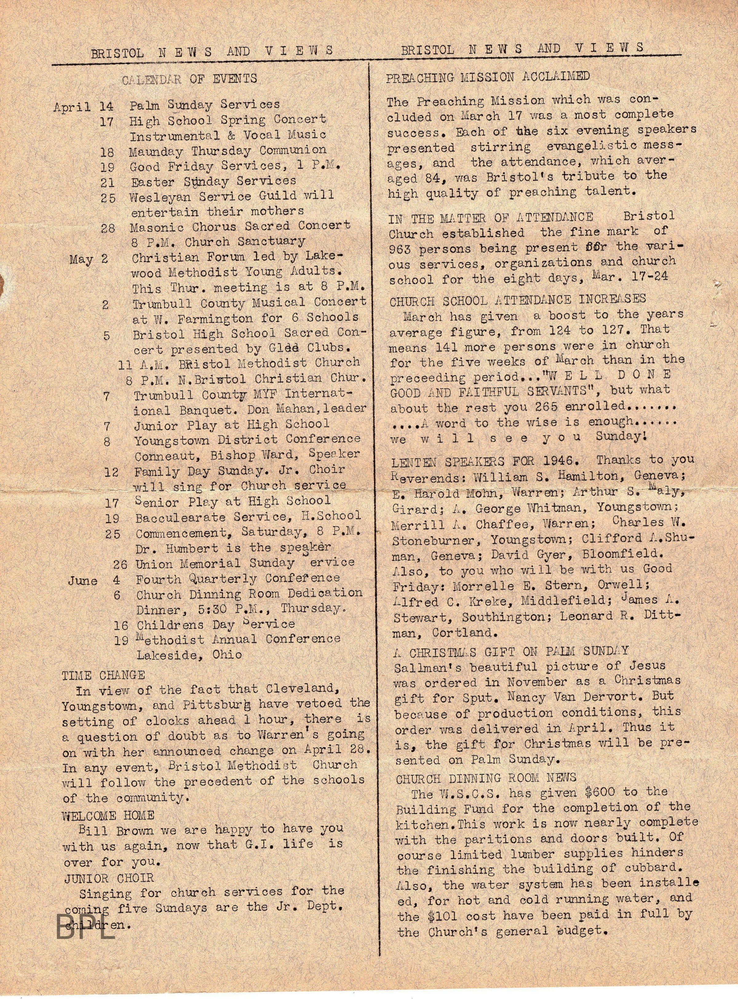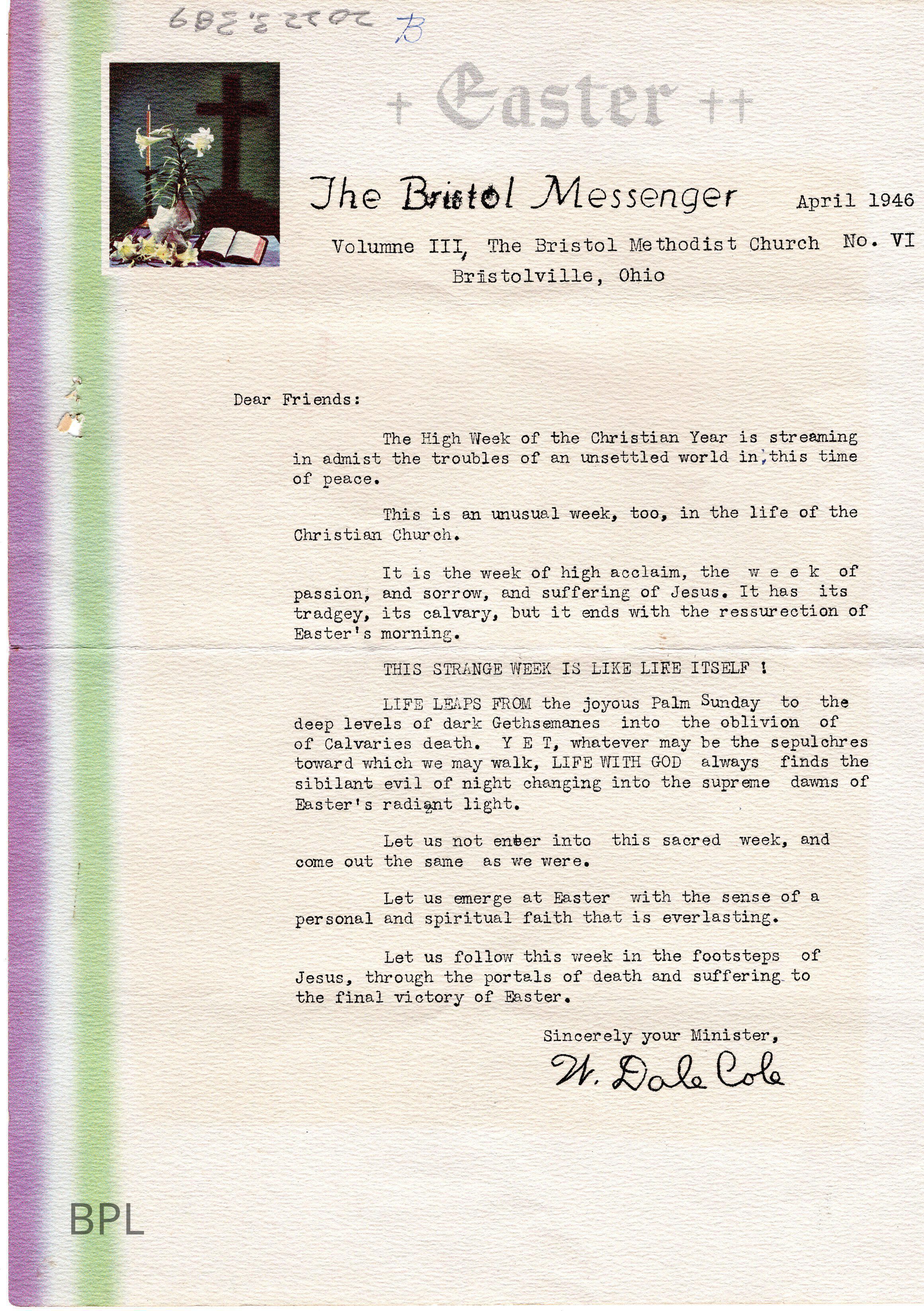Newsletter of Bristol Methodist Church, April, 1946Cataloged By