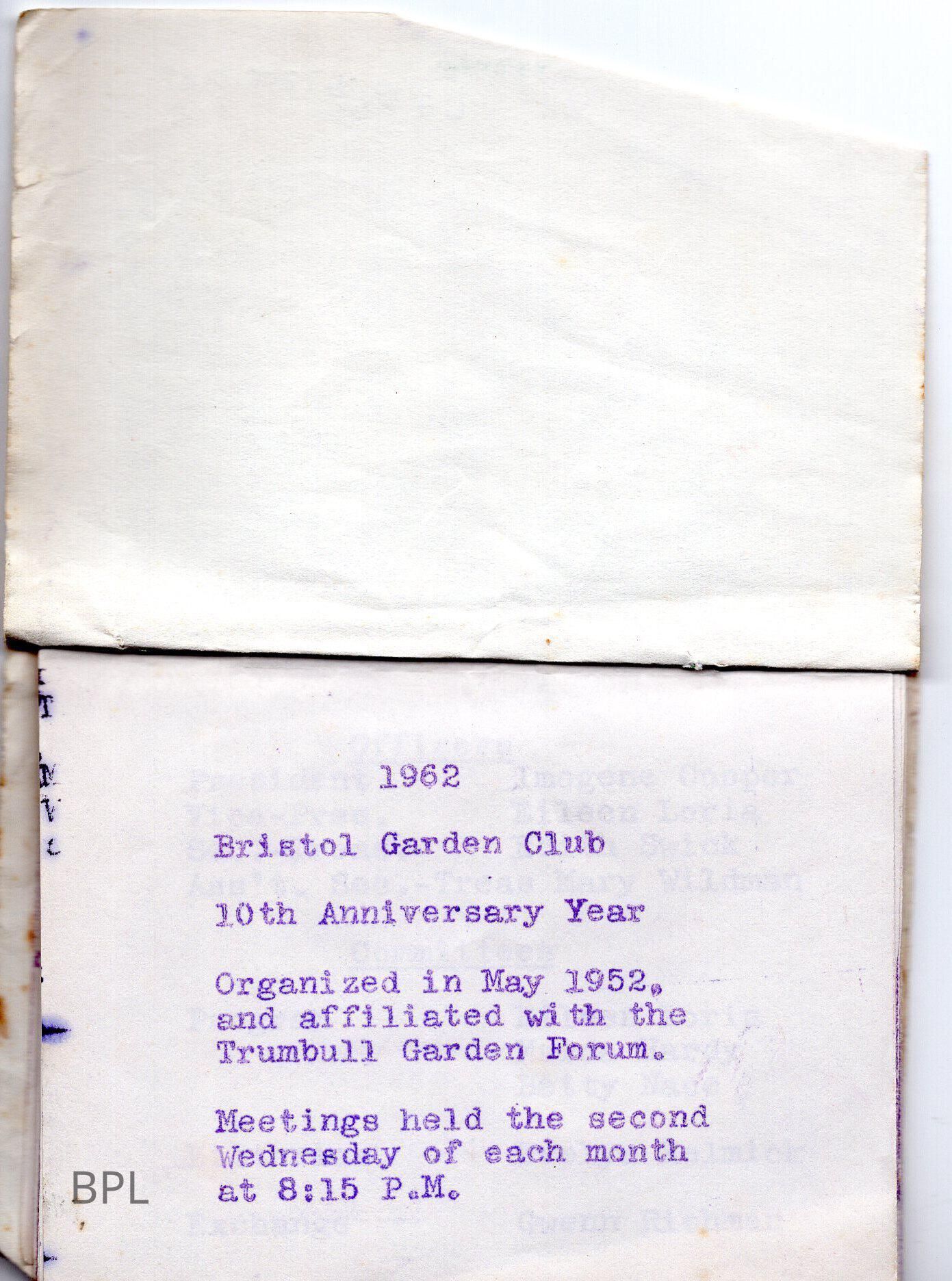 Bristol Garden Club, 10th year, organized May 1952 and affiliated with Trumbull Garden ForumCataloged By