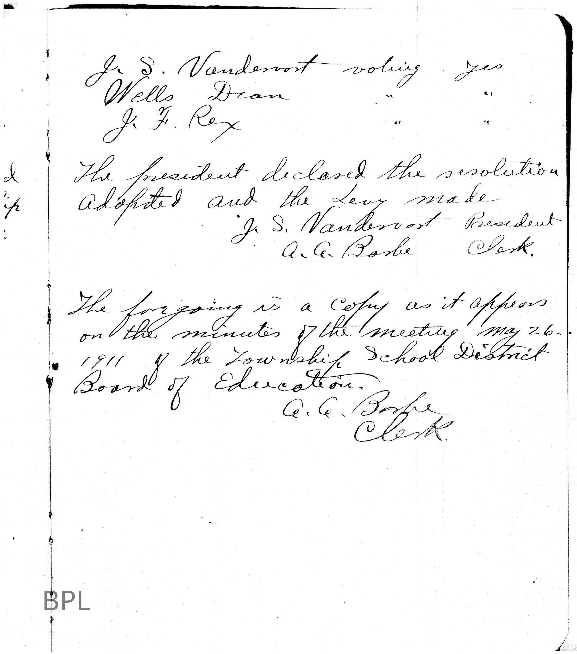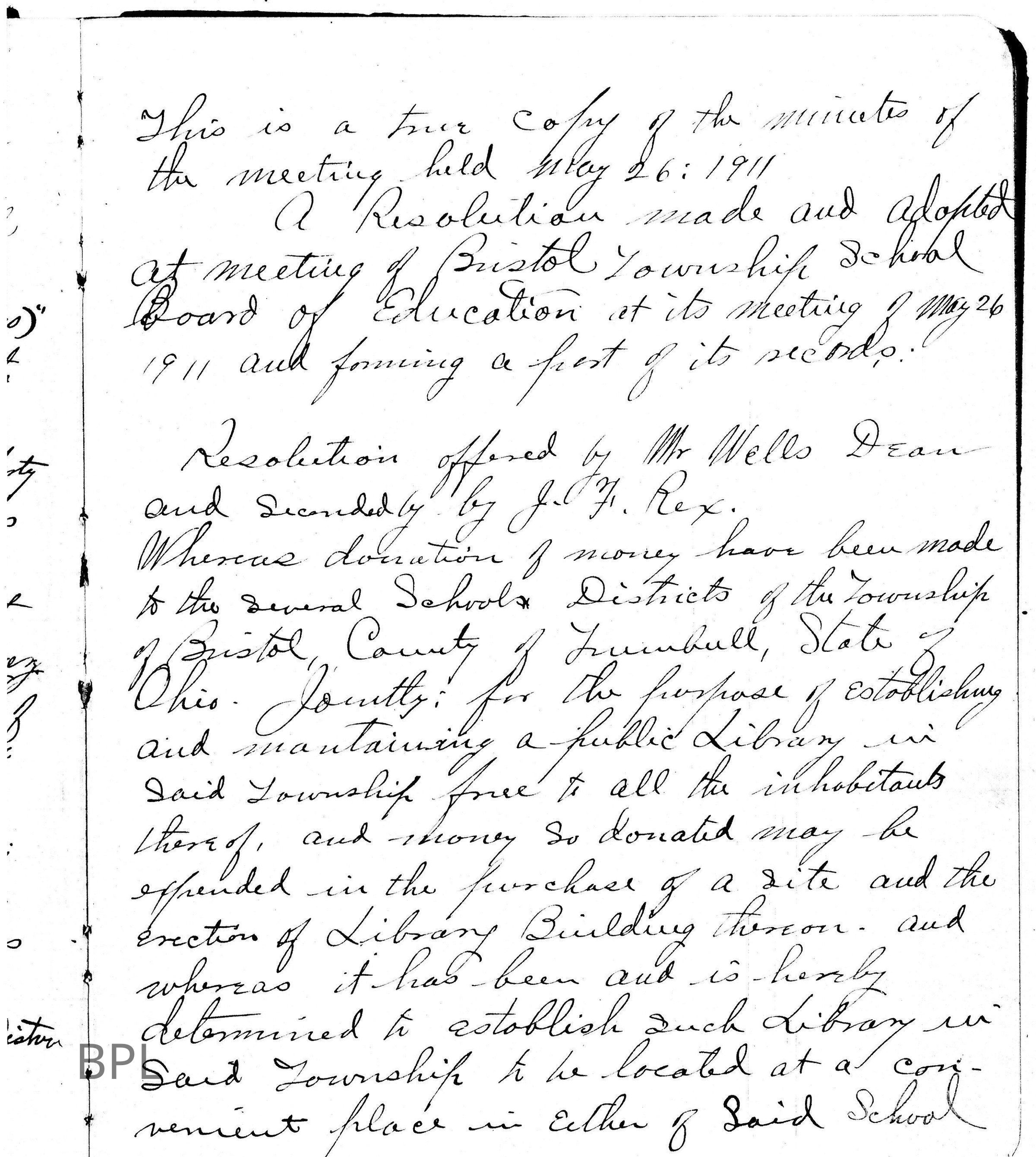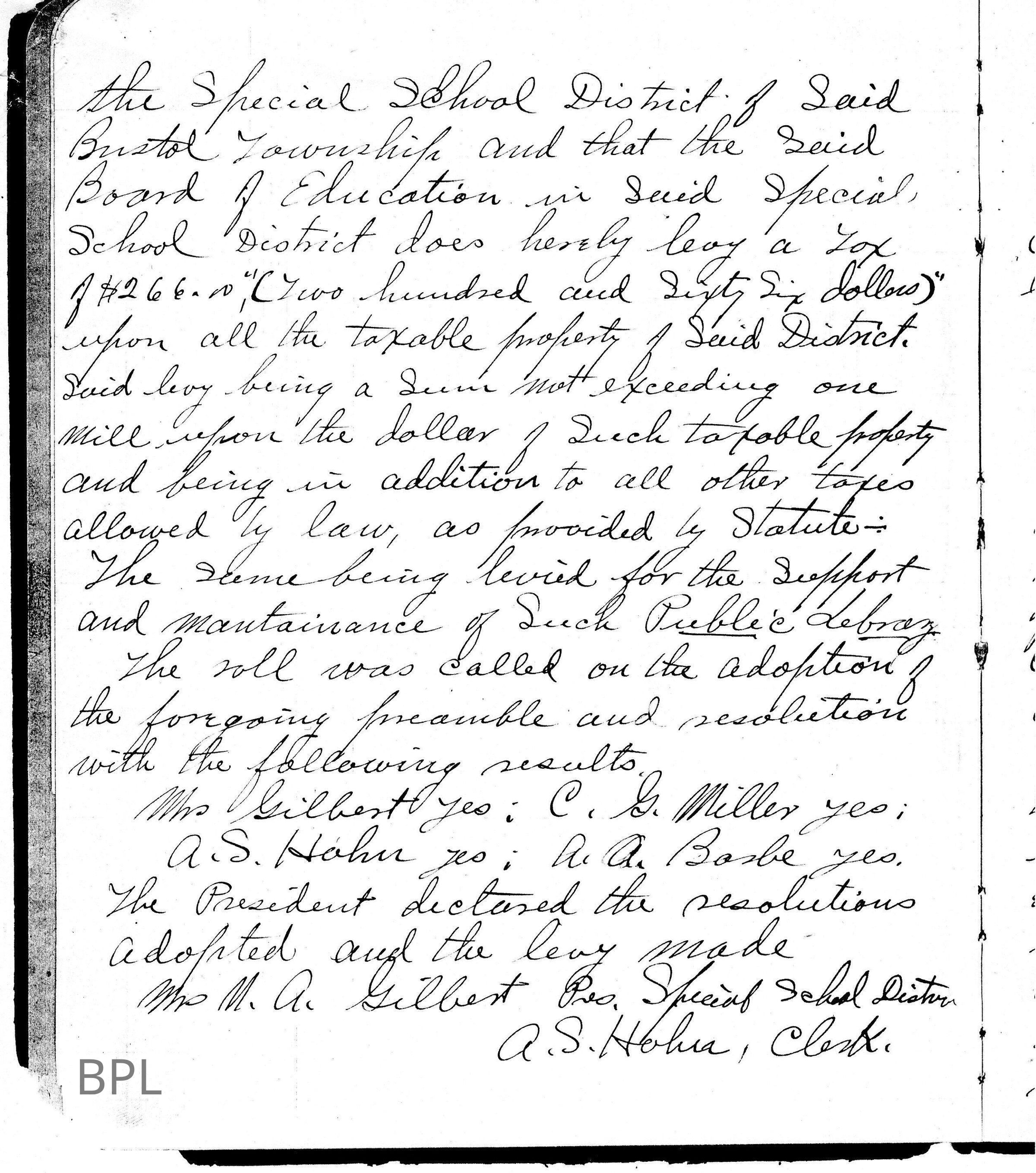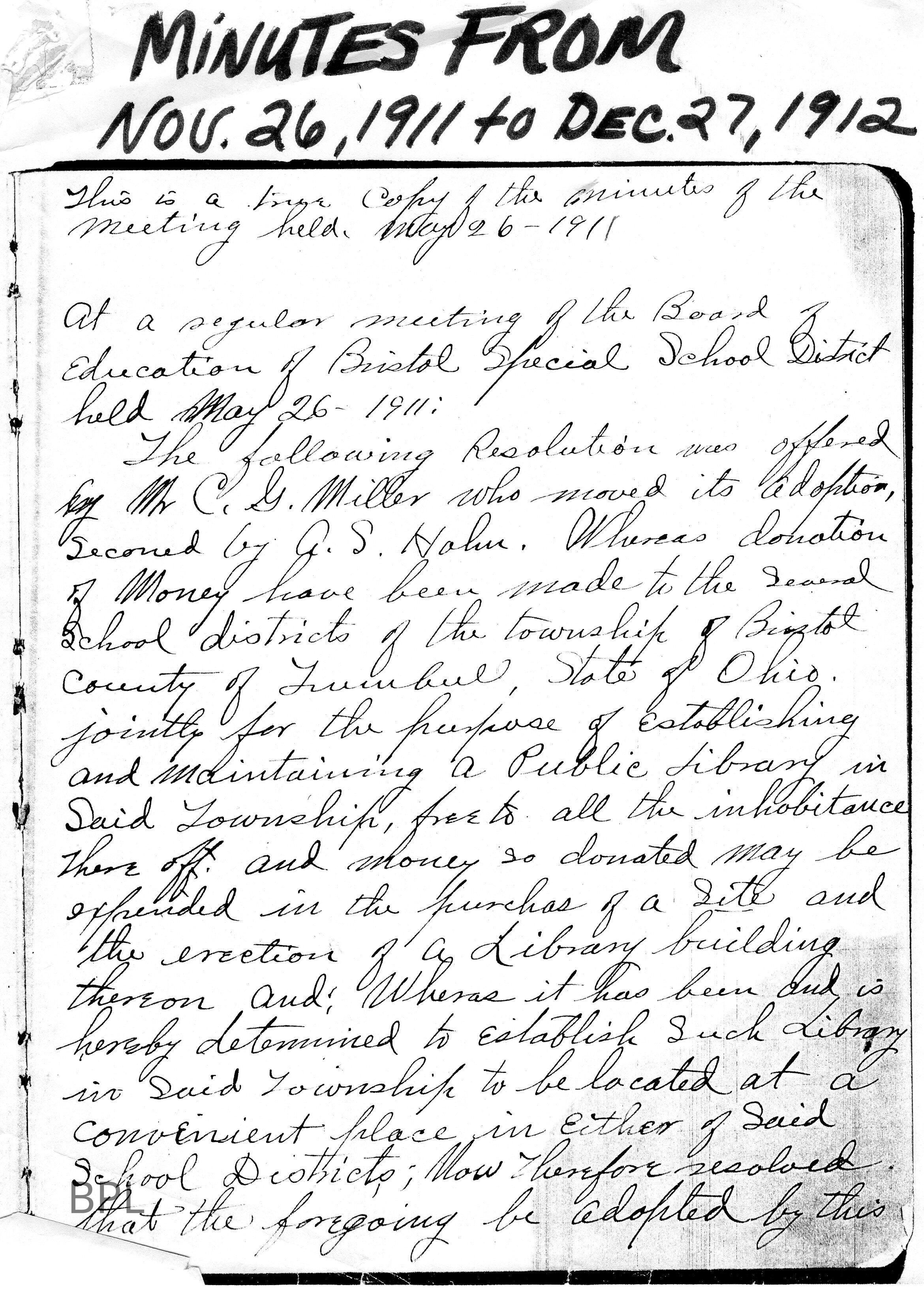 Minutes of Special School District of Bristol Township and Board of Education to have a levy for one mill on ballot for establishing and maintaining of a Public Library in Township, November 26. 1911 and May , 26, 1912Cataloged By