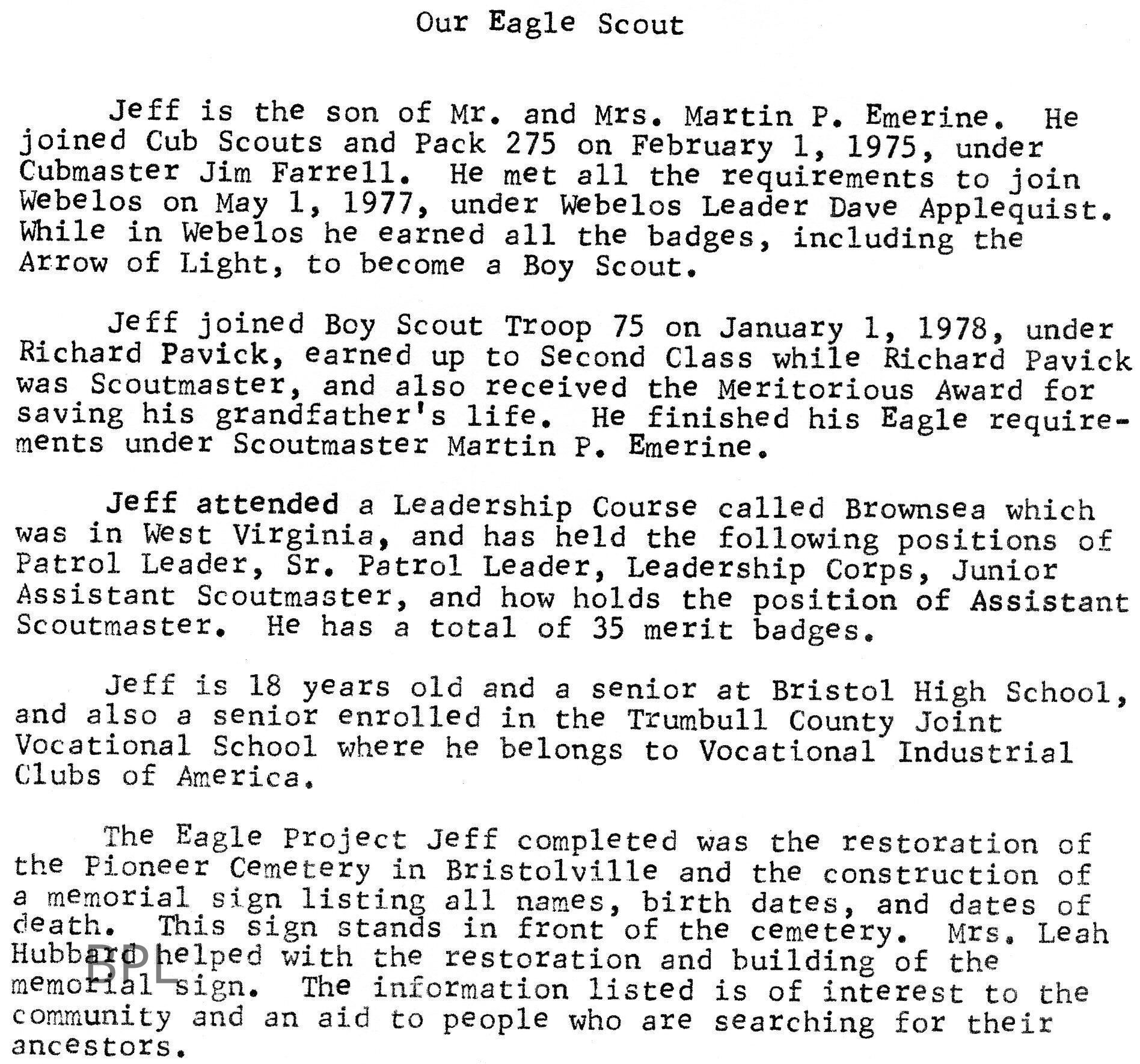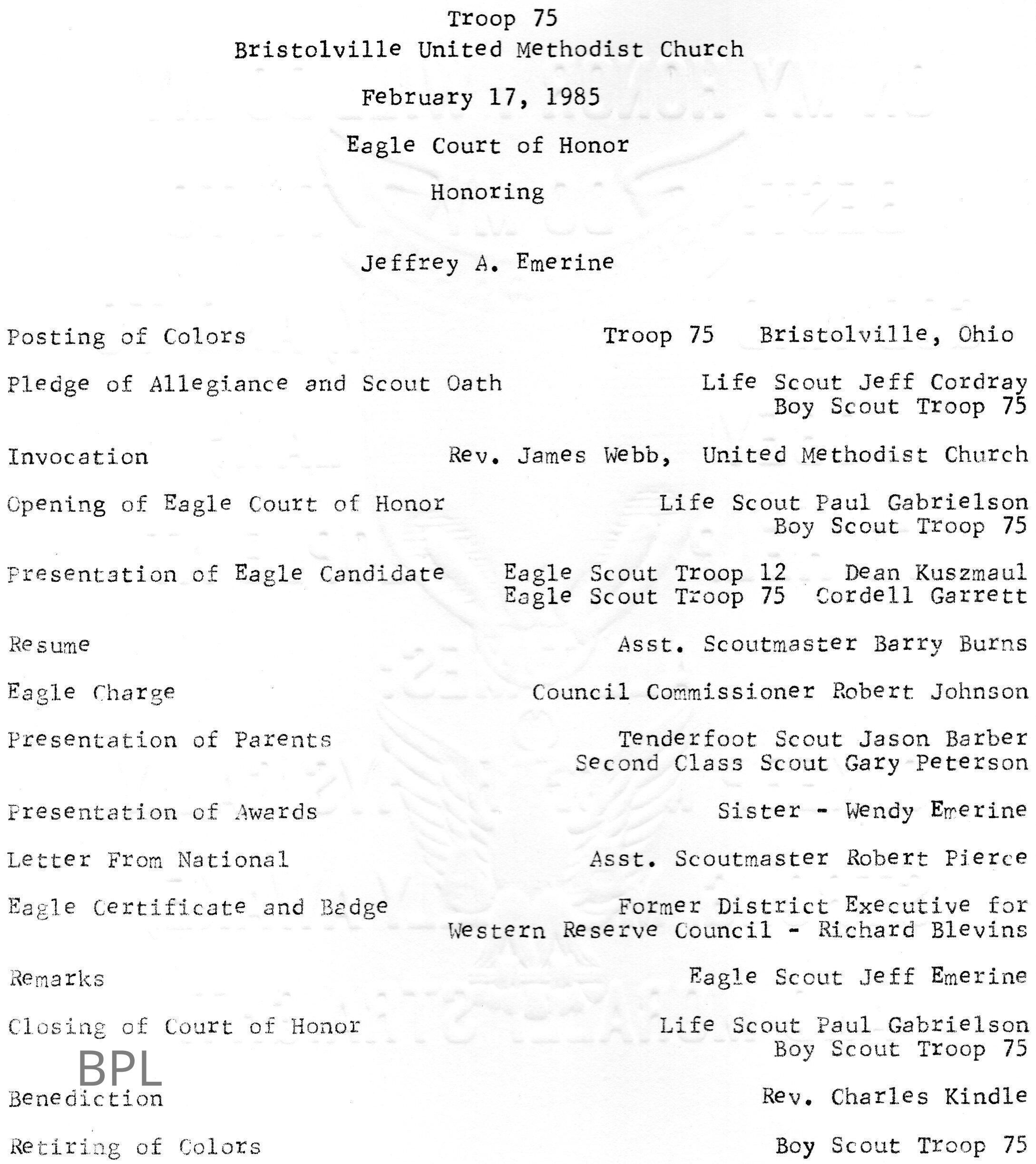 Eagle Scout Honor, February 17, 1985 for Jeffrey A. Emerine, Troop 75 Bristolville Methodist ChurchLocation