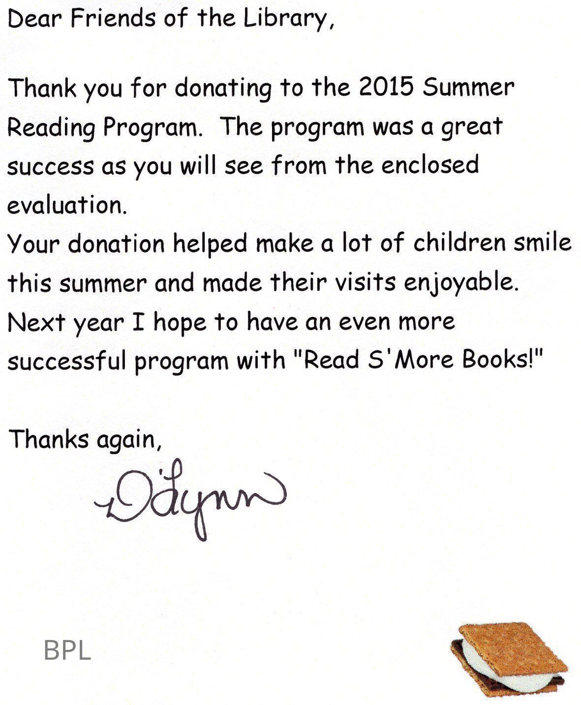 Thank You Card from Staff Member D'Lynn Johnson, Program Director of the Children's Summer Reading Program 2015, to Friends of Bristol Public Library.Cataloged By