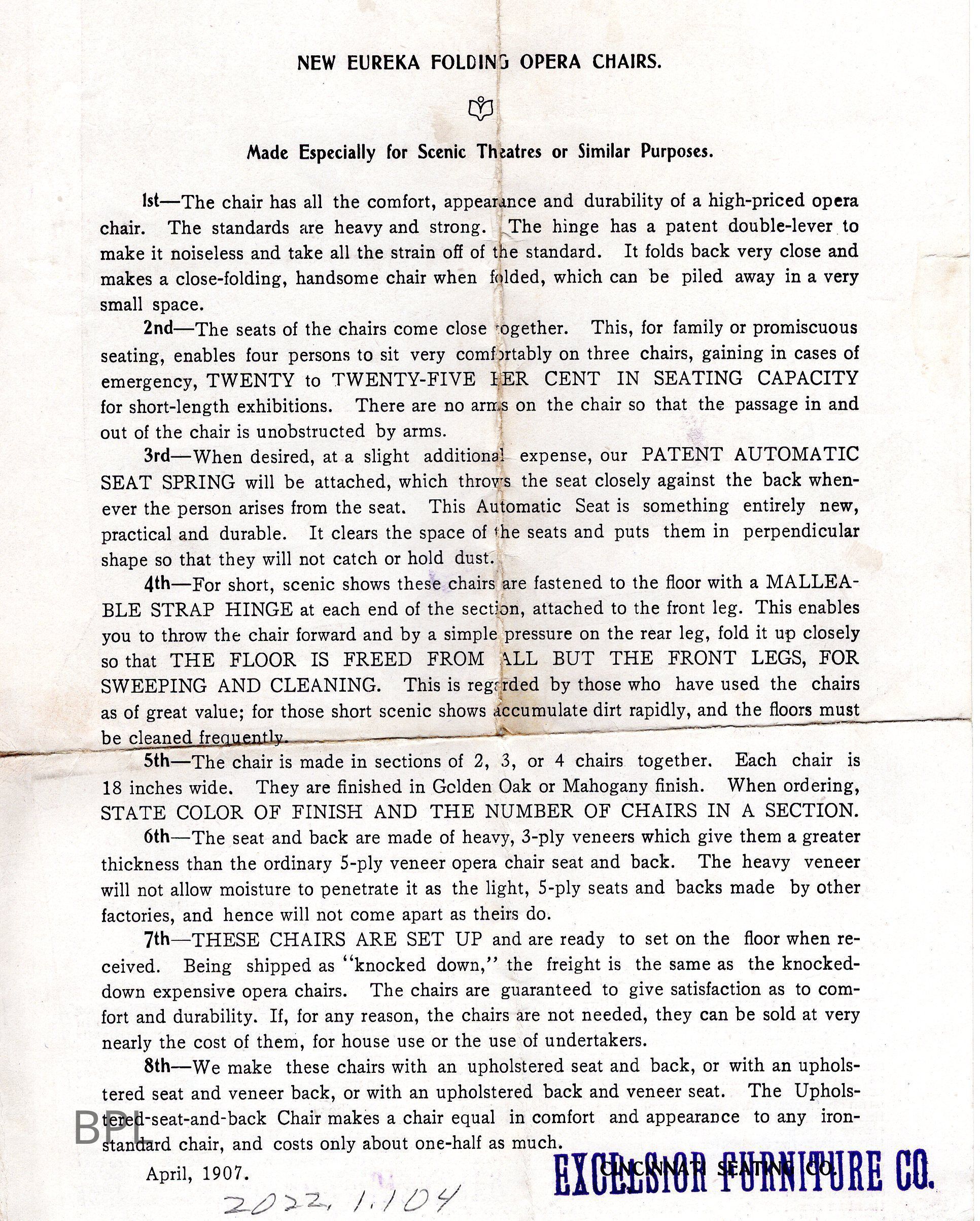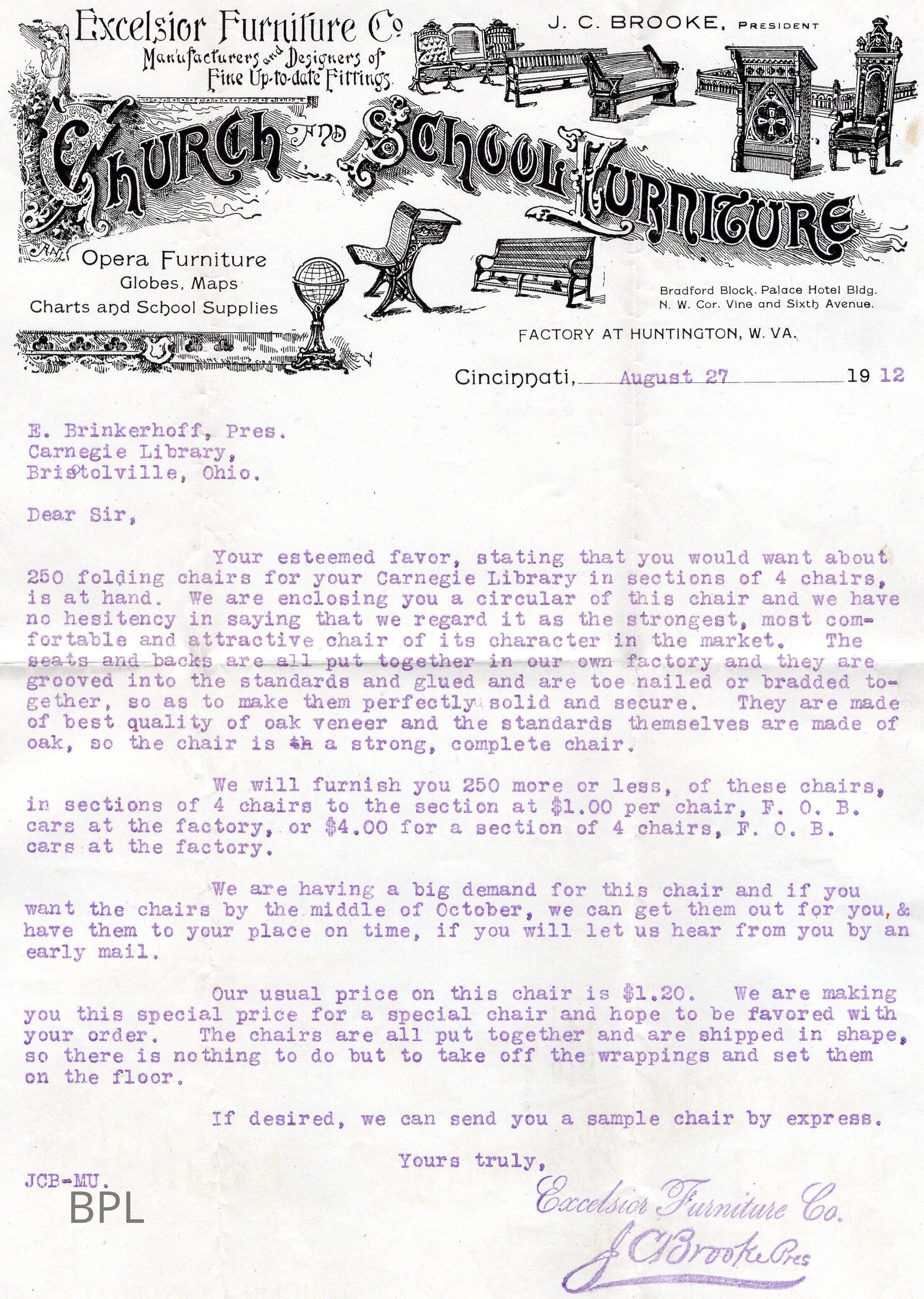 Letter from Excelsior Furniture Company of Huntington, West /Virginia of August 27, 1912 for sale of folding chairs for new library.Cataloged By