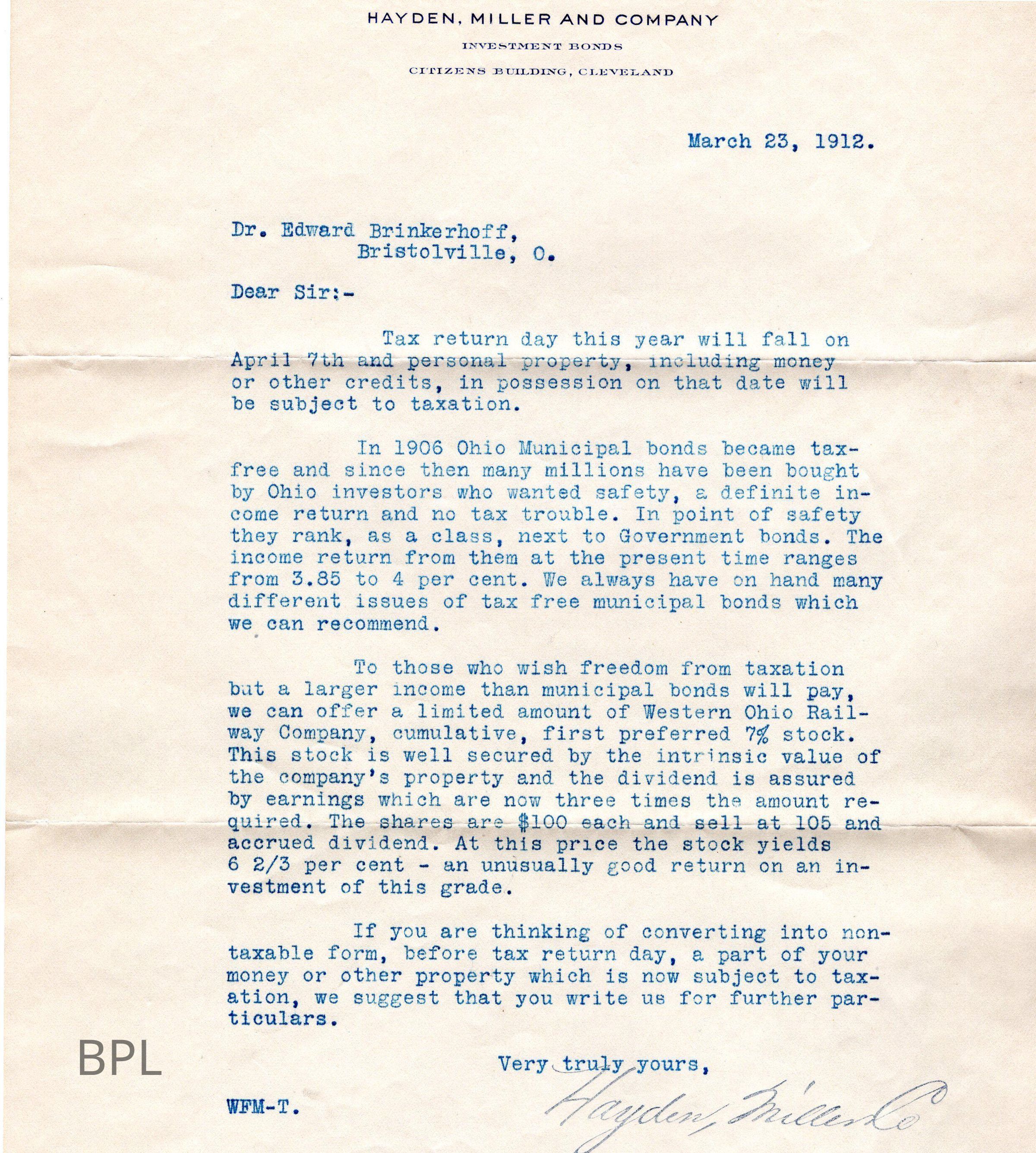 Letter to Dr. Edward Brinkerhoff of Bristolville, Ohio from Hayden, Miller and Company of Cleveland, Ohio regarding investments bonds taxation.Cataloged By
