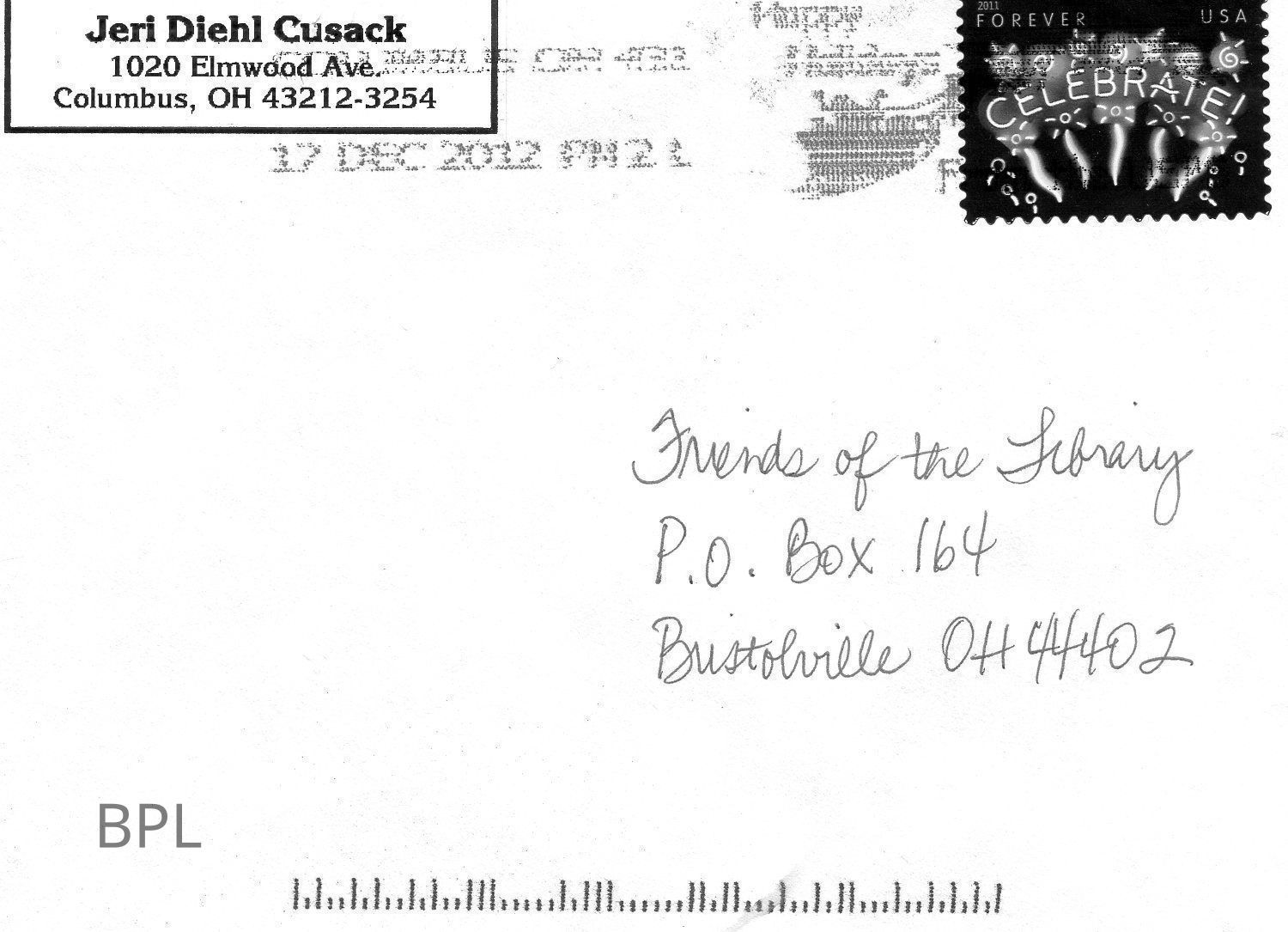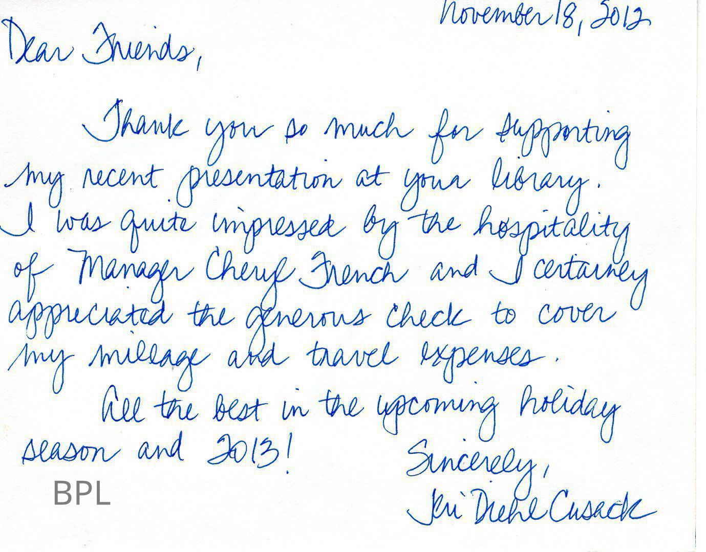 Thank You Note from Program Presenter Jeri Diehl Cusack on November 18, 2012Cataloged By