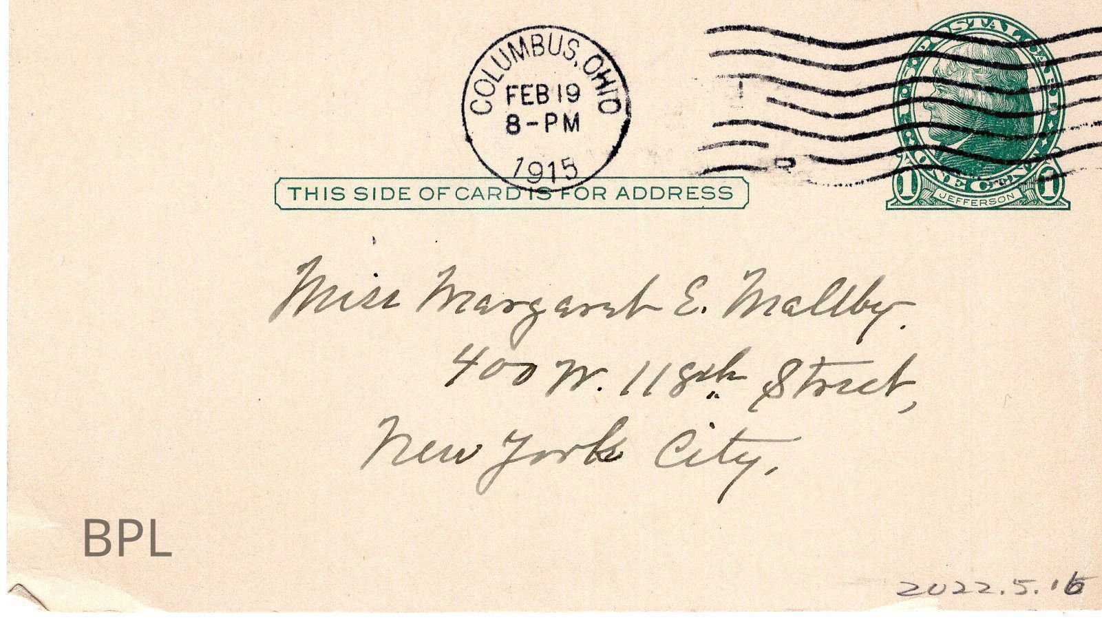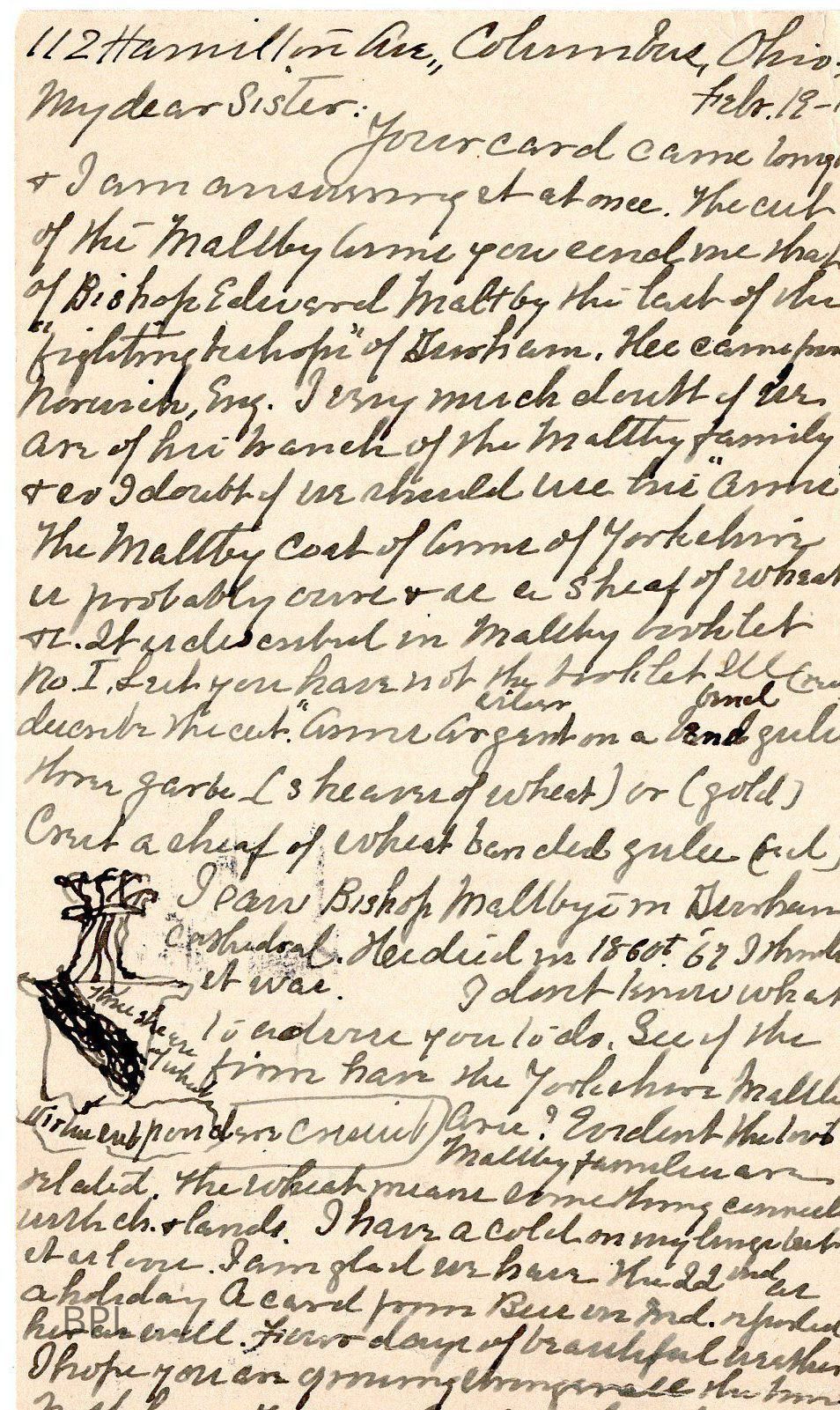 Postcard February 19, 1915 to Margaret Maltby from her sister Martha Maltby Regarding Family History and questioning the Family Crest of this Branch of Maltby FamilyCataloged By