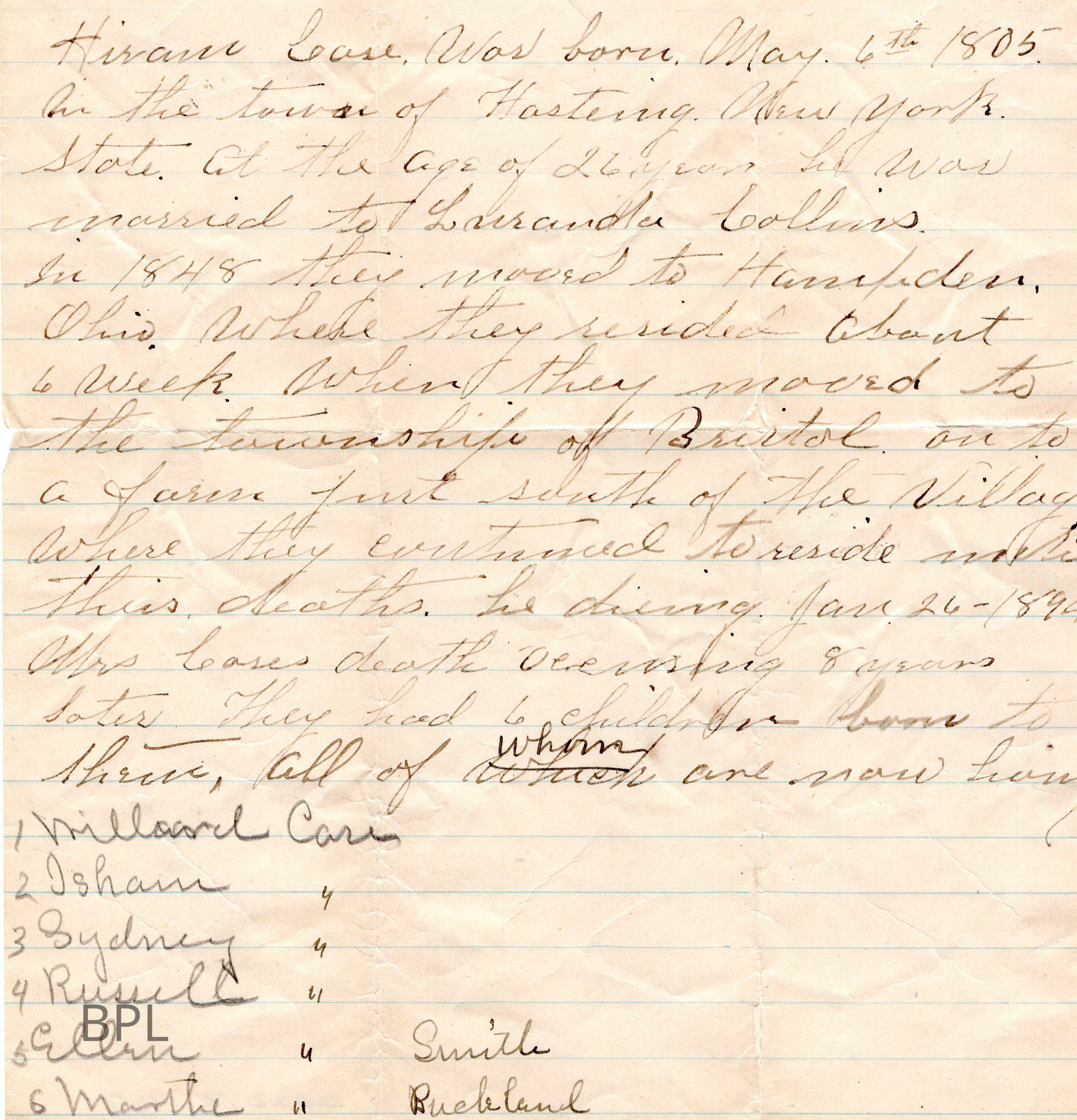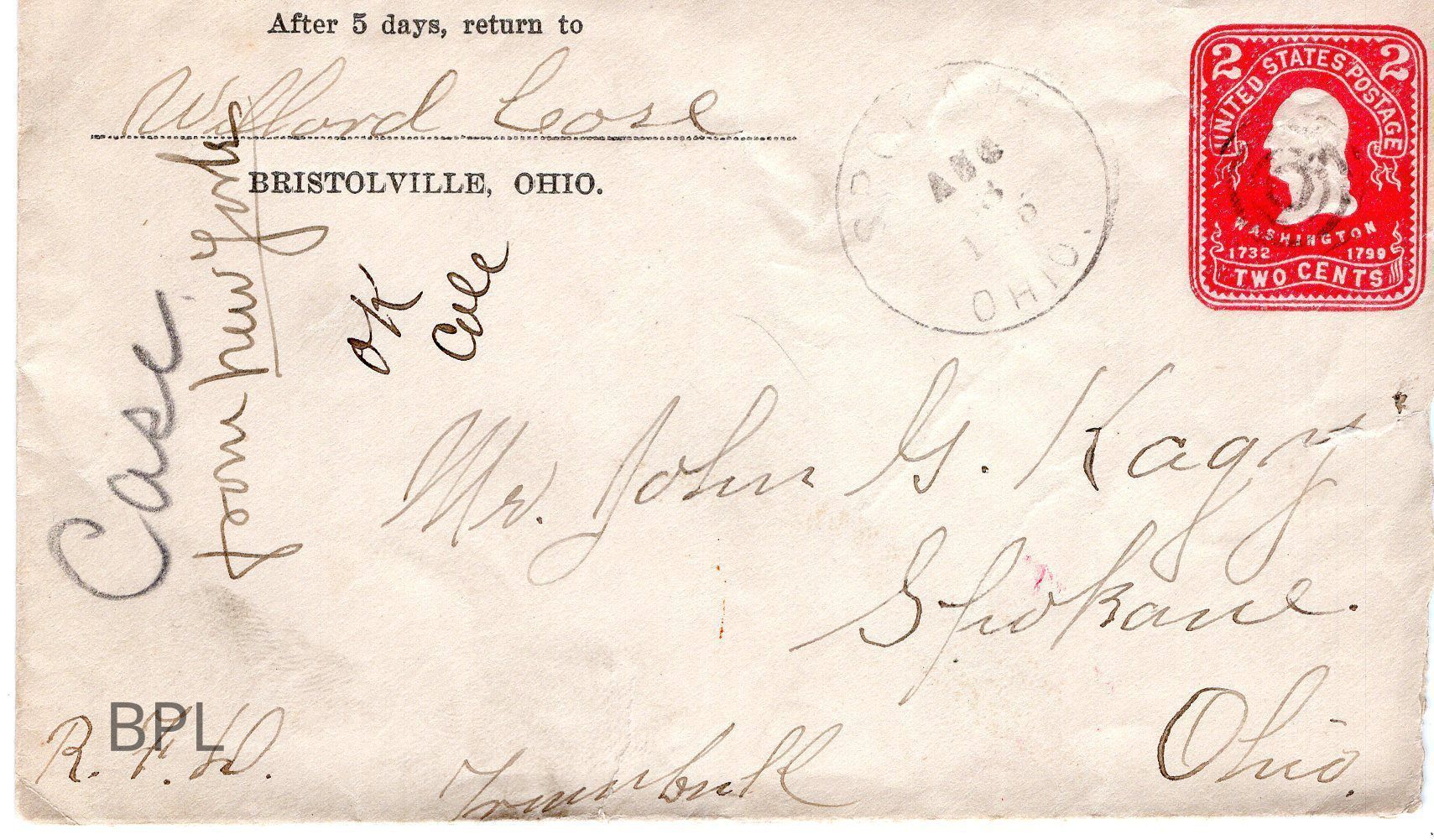 Envelope and letter August 8, 1905, from Willard Cease of Cease Family History to John G. Kagy for 100th year of Bristolville, OhioCataloged By