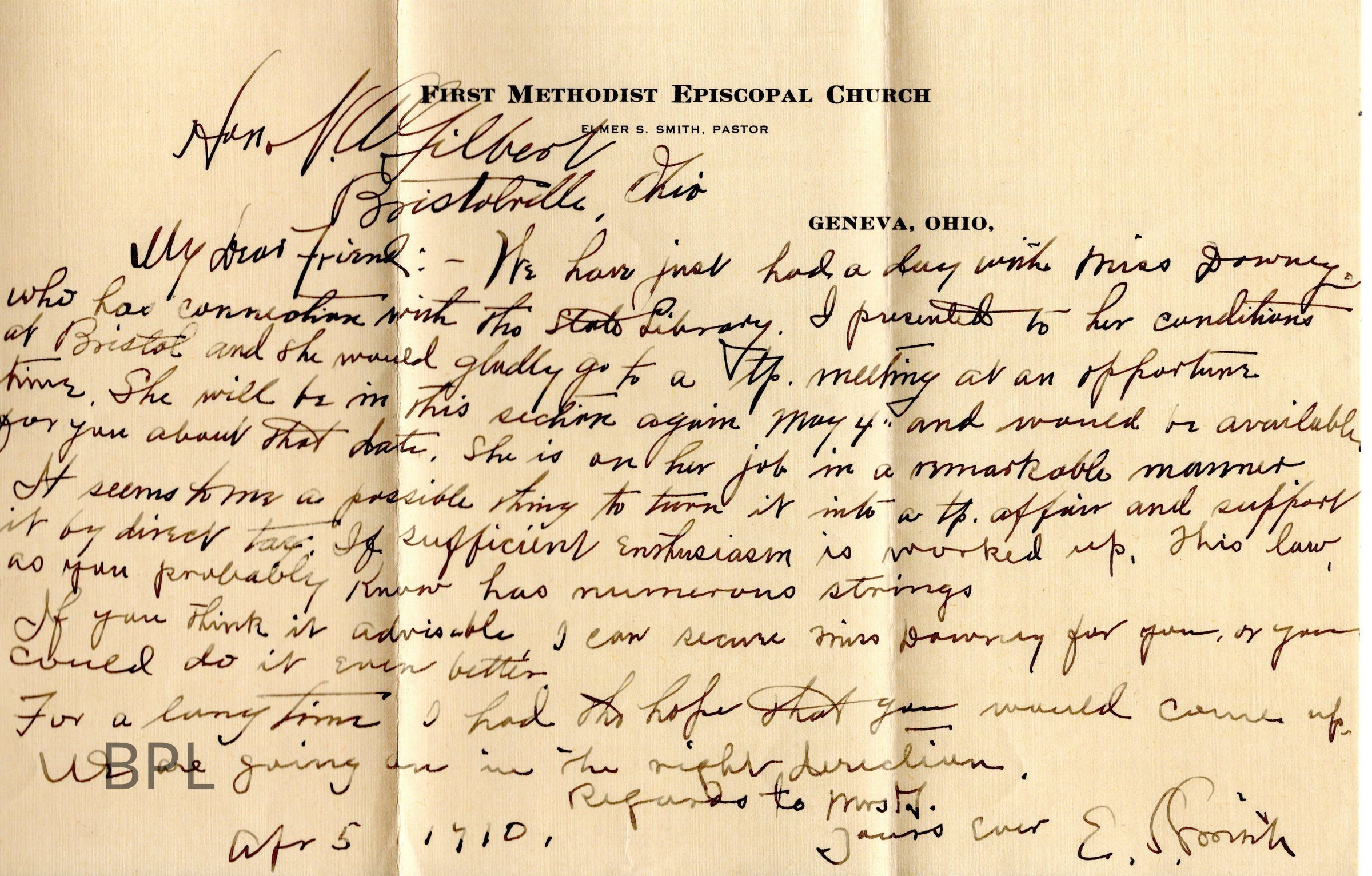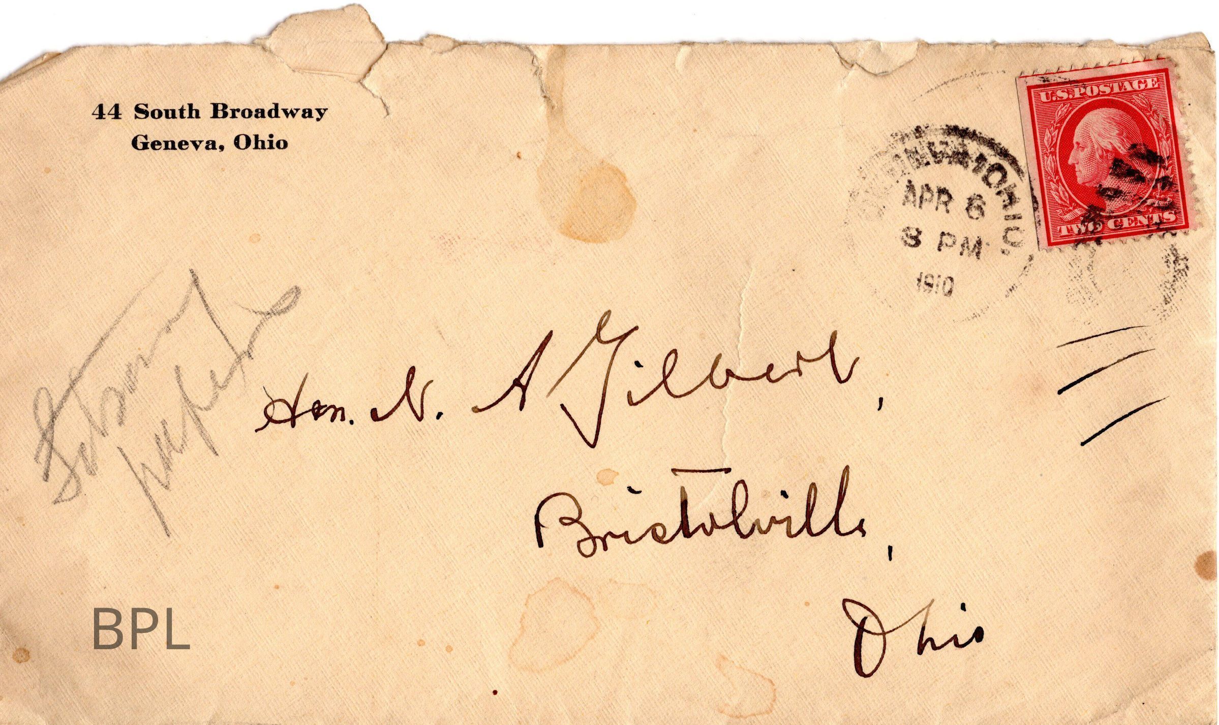 Letter to Judge Gilbert from First Methodist Episcopal Church of Geneva , Ohio April 5, 1910Cataloged By