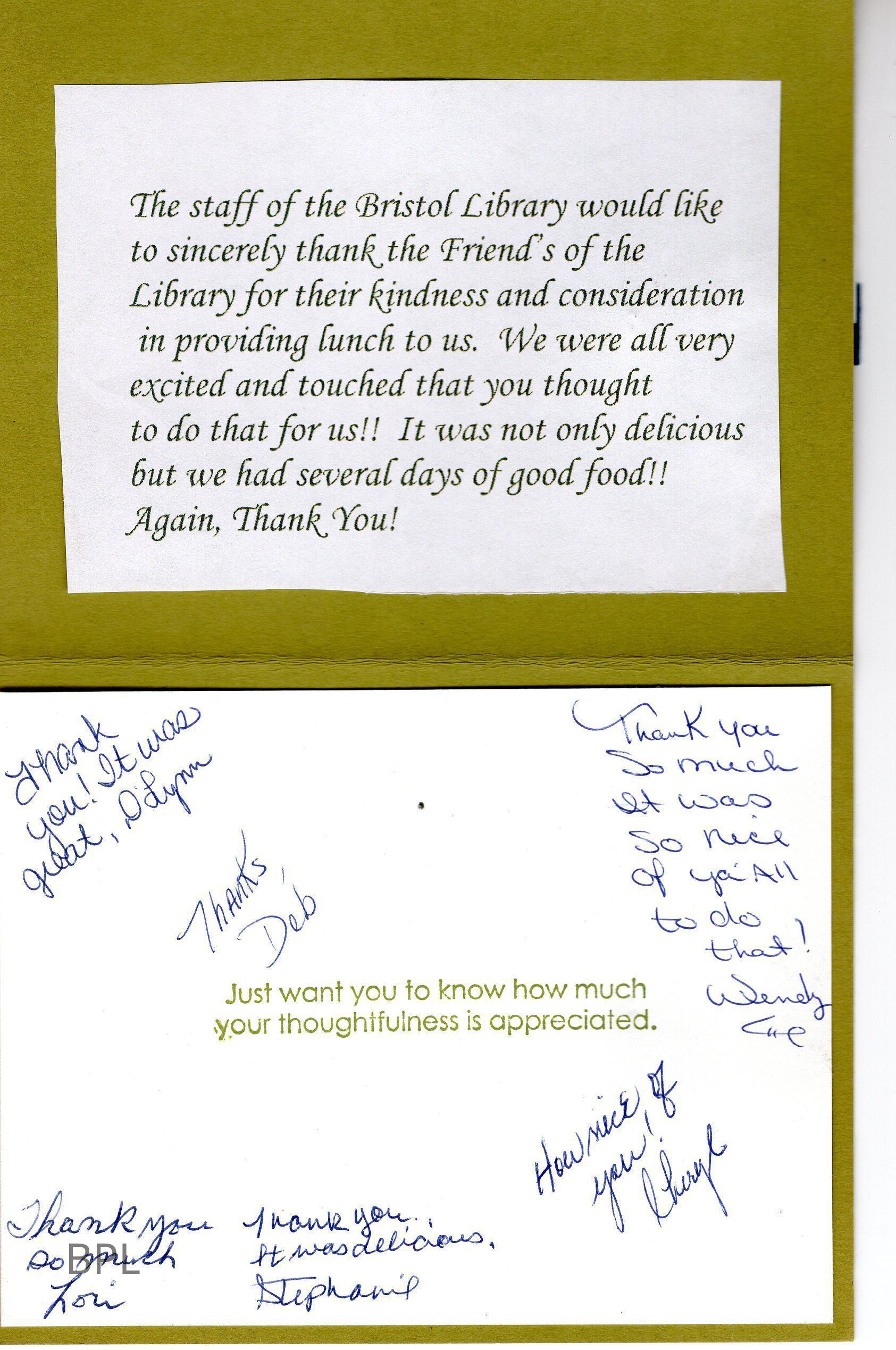 Thank You Card from Bristol Public Library Staff for Lunch from Friends of Bristol Public Library