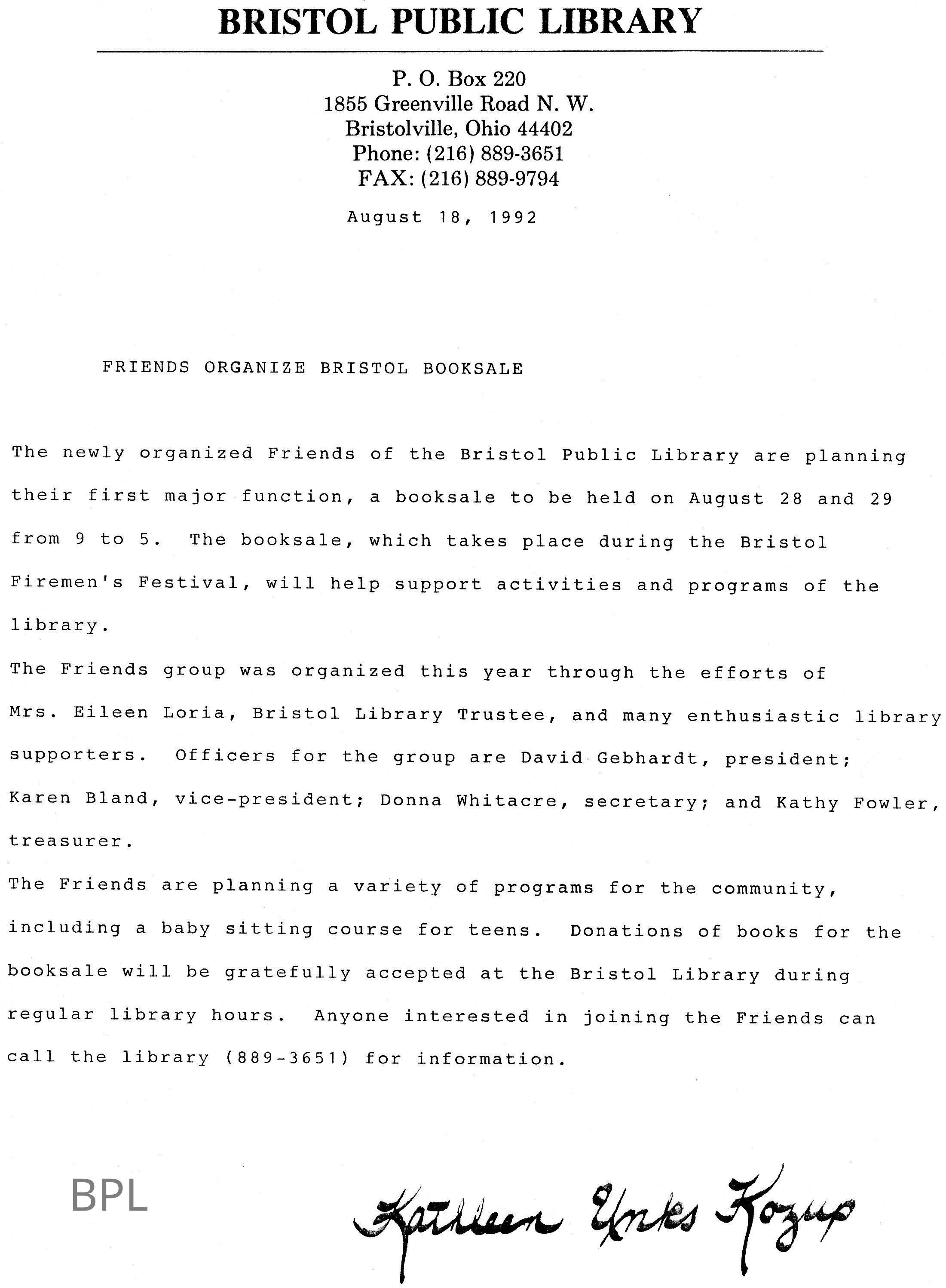 Newly organized Friends of Bristol Public Library Announcing Booksale August 28th, 29th 1992.