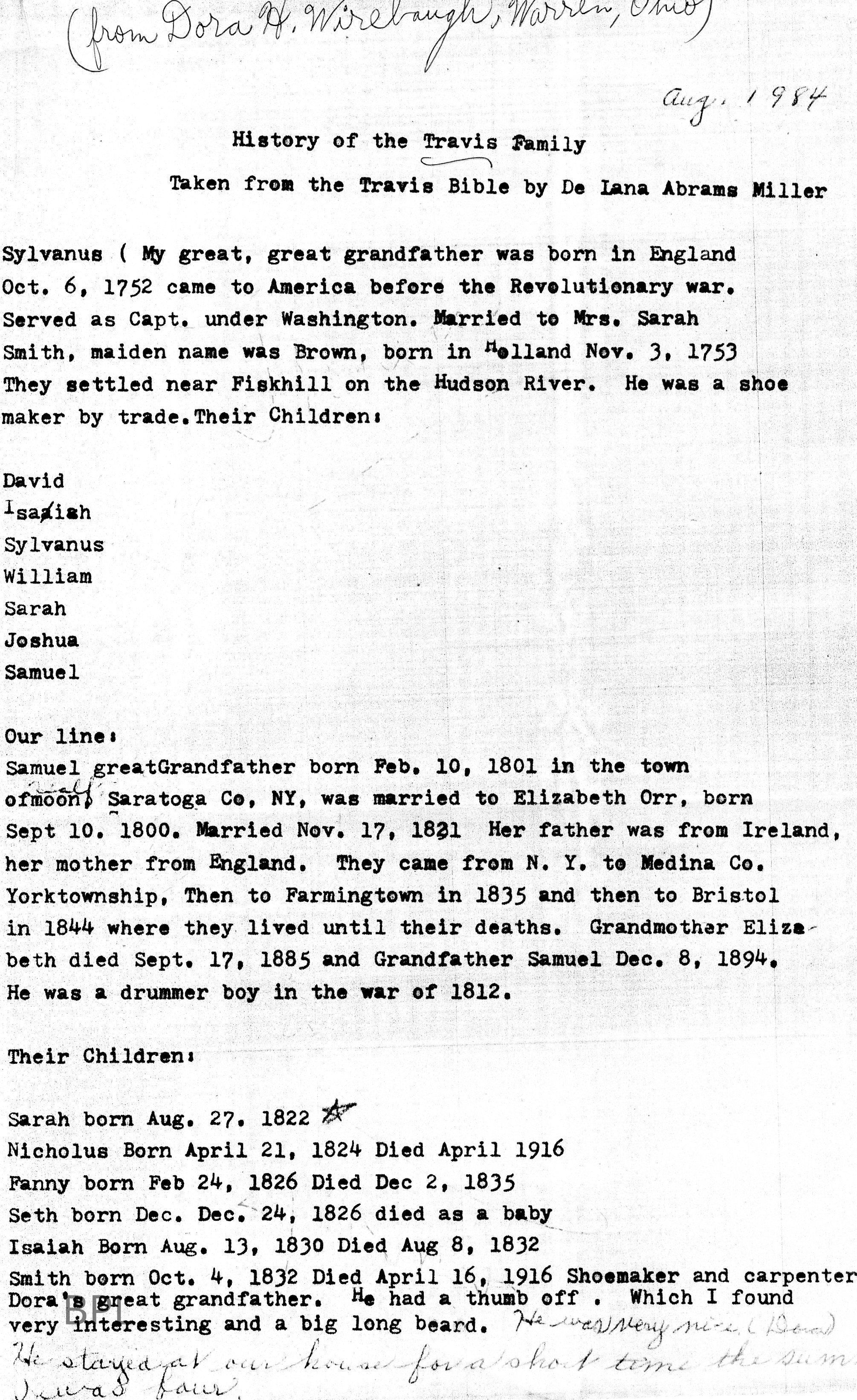 Notes of Travis Family History, August 1984Cataloged By