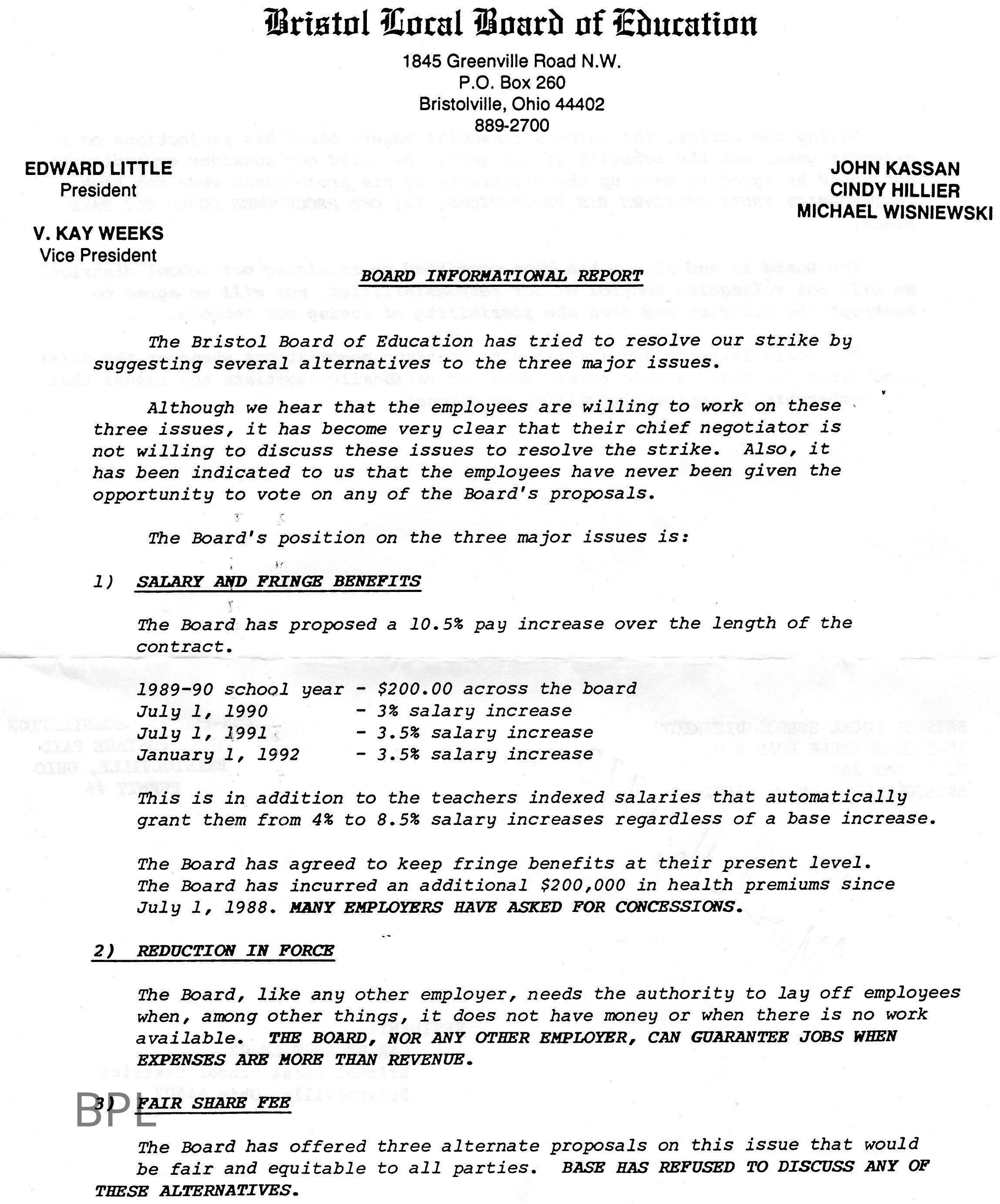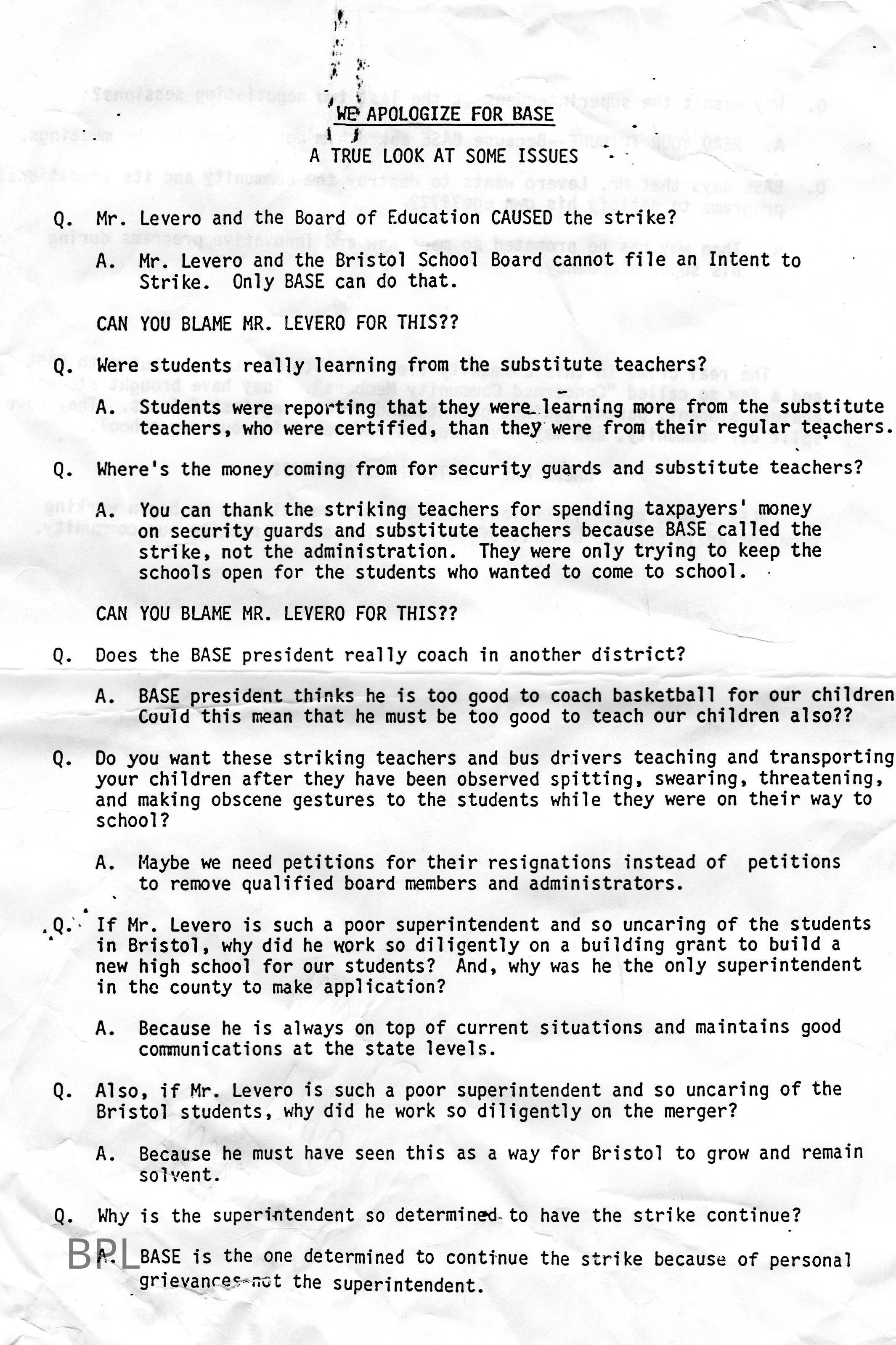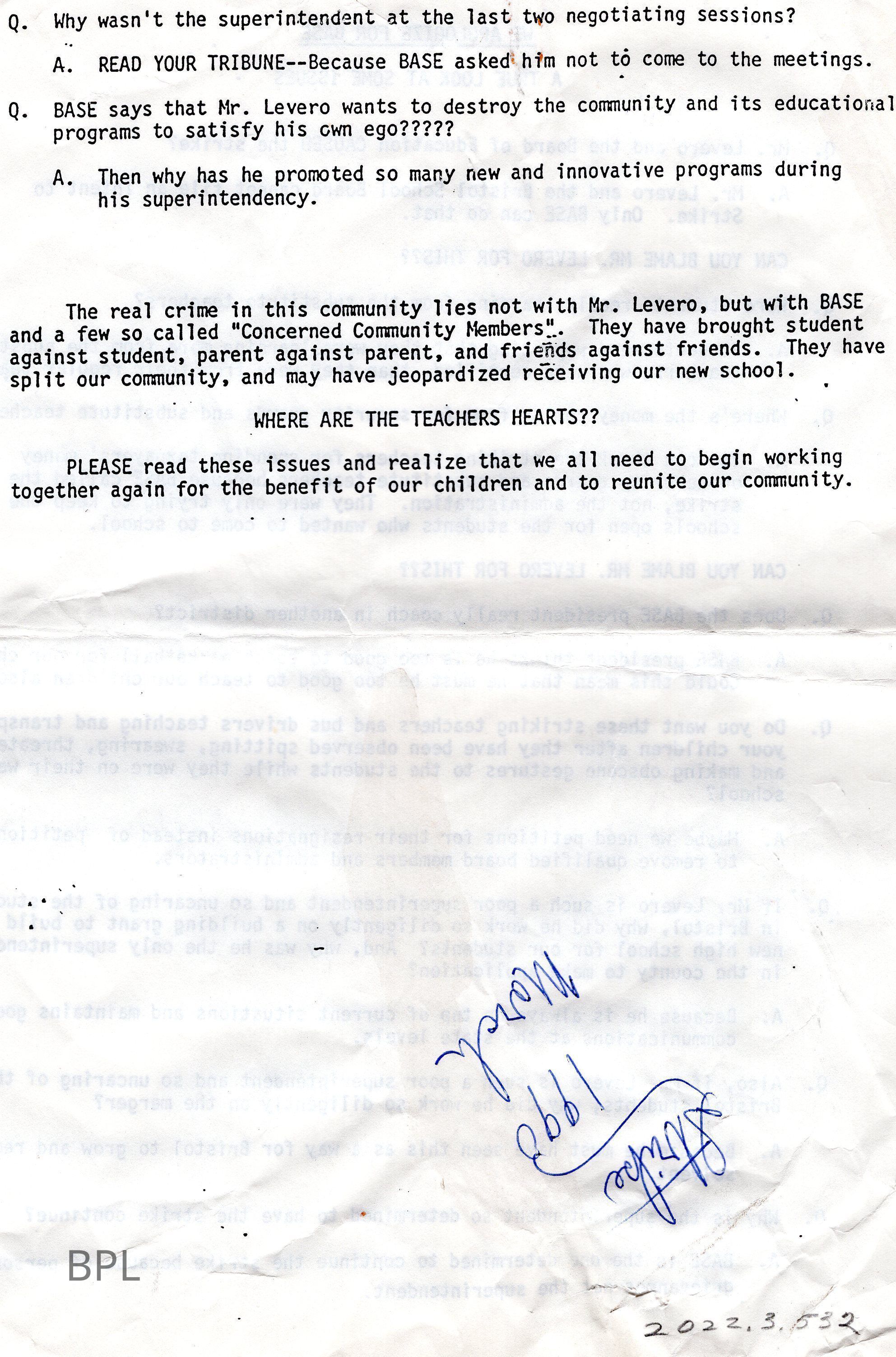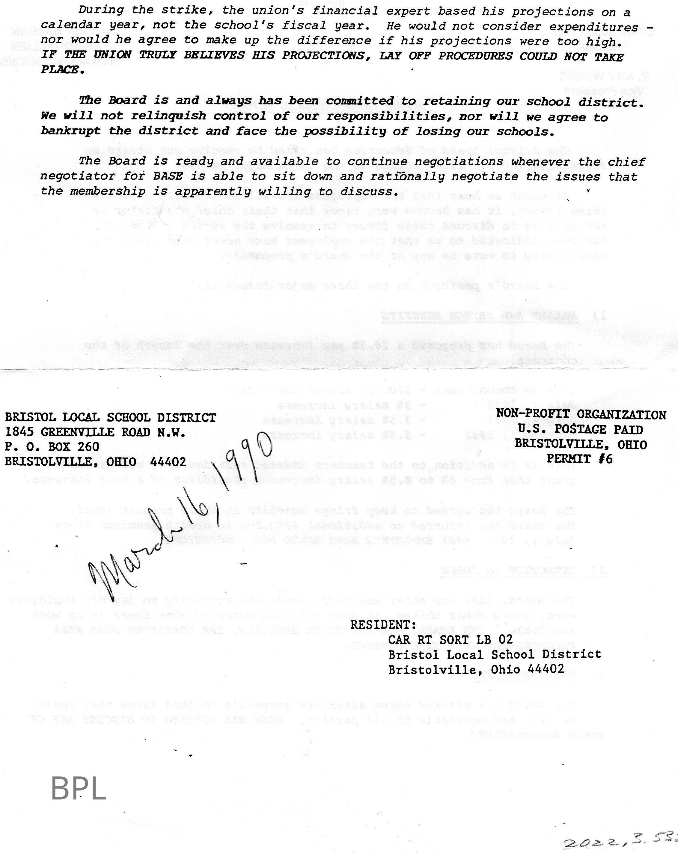 Letter, Mailer from Bristol School Board of Education, March 16, 1990, regarding Teachers Strike.Cataloged By