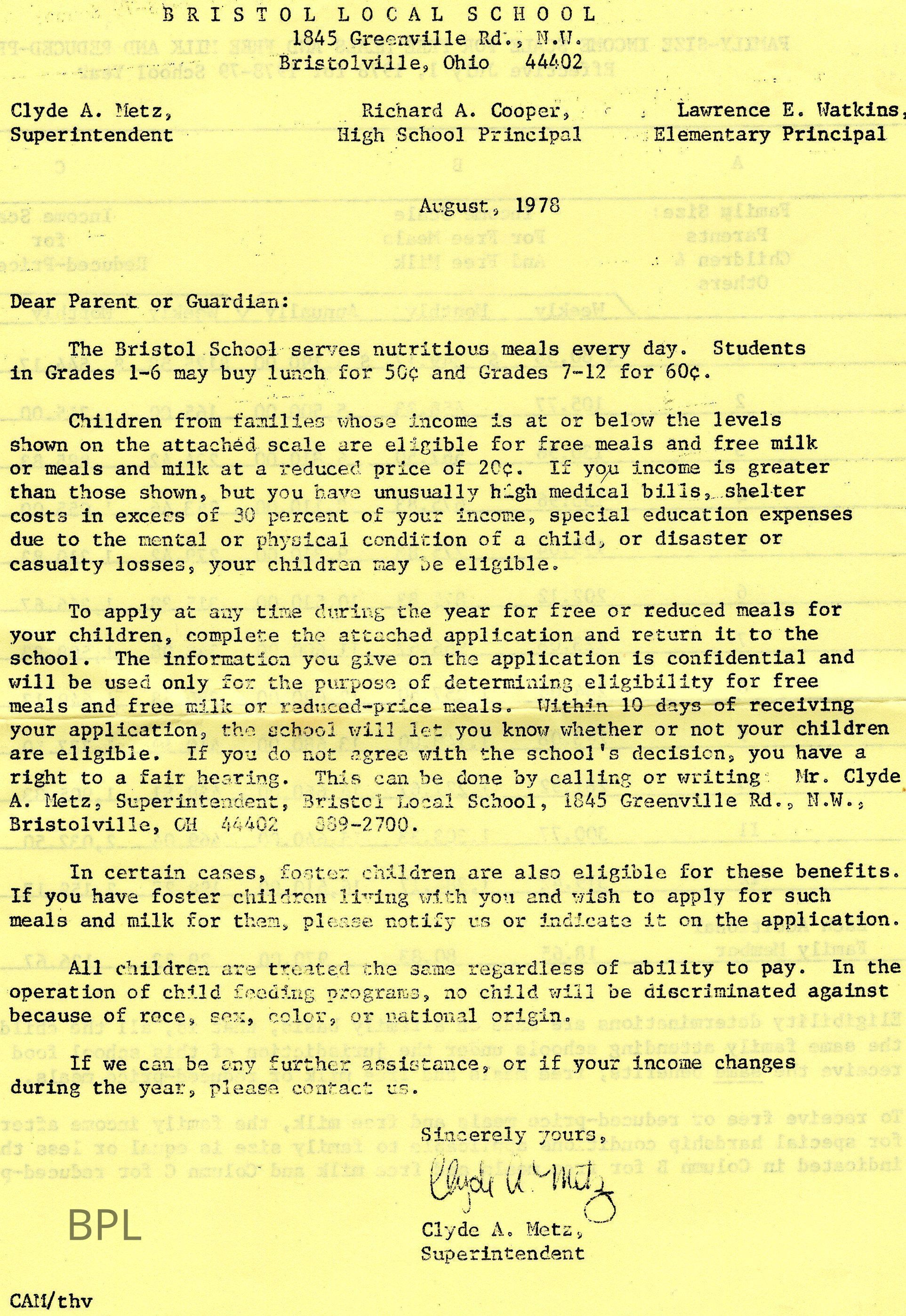 Letter to Parents from Bristol School Regarding School Lunches, August 1978Cataloged By