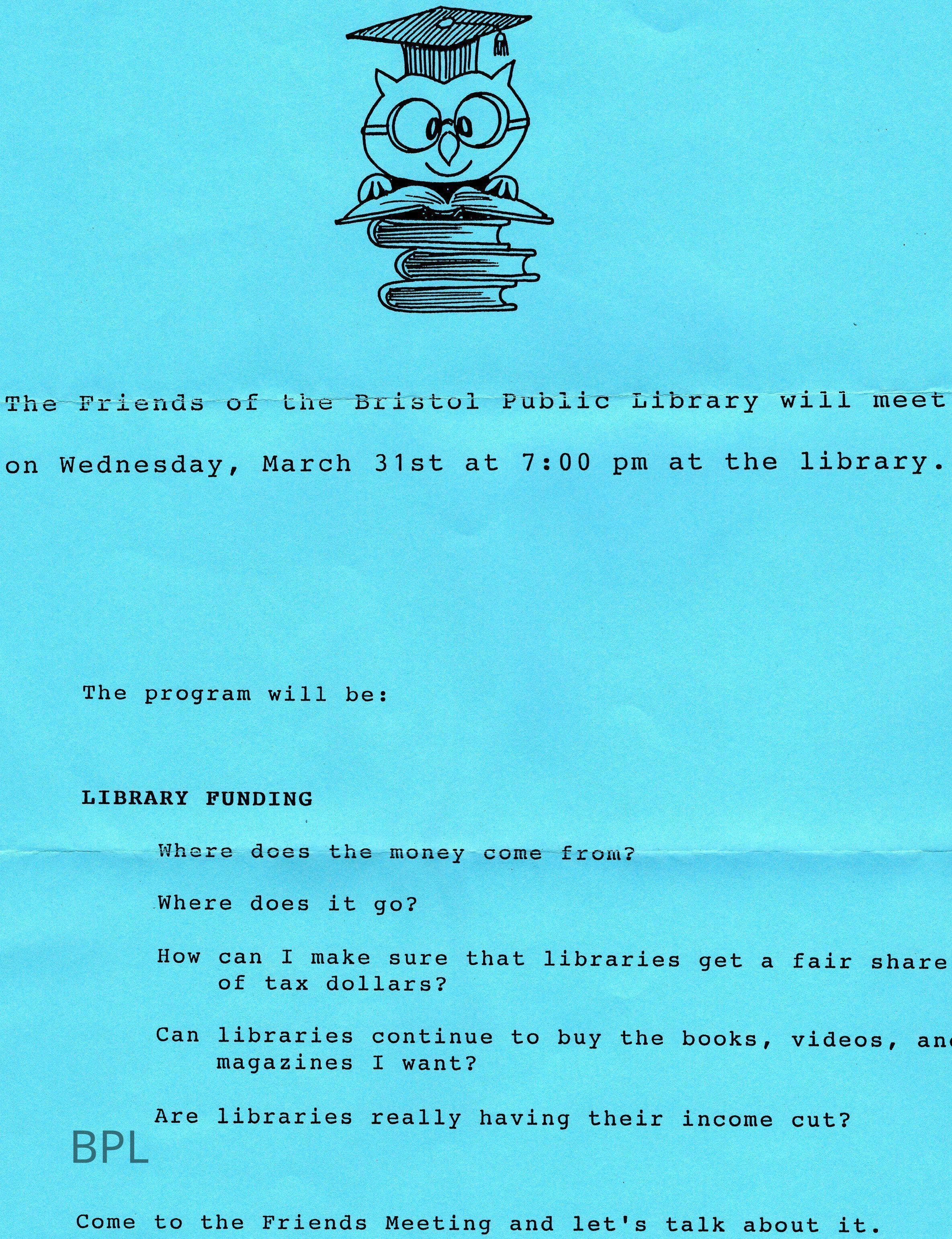 Newsletter for Friends of Bristol Public Library meetingCataloged By