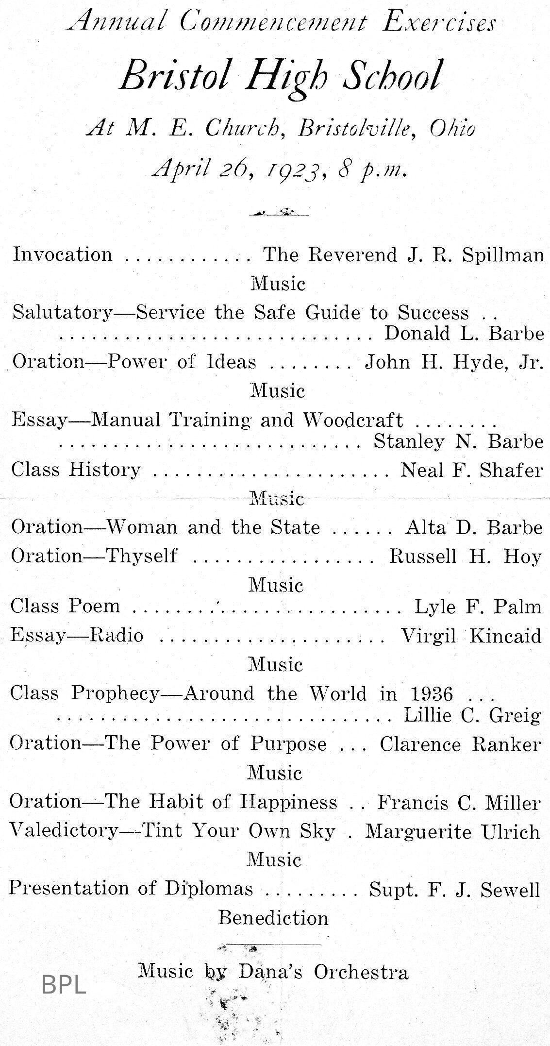 Bristol School, Barb, Stanley, Barbe, Donald, Hyde, John ,Jr, Shafer, Neil F, Barb, Alta D., Hoy, Russell, Palm, Lyle F., Kincaid, Virgil, Greig, Lillie C., Ranker, Clarence A., Miller, Francis C., Ulrich, Marguerite G, Spillman, J. R. Rev, Dana, Orchestra, Sewall, F.J.