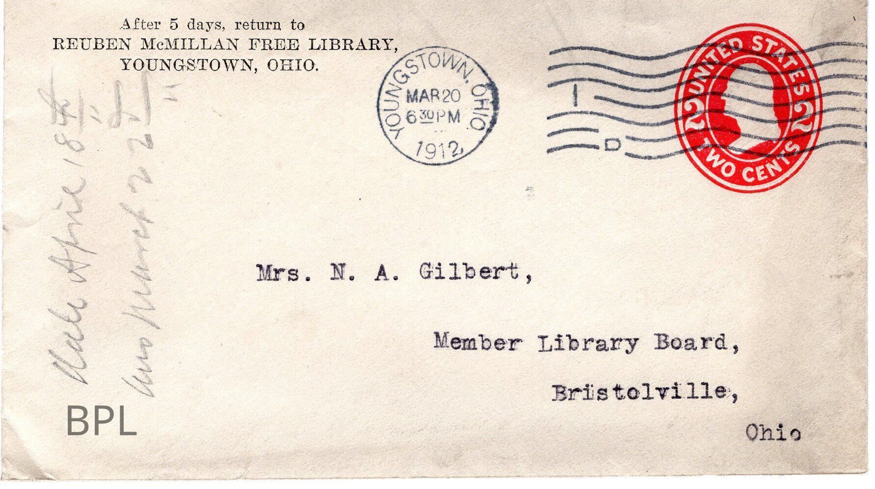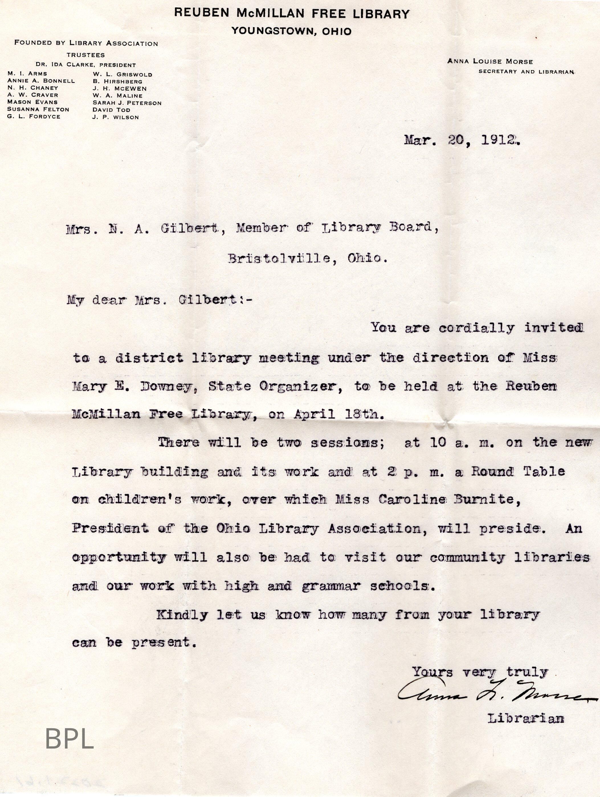 Envelope and letter to Mrs. N. A. Gilbert (Anna) from Reuben McMillan Free Library of Youngstown, Ohio librarian Anna L. Morse, inviting her to attend a district library meeting under direction of Mary E. Downey, State organizer, March 20, 1912.Cataloged By