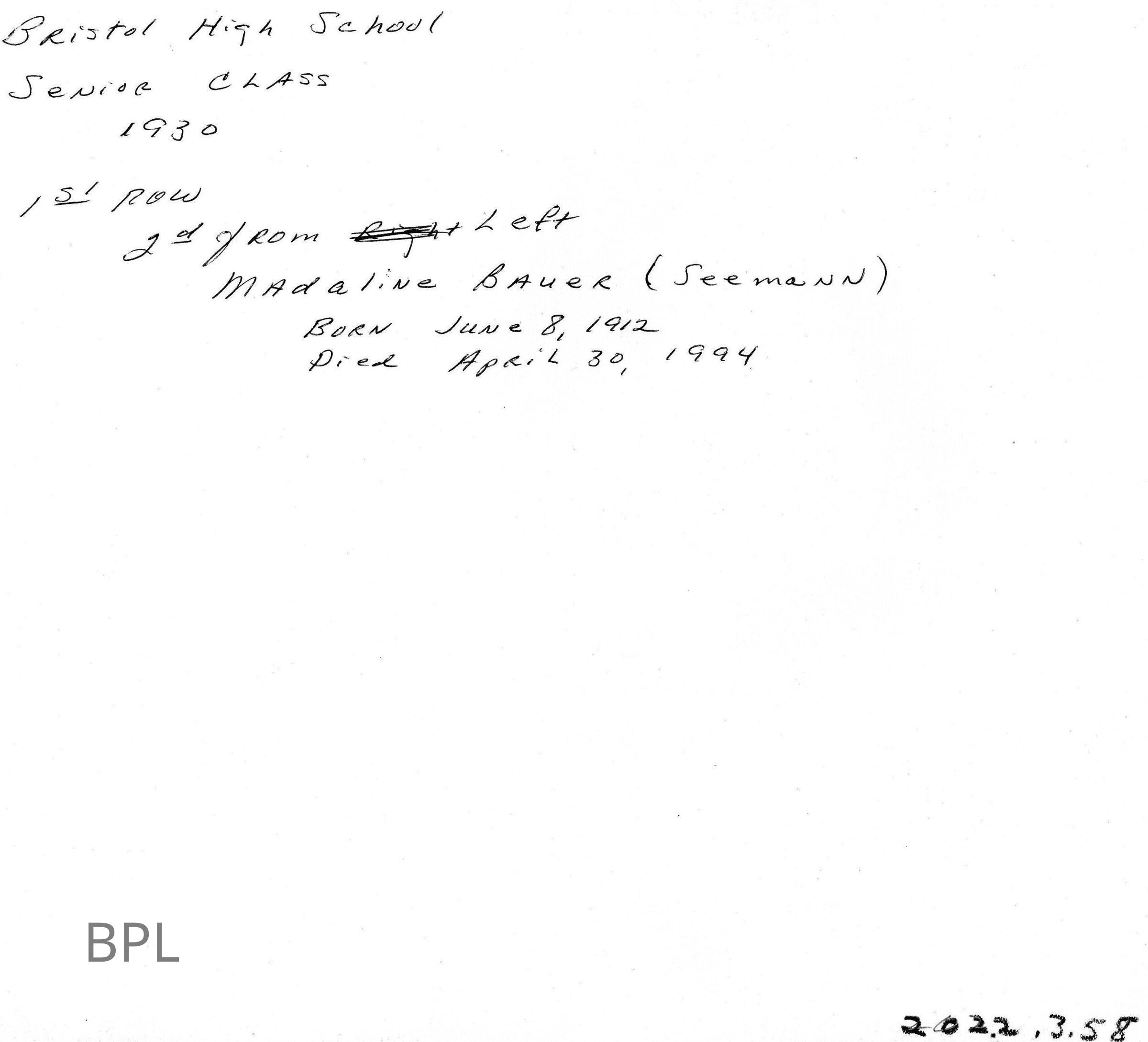 Graduation Class of 1930, Bristol High SchoolEntry/Object ID
