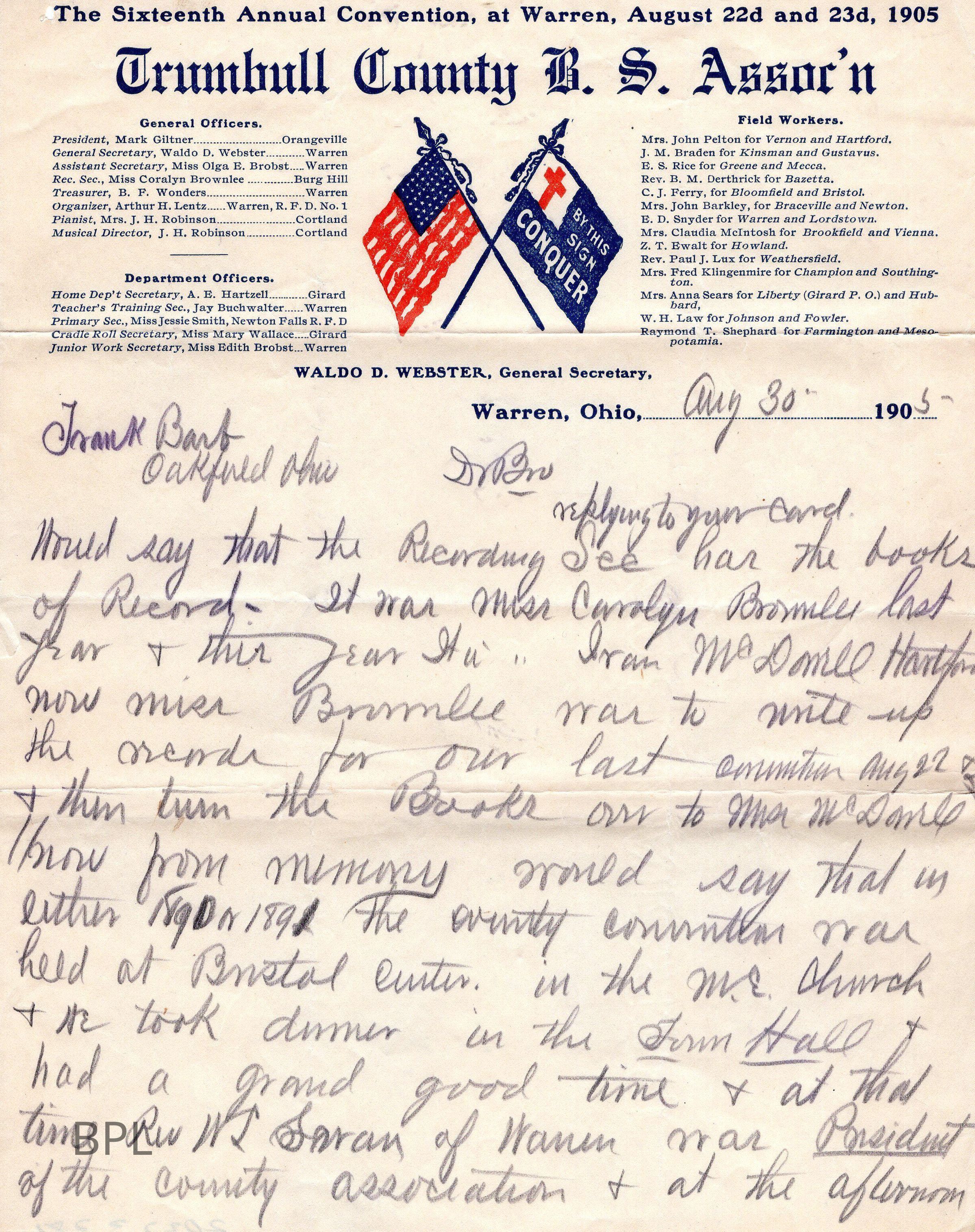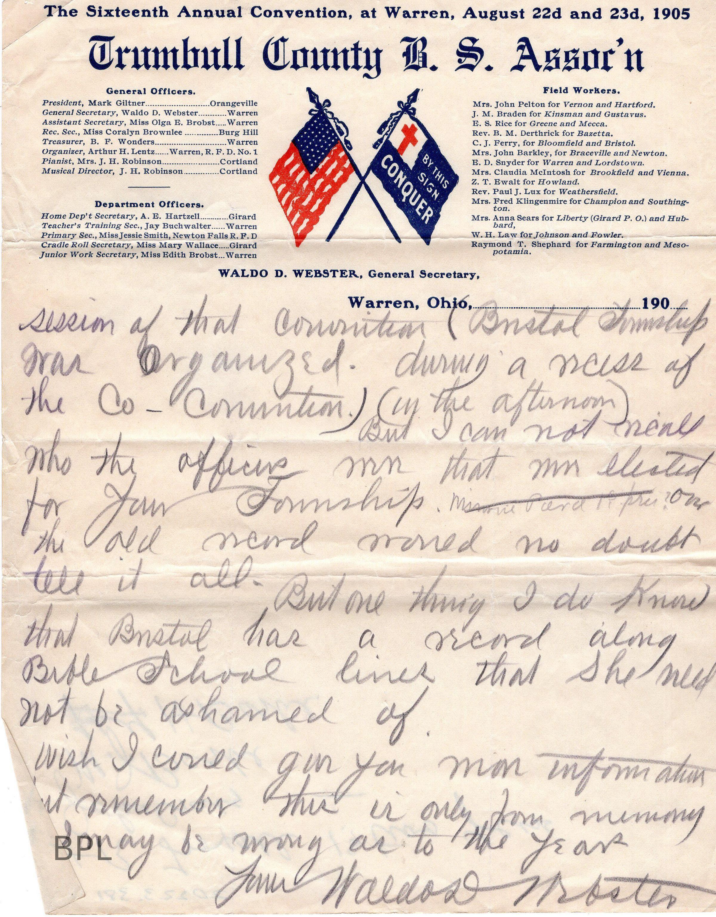 Notes of history of Bristolville, Ohio Sunday School/Bible School.Cataloged By