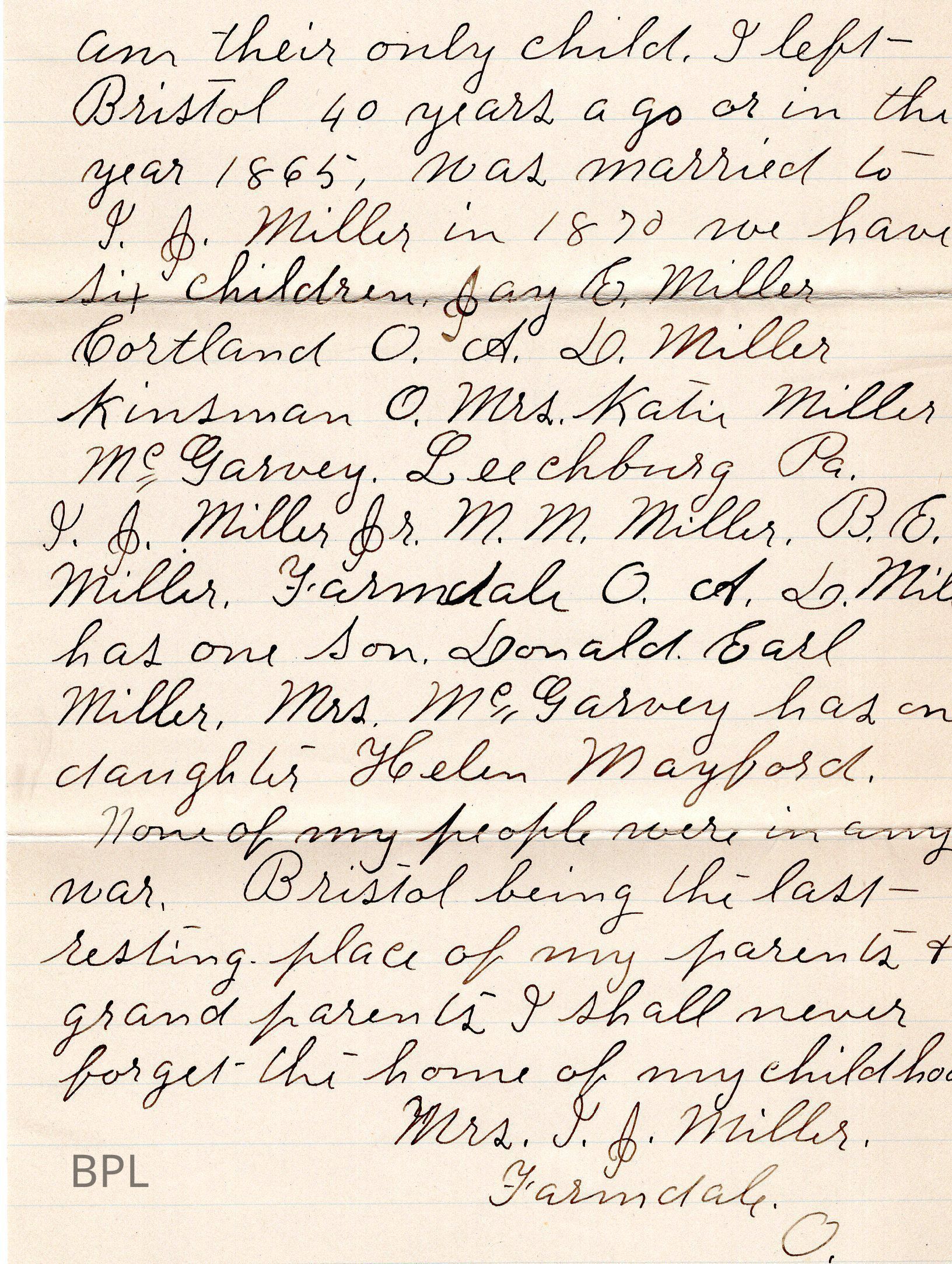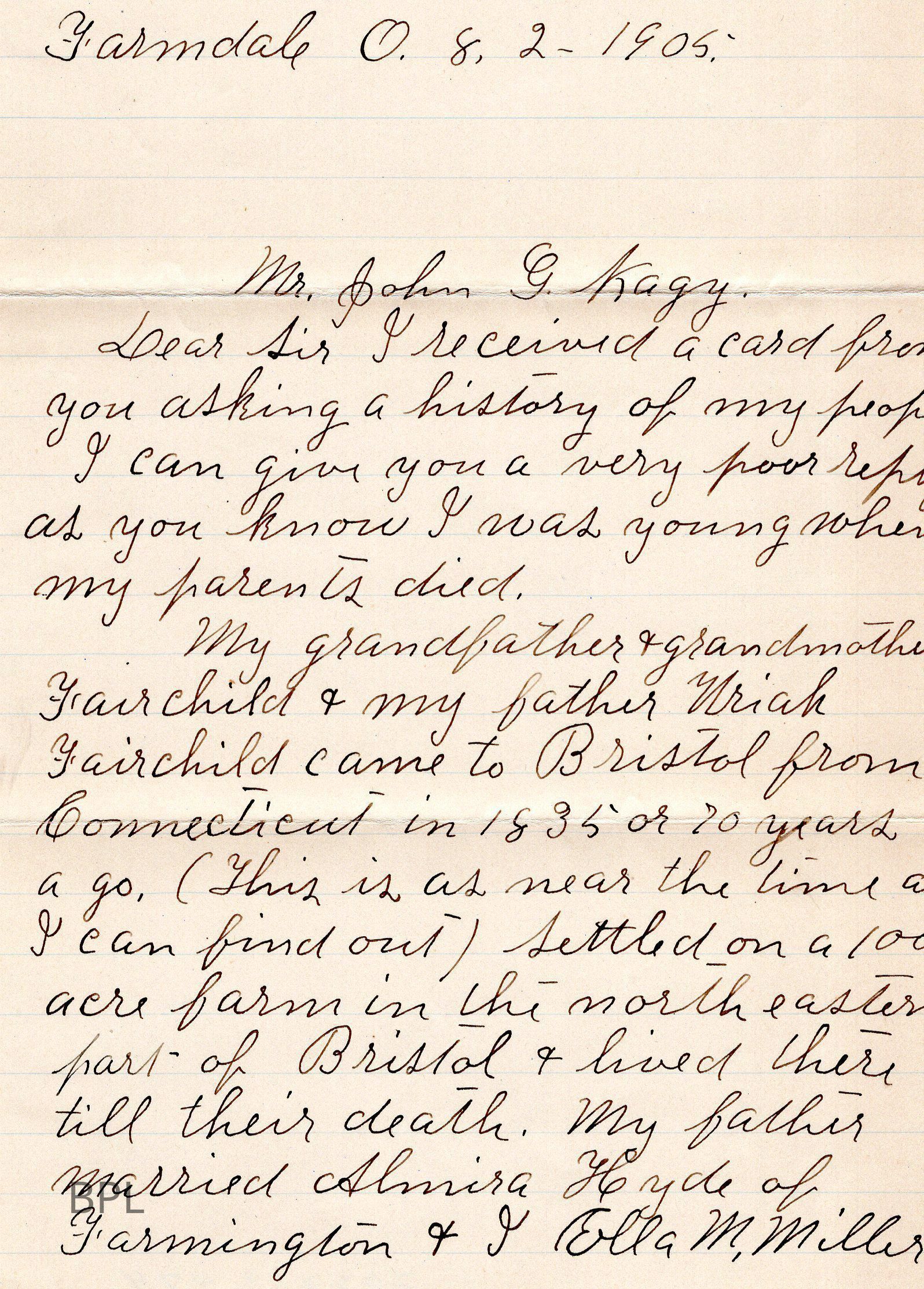 Letter from Ella M. Miller to John g. Kagy August 2, 1905, regarding Uriah Fairchild HistoryCataloged By