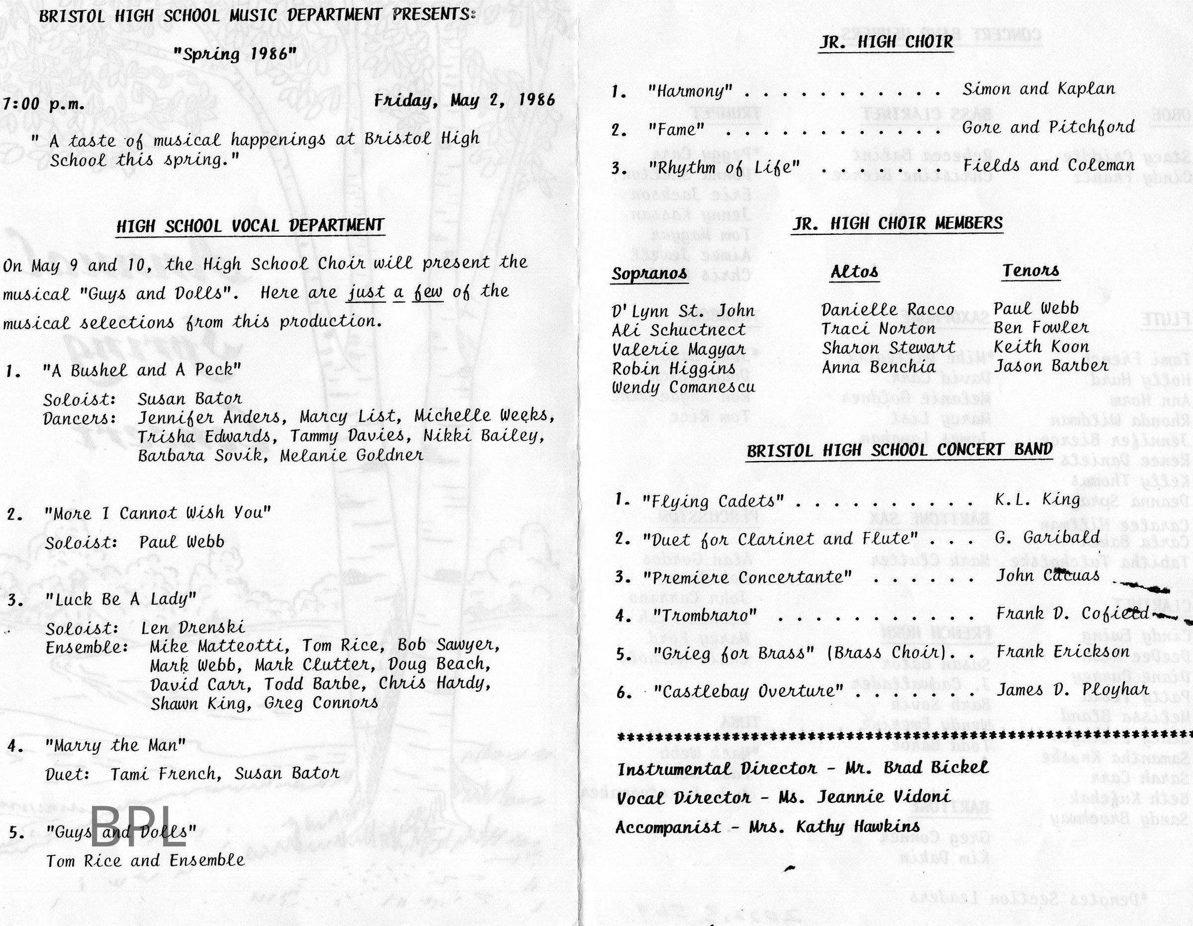 Program, May2, 1986 Bristol High School Spring ConcertCataloged By