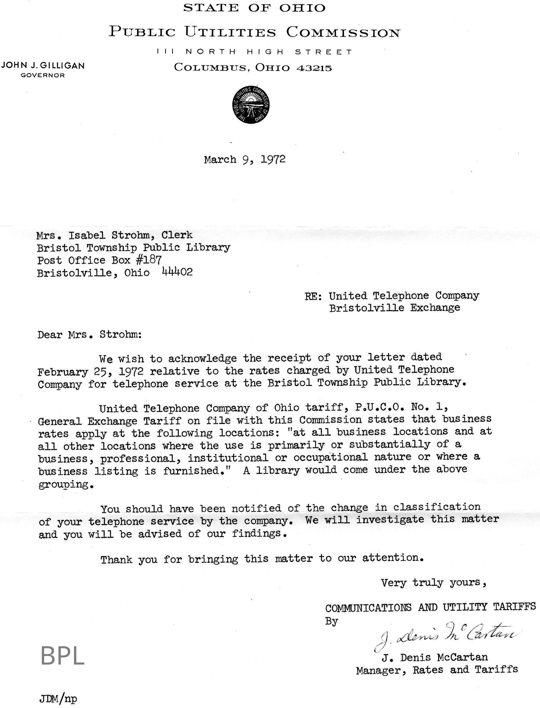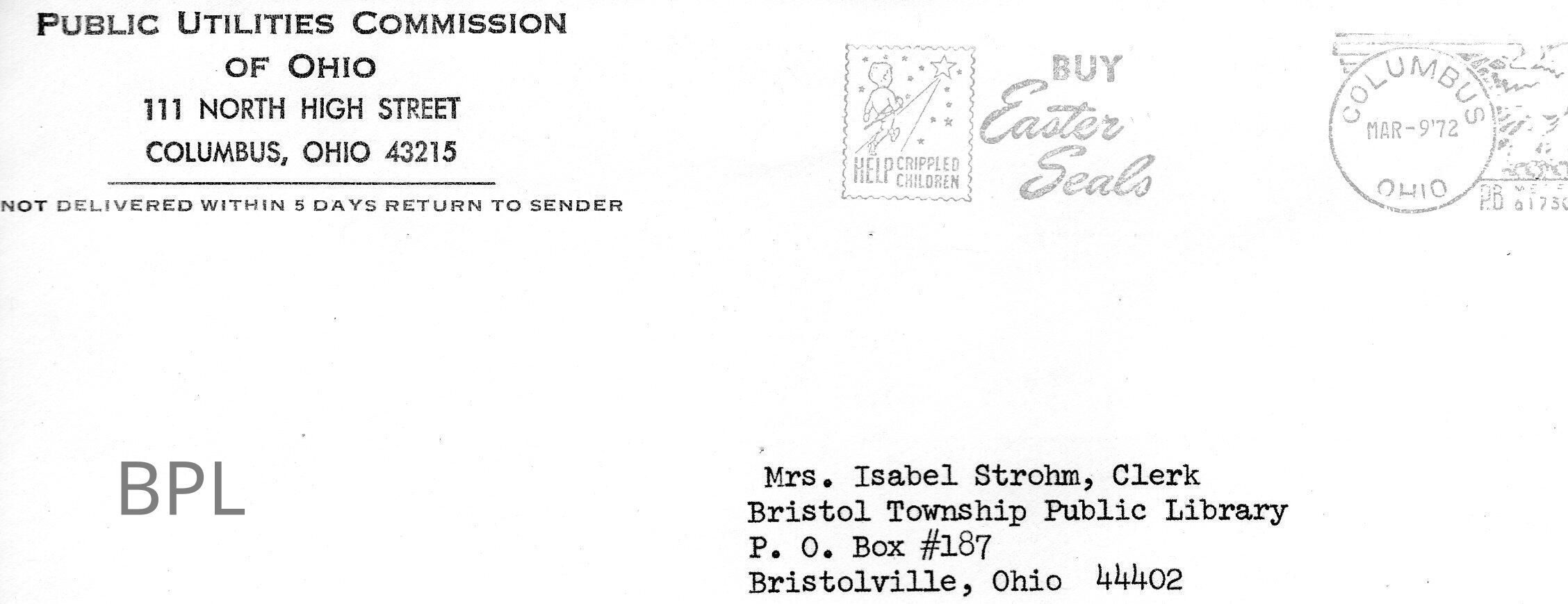 Envelope and Letter to Isabel Strohm, clerk of Bristol Public Library from Public Utilities Commission, State of Ohio regarding dispute with United Telephone Company of Ohio, March 9, 1972.Cataloged By