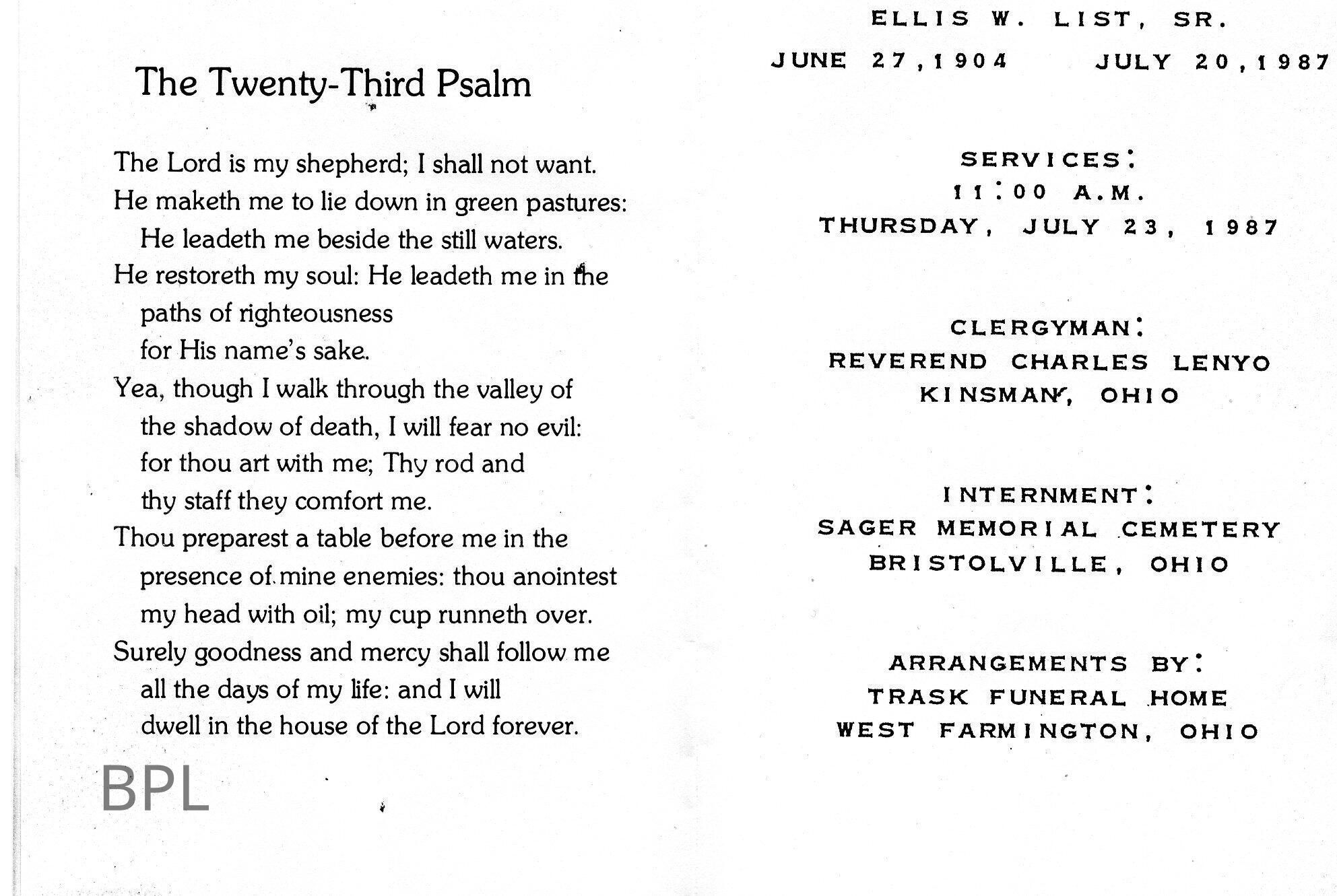 Memorial program for Dr. Ellis W. List Sr., July 23, 1987Cataloged By