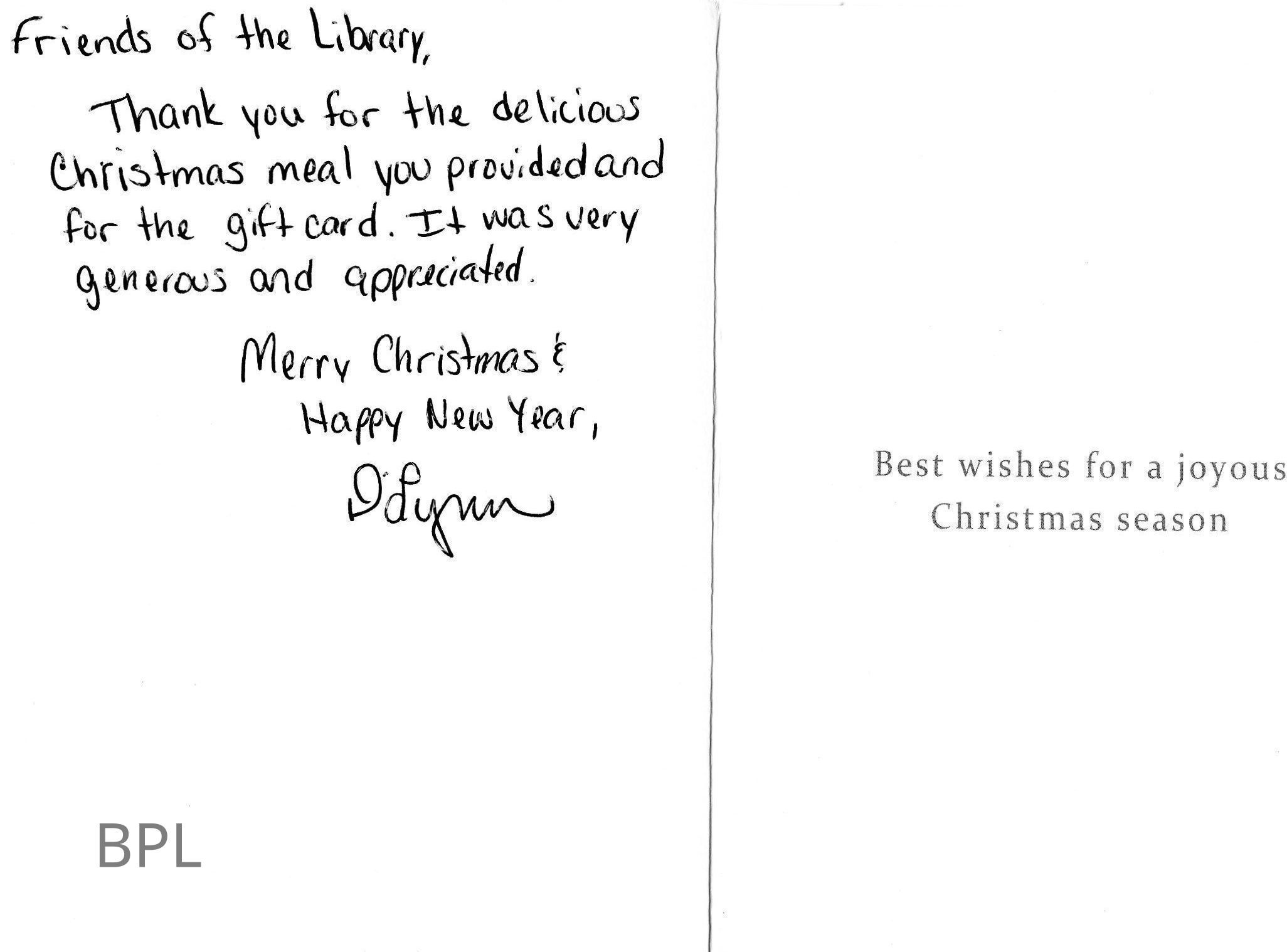 Thank You Card to Friends of Bristol Public Library from Staff Member D'Lynn Johnson for Christmas Lunch and Gift CardCataloged By