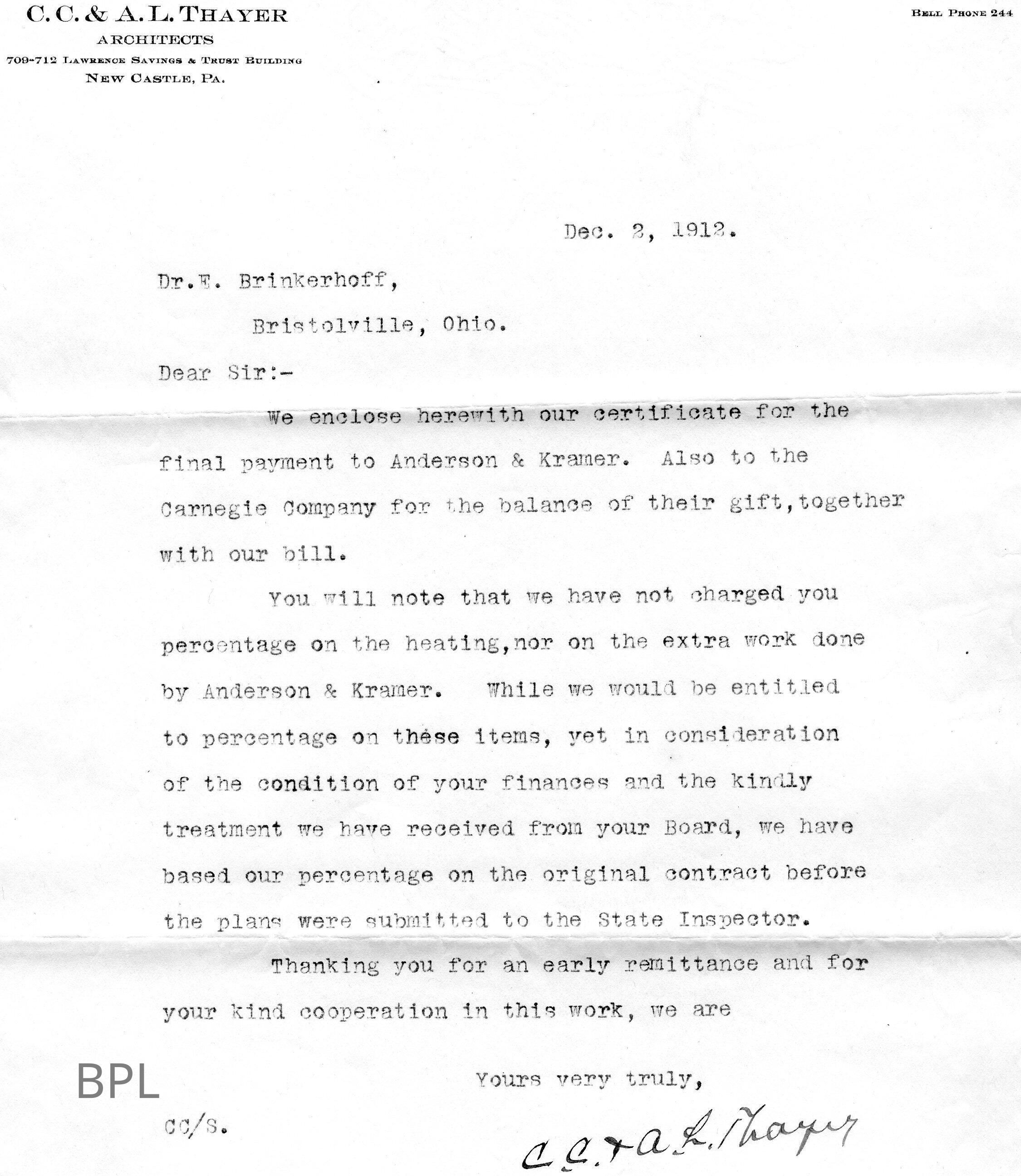 Letter from C.C. and A.L. Thayer to Dr. E. Brinkerhoff of enclosed certificate of final payment to Anderson and Anderson and Carnegie Company for balance of their gift with our bill. (No certificate found in archives) Also stating they took no percentage on the items due to condition of Bristol's finances and kind treatment they received from Board. December 2, 1912.Cataloged By