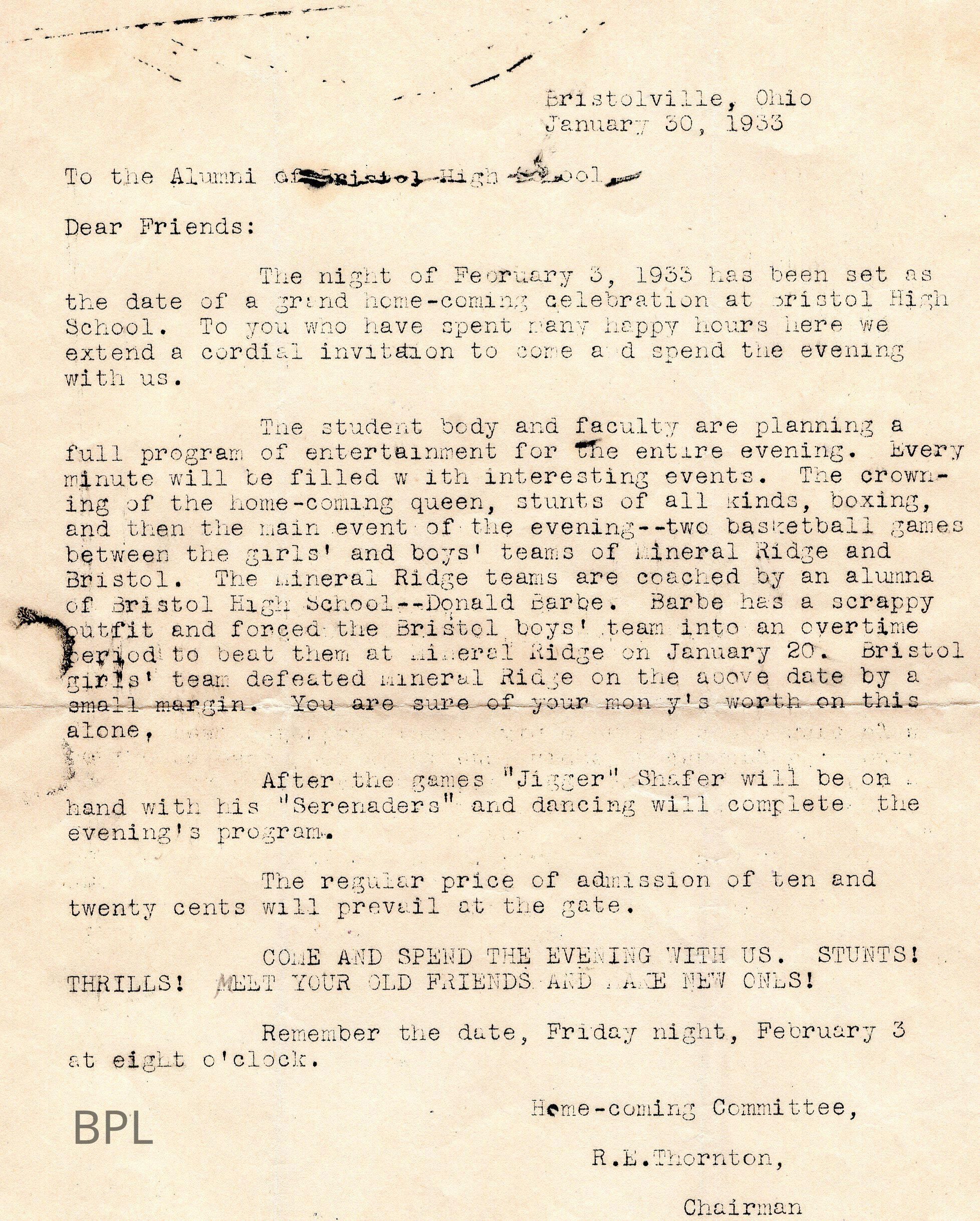 Letter to Bristol School Alumni invitation for Homecoming February 3, 1933Cataloged By