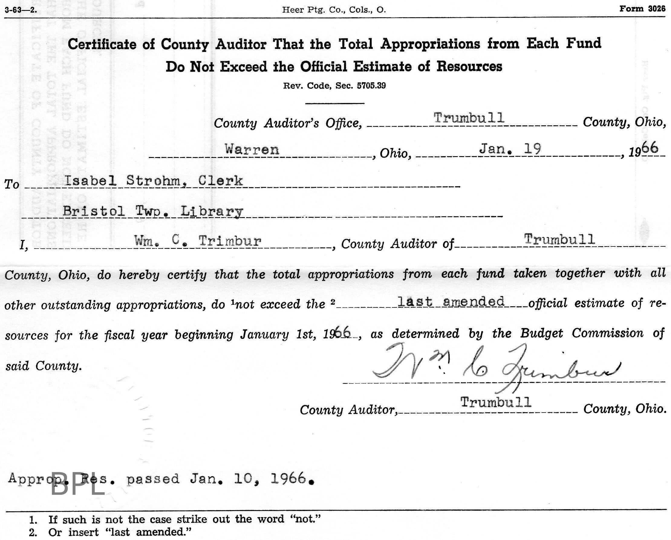 Letter and certificate from Trumbull County, Ohio Auditor to clerk Isabel Strohm noting funding for Bristol Township Library, for 1966 for $10,000.00Cataloged By
