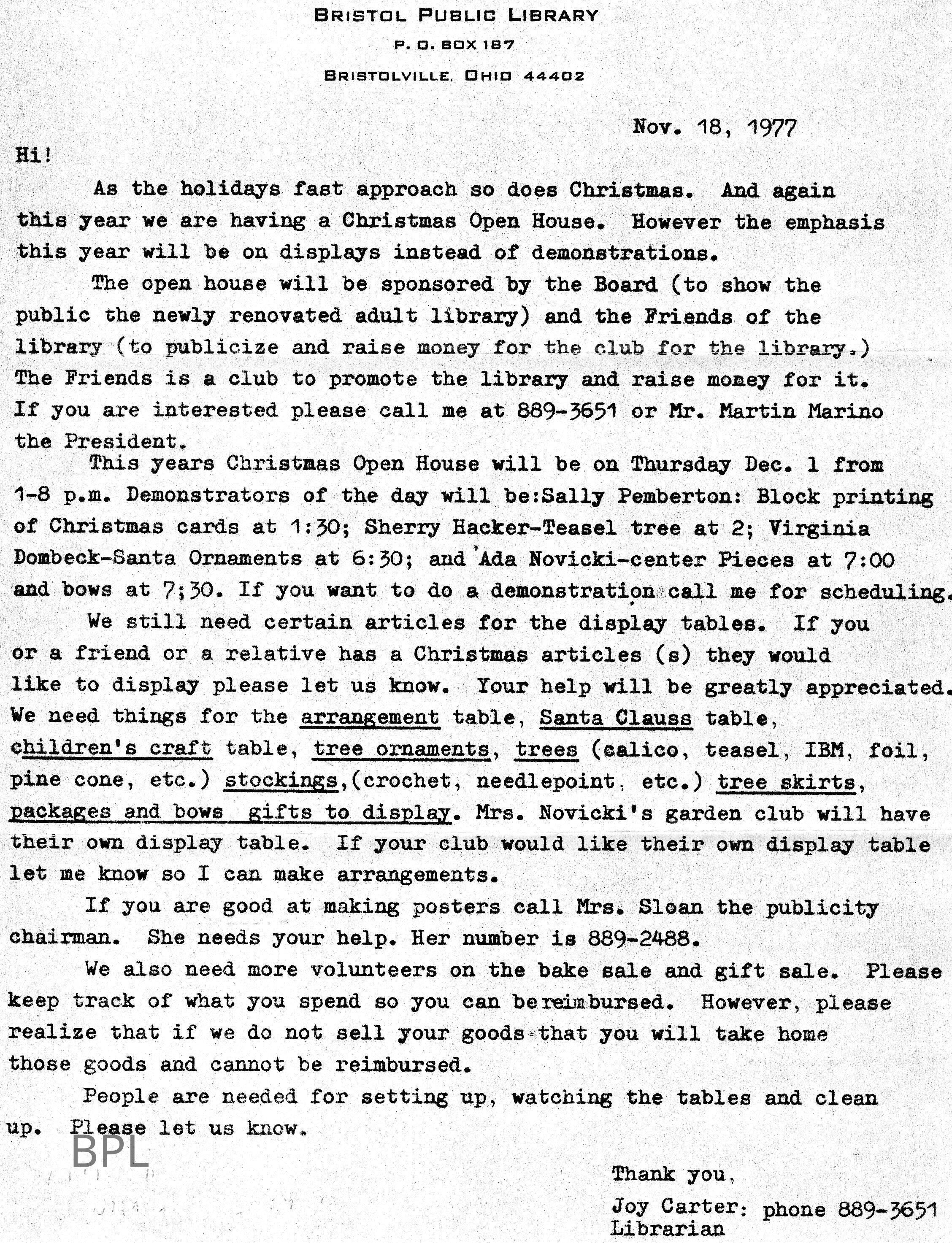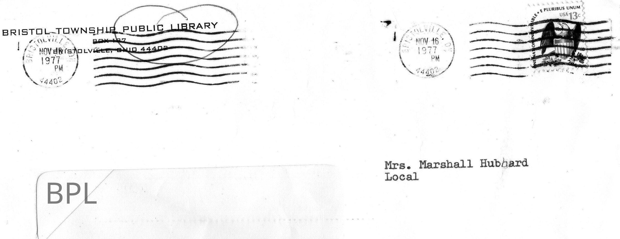 Envelope and letter to Mrs. Marshall Hubbard from Bristol Public Librarian, Joy Carter, November 18, 1977 about Christmas Open House for the library.Cataloged By